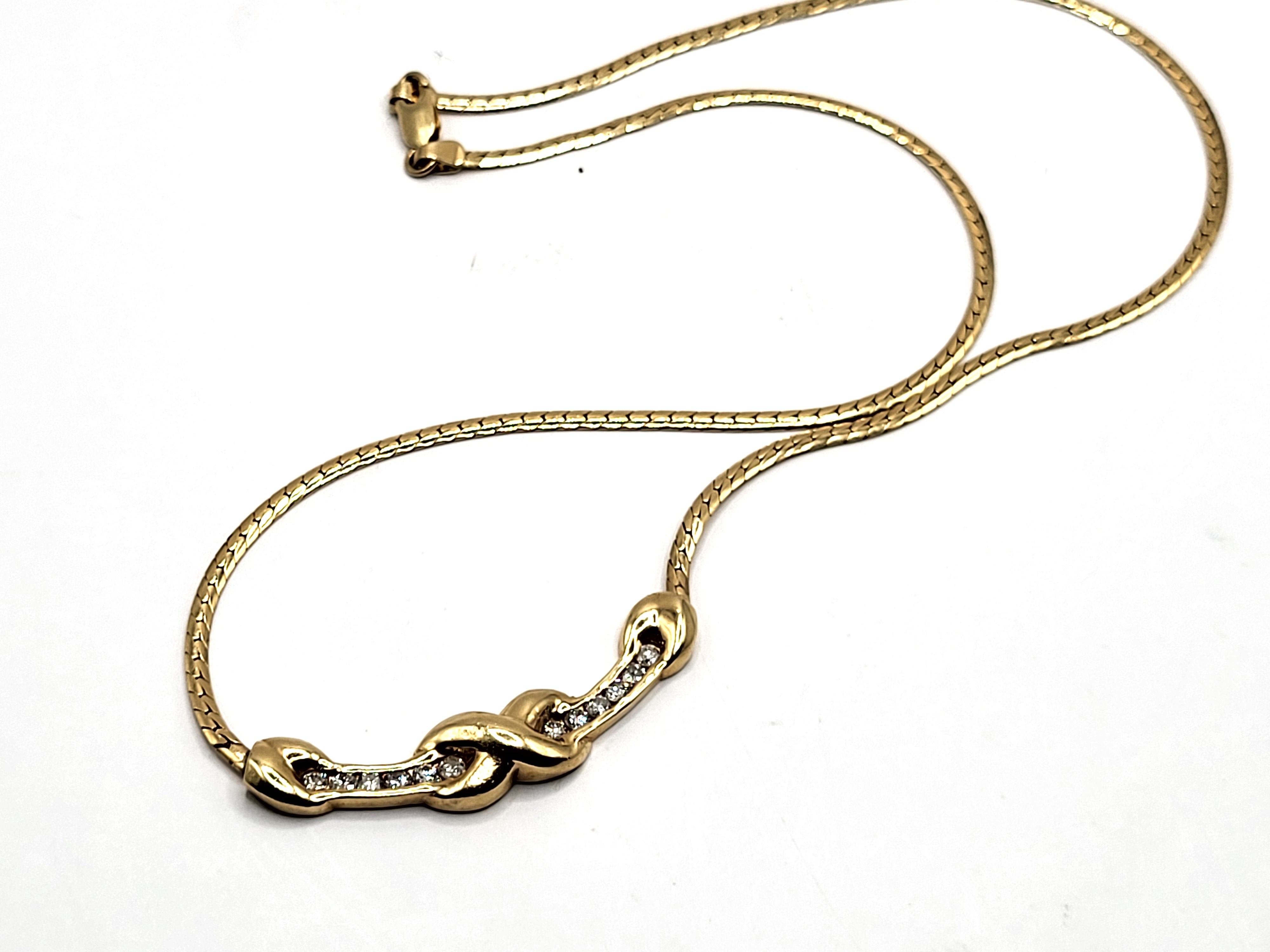This is a very elegant 14 karat yellow gold necklace that features .66 carats total weight round, brilliant-cut, G-H color, SI2-I1 clarity diamonds along the curved bar with the "X" kiss. The bar is stationary/static on the flat cobra chain. The entire necklace is 17" long with a spring ring. . Admin: G11241/12tit