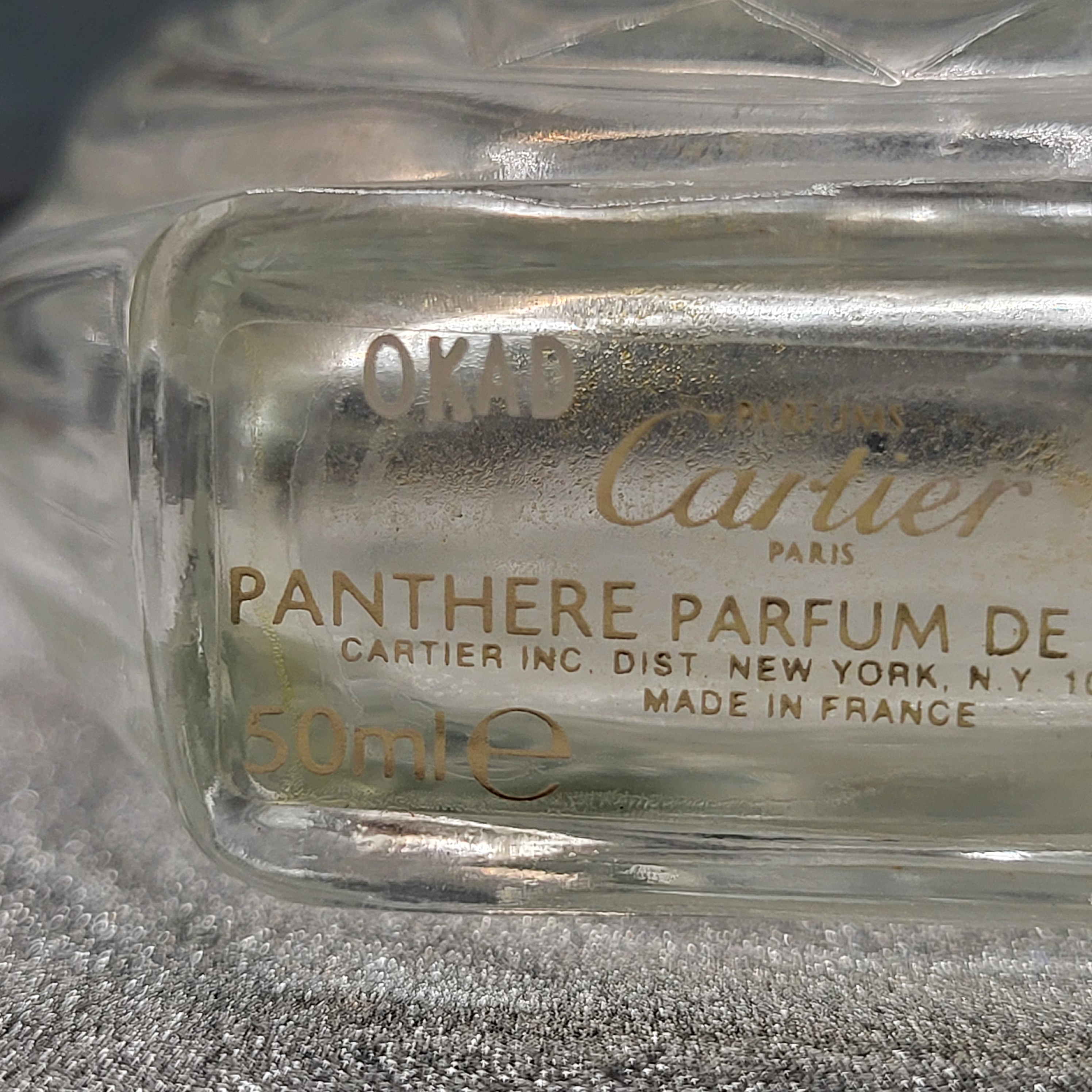 This is an authentic empty decanter-style bottle that once held   mL of Eau de Toilette Pantere’ by Cartier of France.  The glass decanter-style bottle is desired by collectors for the iconic Cartier panther on the stopper top, which is in excellent condition. The date code on the bottom indicates this bottle was made in 2000 or 2010. The original owner states it was purchased approximately in 2002. AdminCode: CAJ1/ne