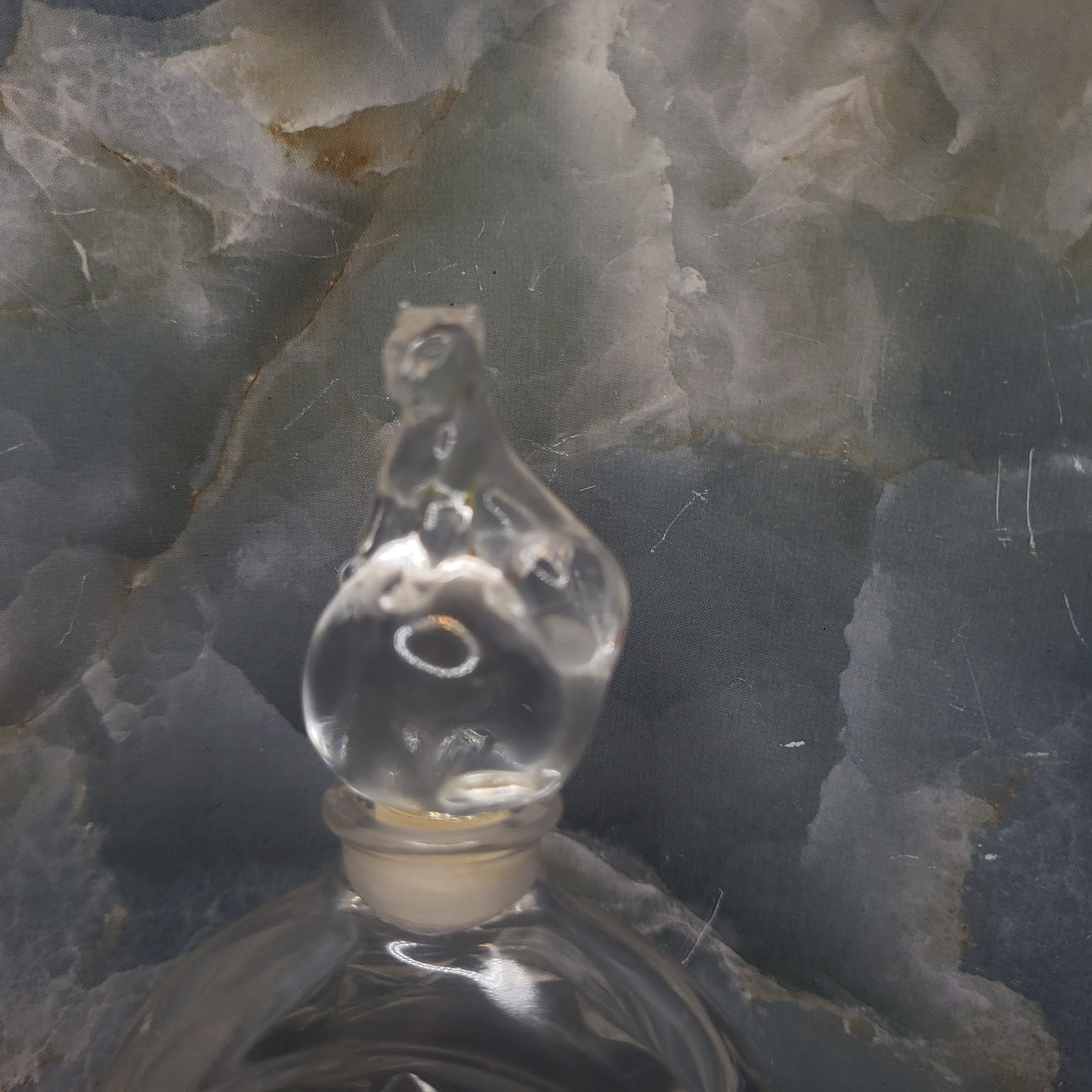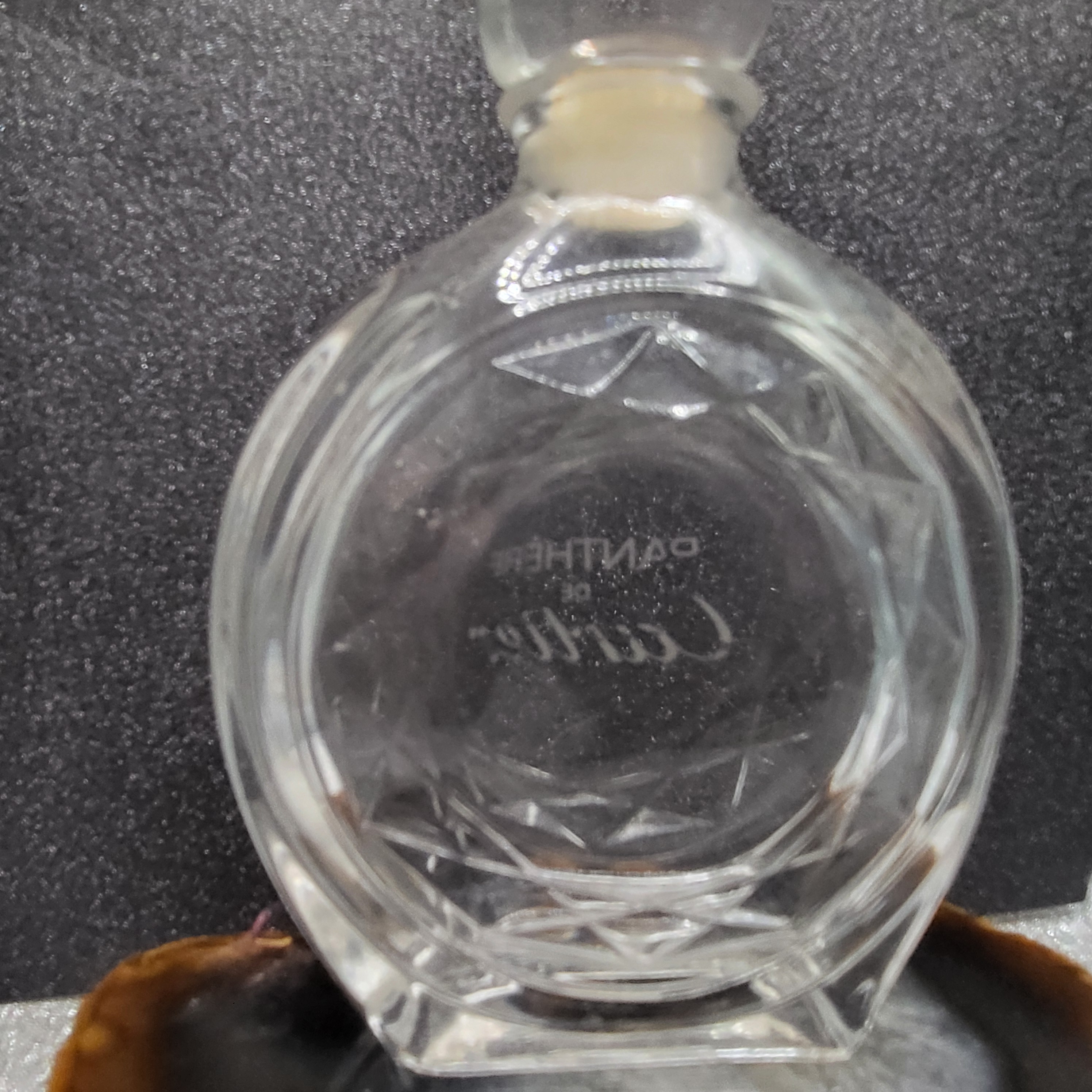This is an authentic empty decanter-style bottle that once held Eau de Toilette Pantere’ by Cartier of France. The collectible glass decanter-style bottle is topped with the iconic Cartier panther, which is in excellent condition. According to the original owner, this bottle was purchased approximately in 1992. AdminCode: CAJ1/ne