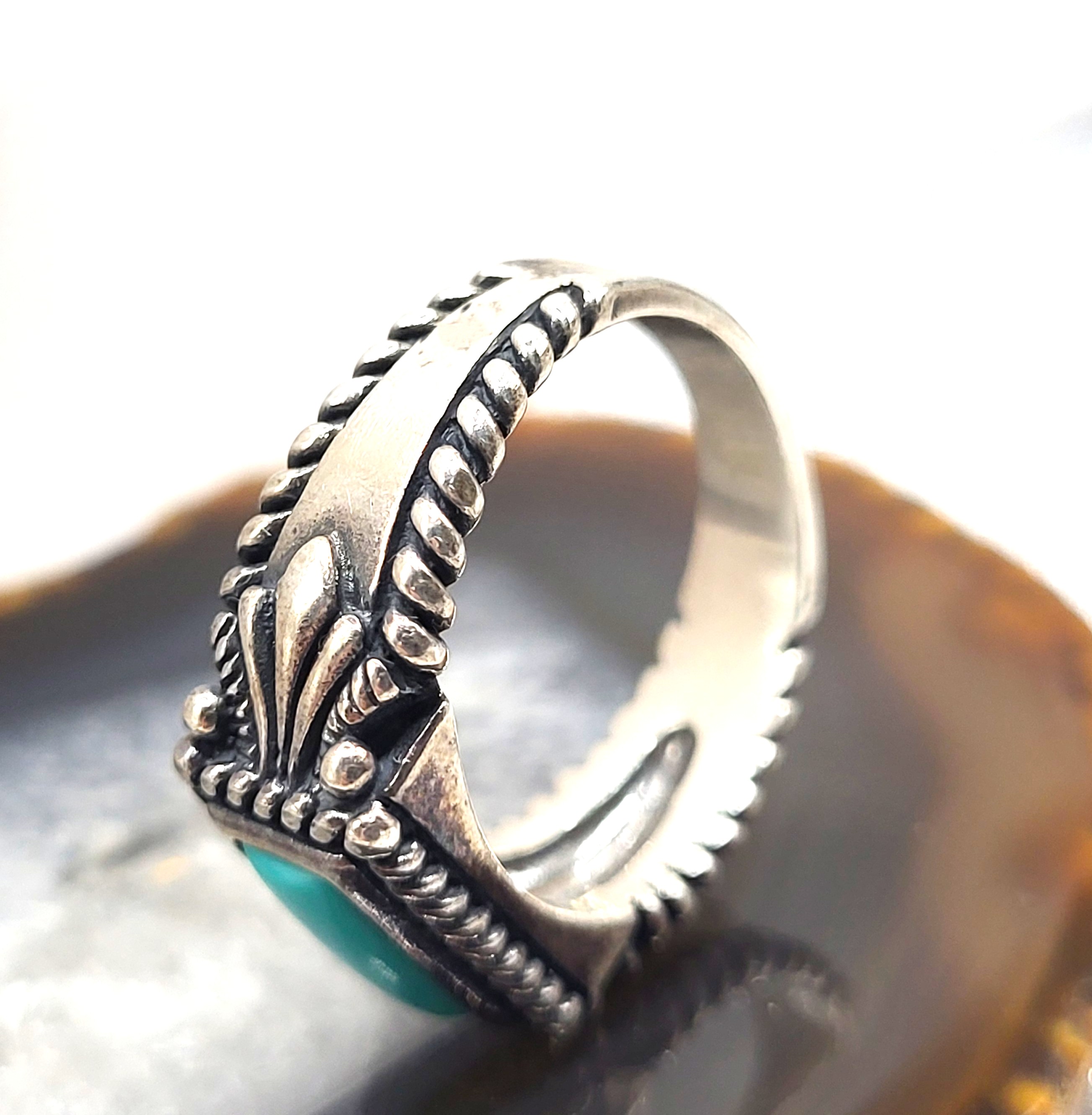 This sterling silver ring design precedes the ‘stacker’ style ring by decades, but it is so simply sophisticated and modern, it may just as well be called a stacker ring. Cast in sterling silver and set with an approximate 8mm x 3mm elongated cabochon of genuine* turquoise, the ring is subtly decorated with iconic Southwestern designs. Abraided borders accentuates the turquoise and the smooth tapered shank has epaulette shoulders and twisted rope borders. The ring is US size 8. The under gallery bears the Caroly Pollock-Relios hallmark and sterling silver mark. AdminCode: 33120/16.i