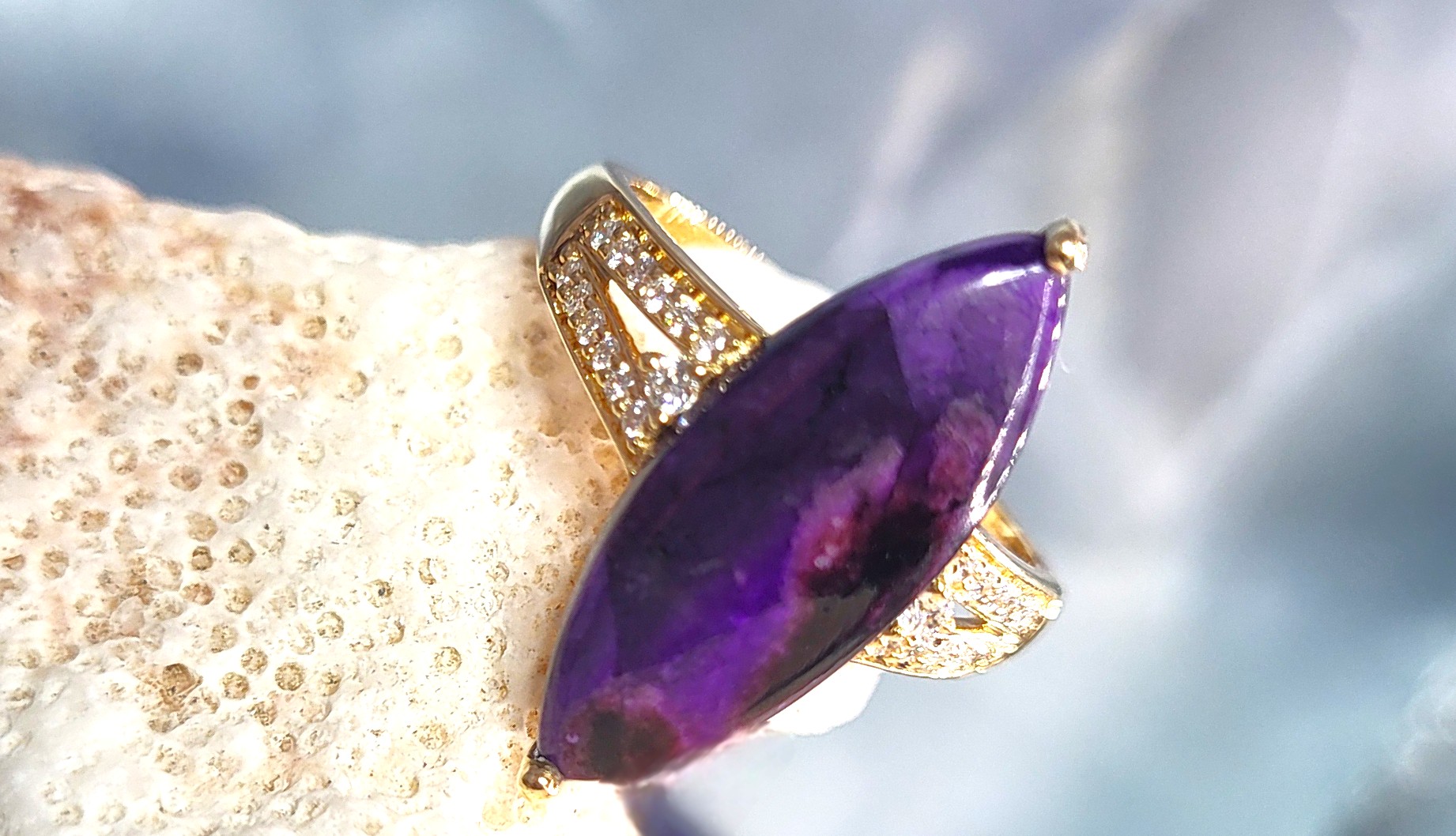 #Auction13 #SugiliteGem #NavetteRing #DiamondAccent #FineJewelry #LuxuryRing #18KGold #BidFairTreasures #CollectorGem #PurpleElegance