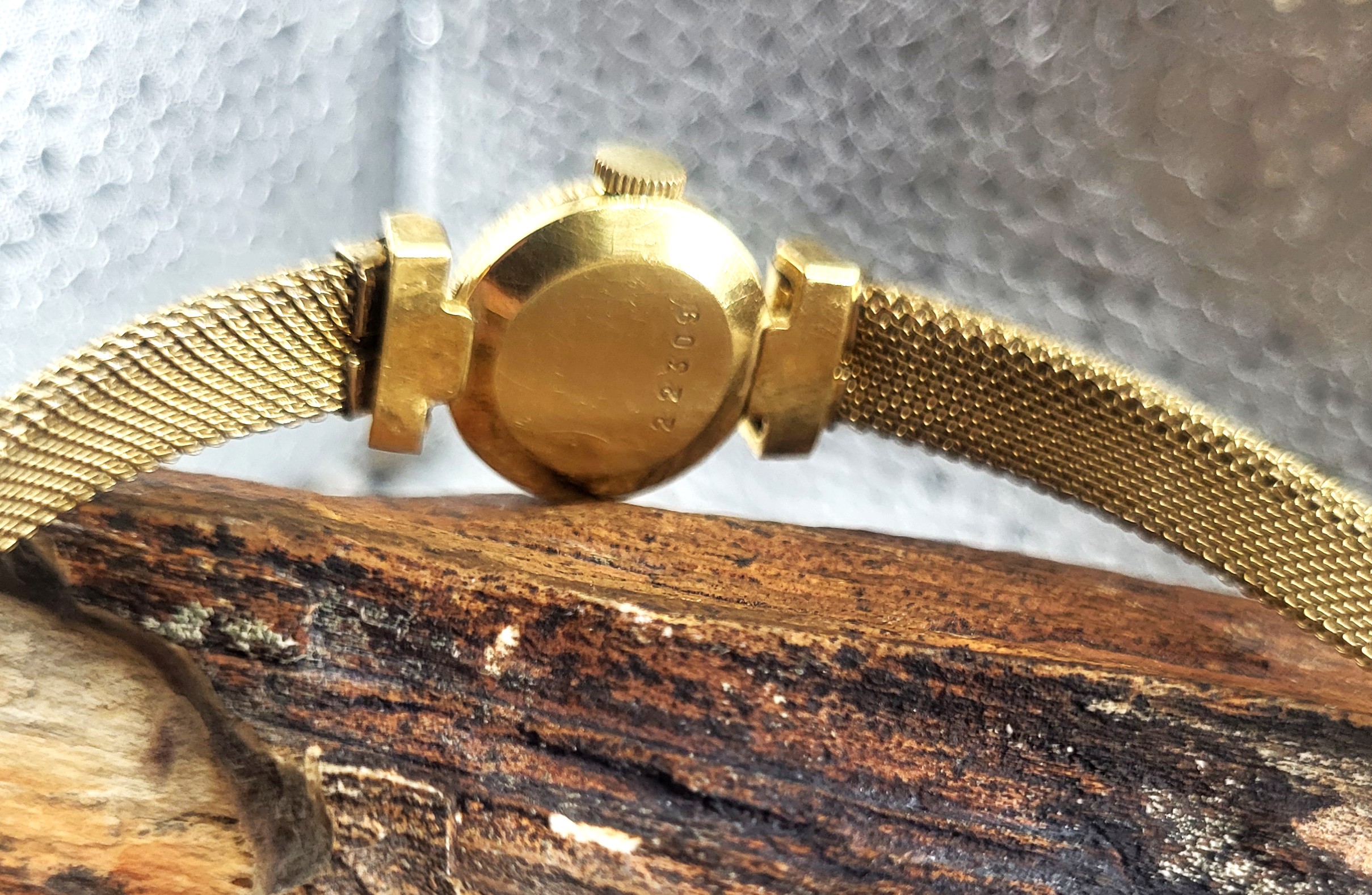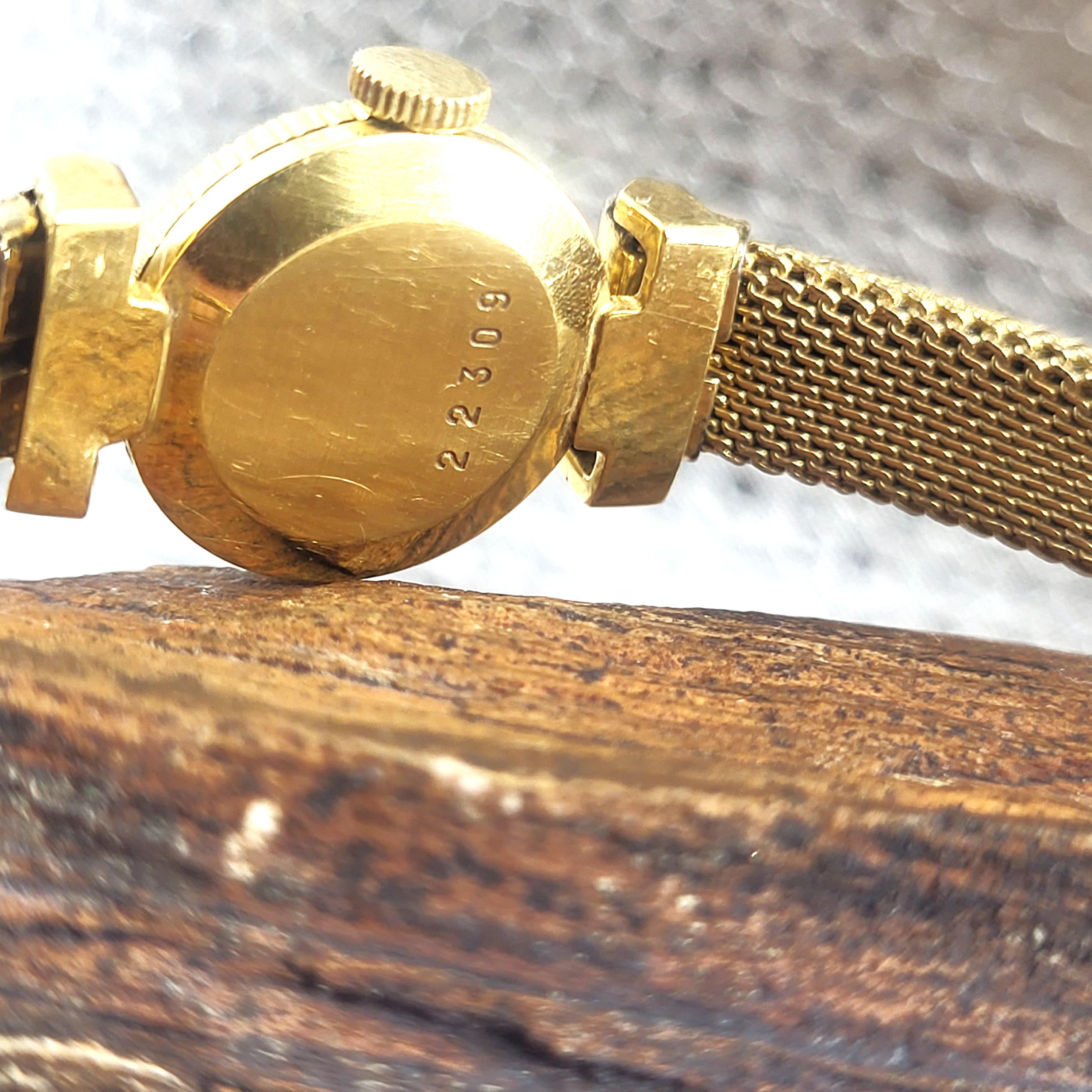 This is a wonderful example of mid-century class and style. A dainty gold-colored bracelet styled for the 1940’s and 1950’s, holds a smalll, round, wristwatch that is only 15mm in size plus the crown. The button-shaped case has a diamond-cut finish that contrasts with the smooth silver dial, where batons mark the hours. The slightly bubbled, plastic crystal is in excellent condition. The case, back, crown, kugs and dial test as 18 karat gold. The back is stamped with an identifying number. The watch runs when wound, but needs a service. AdminCode: AZM