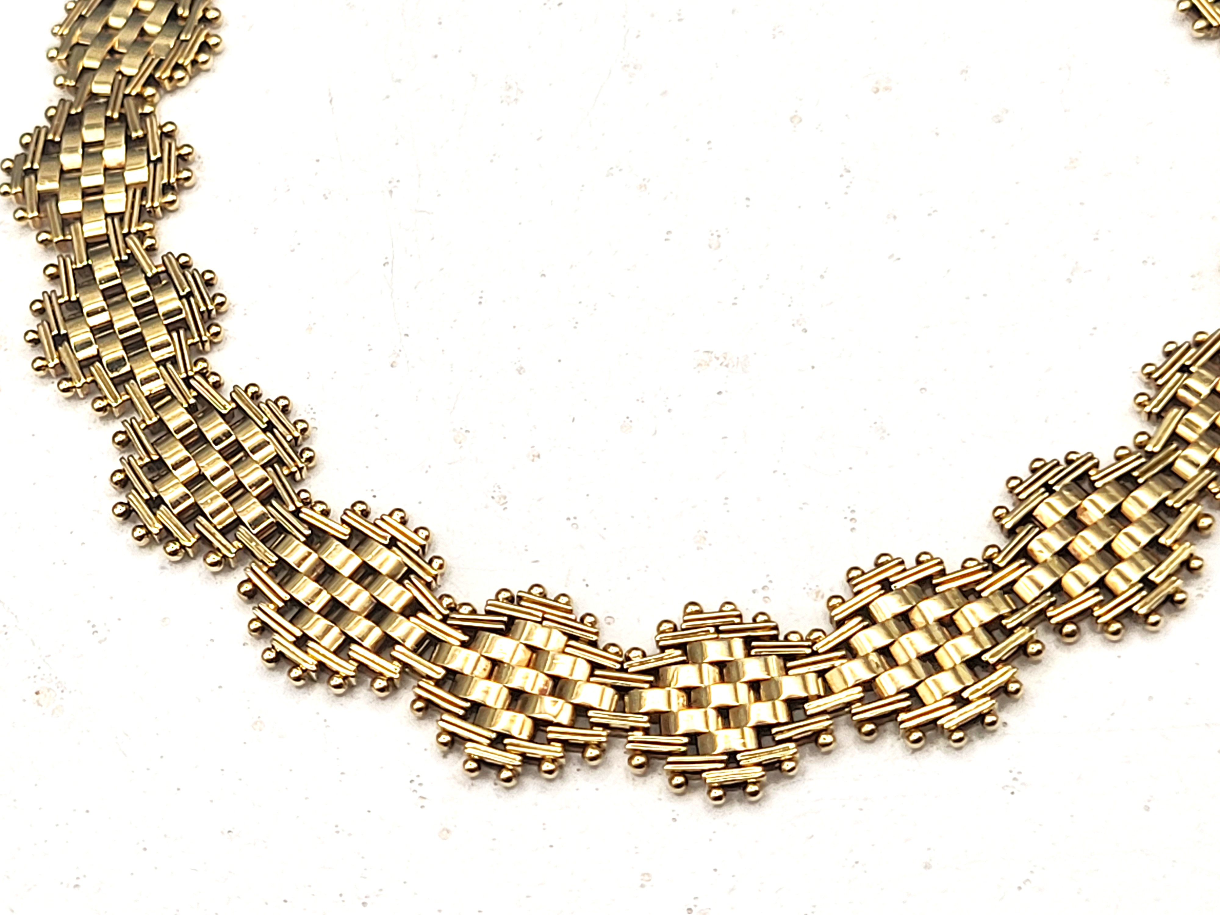 This bracelet is in very good condition and is circa 1987-88. It is 7" long and has asymmetric links of woven mesh in yellow, white, and rose gold. The bracelet is secured with a hidden box clasp and a figure 8 safety clip. Admin: TC4.25epr.