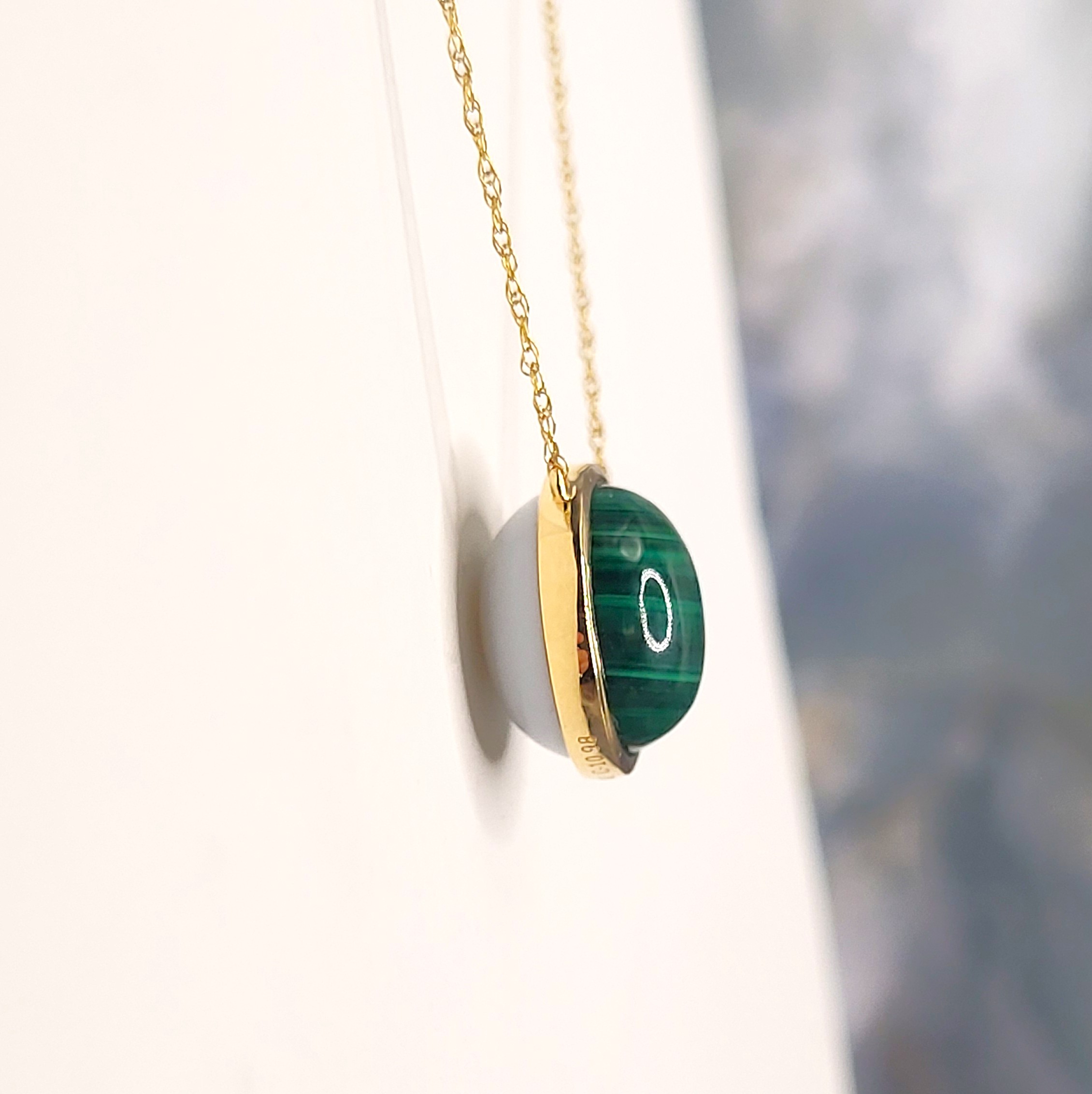 A stylish study in contrast and versatility, this 18" fine rope chain necklace features a reversible pendant showcasing half-round cabochons of lush green malachite and luminous white opal. Each stone is set in a wide bezel, offering a bold yet refined silhouette. The pendant remains stationary on the chain—9" on each side—creating a balanced, symmetrical drape. Finished with a classic spring ring clasp. Total weight: 4.2g. Admin Code: 6282/36.nrr