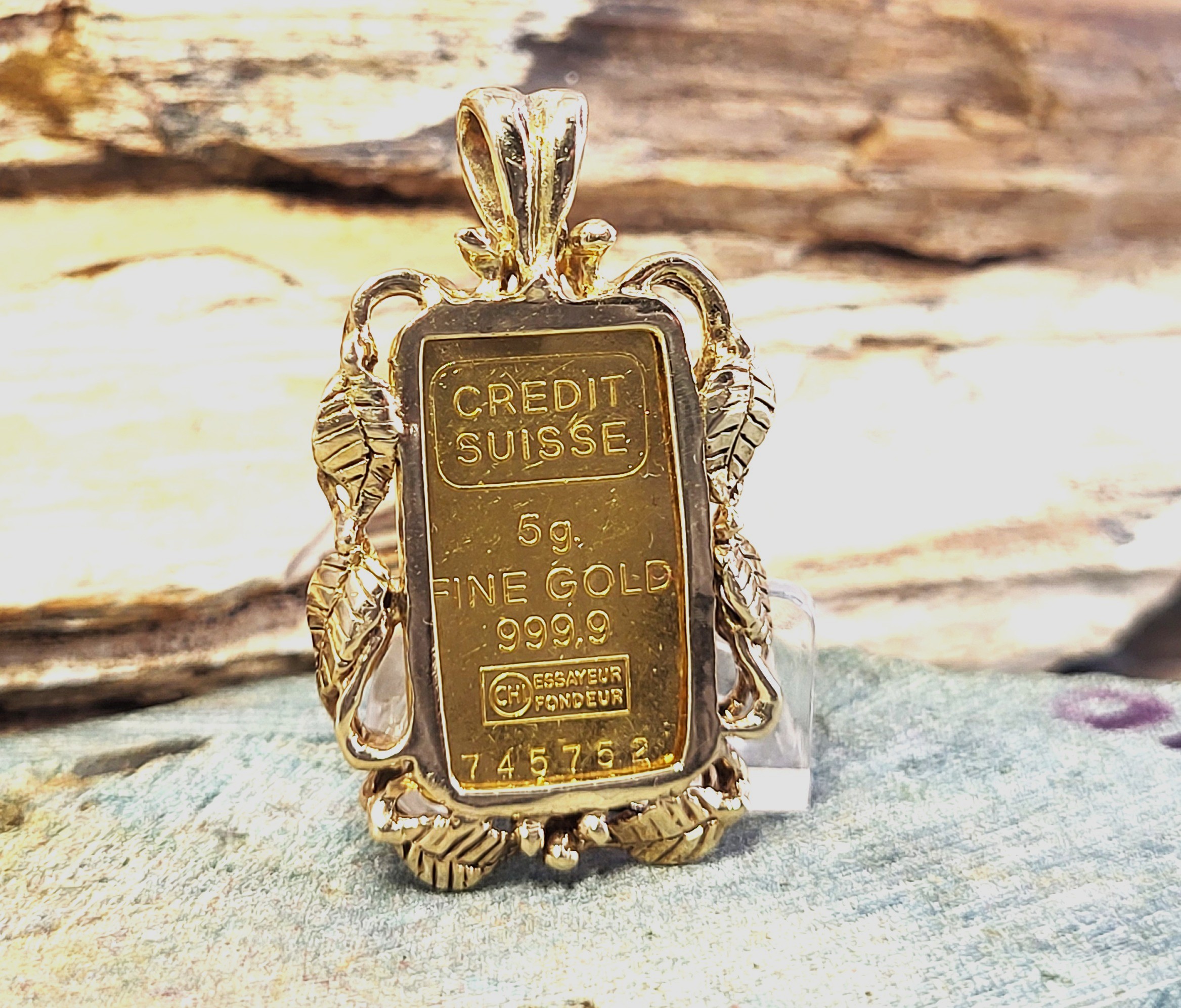 The Credit Suisse is one of the most recognizable gold bars in the world. The sleek rectangular shape of the bar, along with the status symbol brand, has made wearing it in jewelry popular for at nearly 50 years.