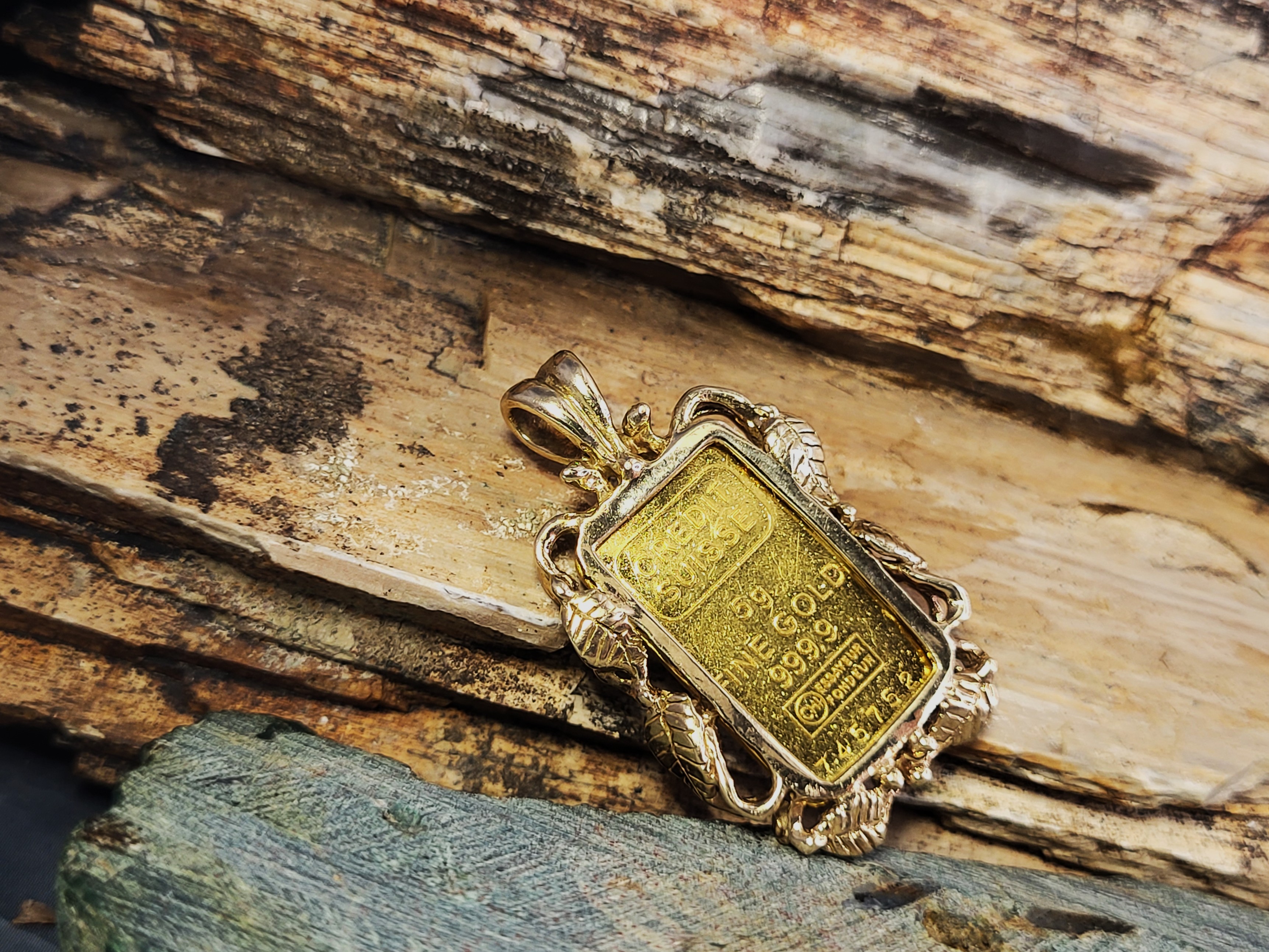 ((Pendant is likely post-1979, when Valcambi began refining the gold. The frame appears to be hand-crafted in a leaf design and a rabbit ears bail. The bail can accommodate an approximate 3mm chain. The serial number of the bar is present on the front of the bar. Although not very noticeable, close inspection shows the bar has bent a bit over the years, due to wear.)) AdminCode: AZM4/6.63-322