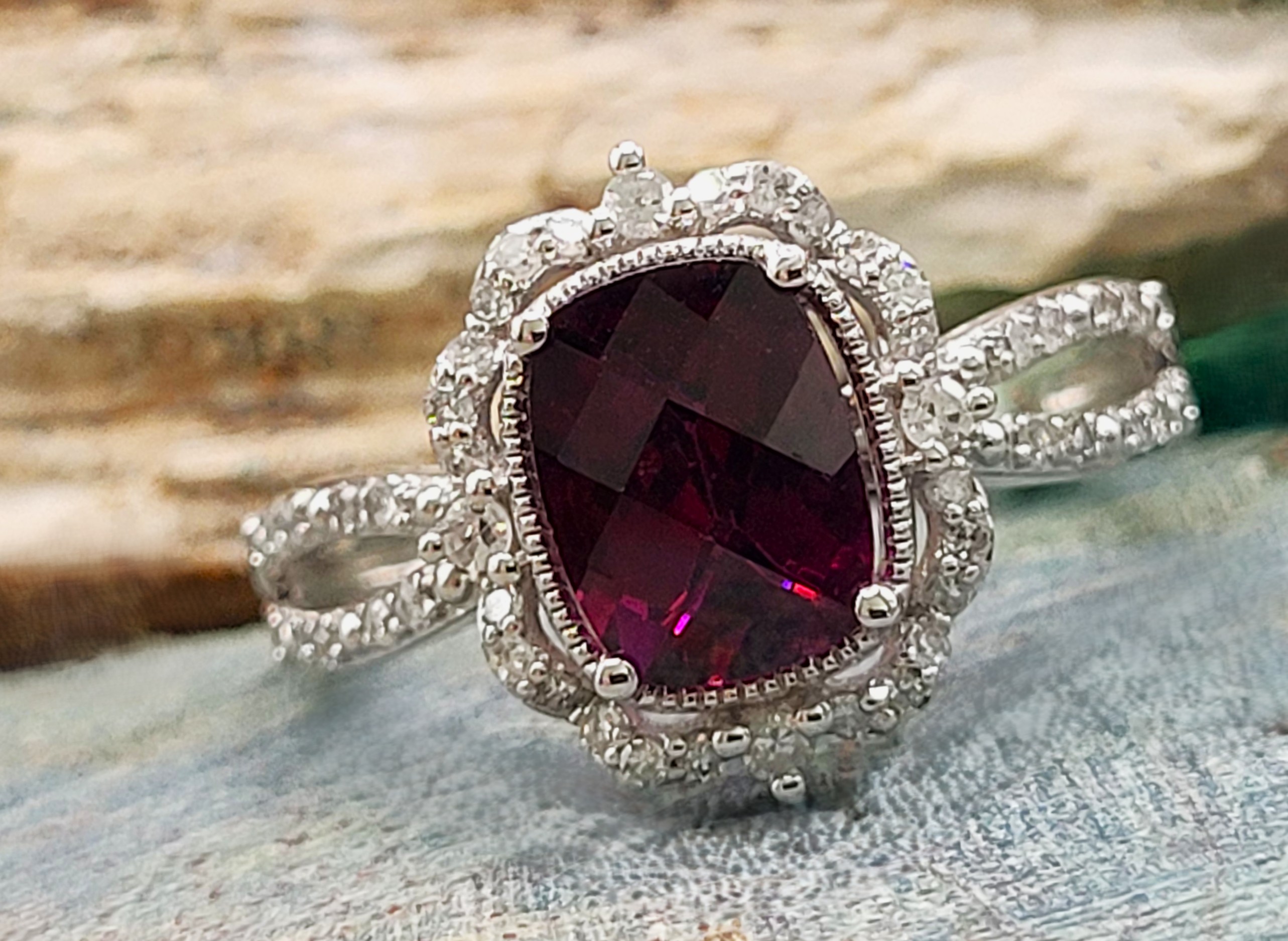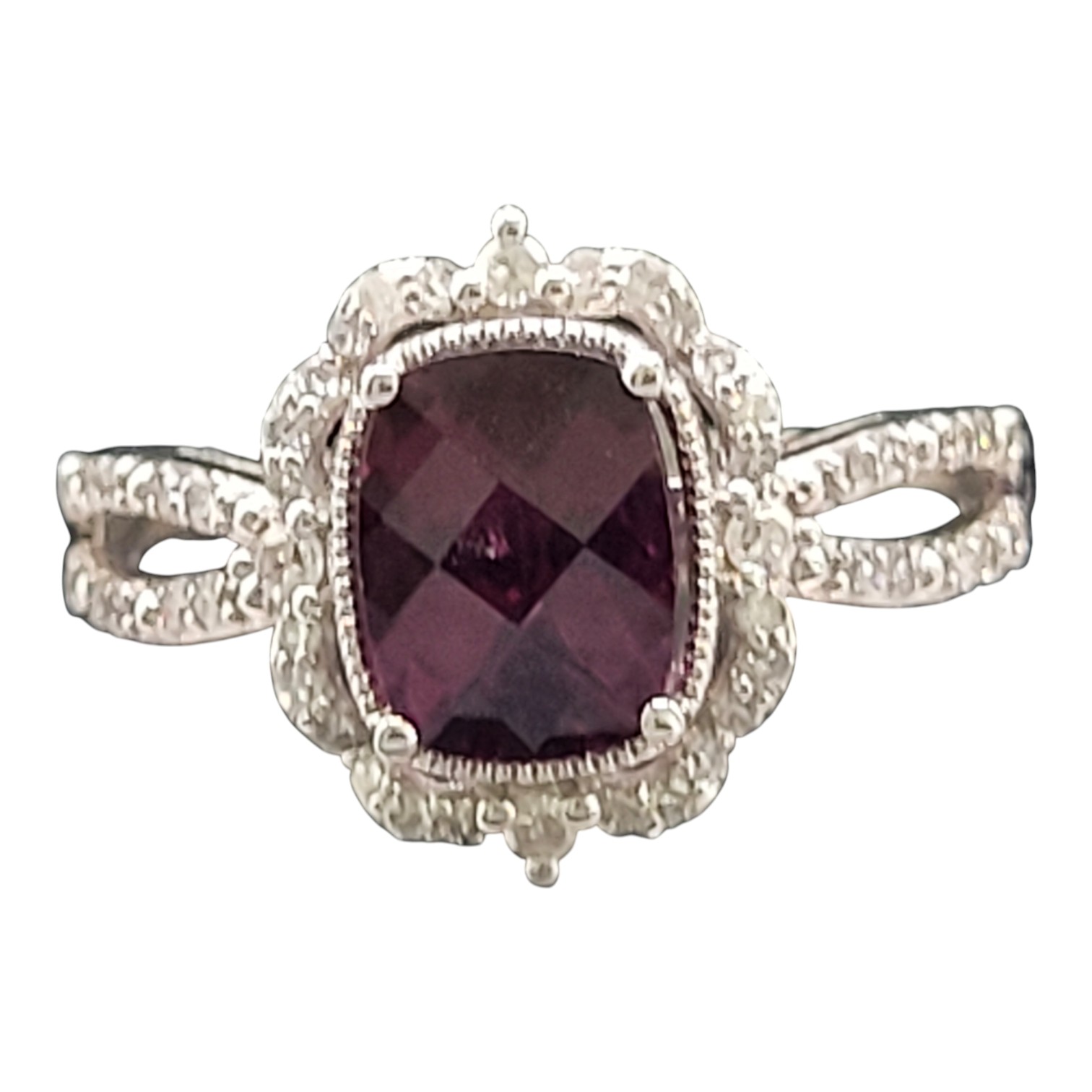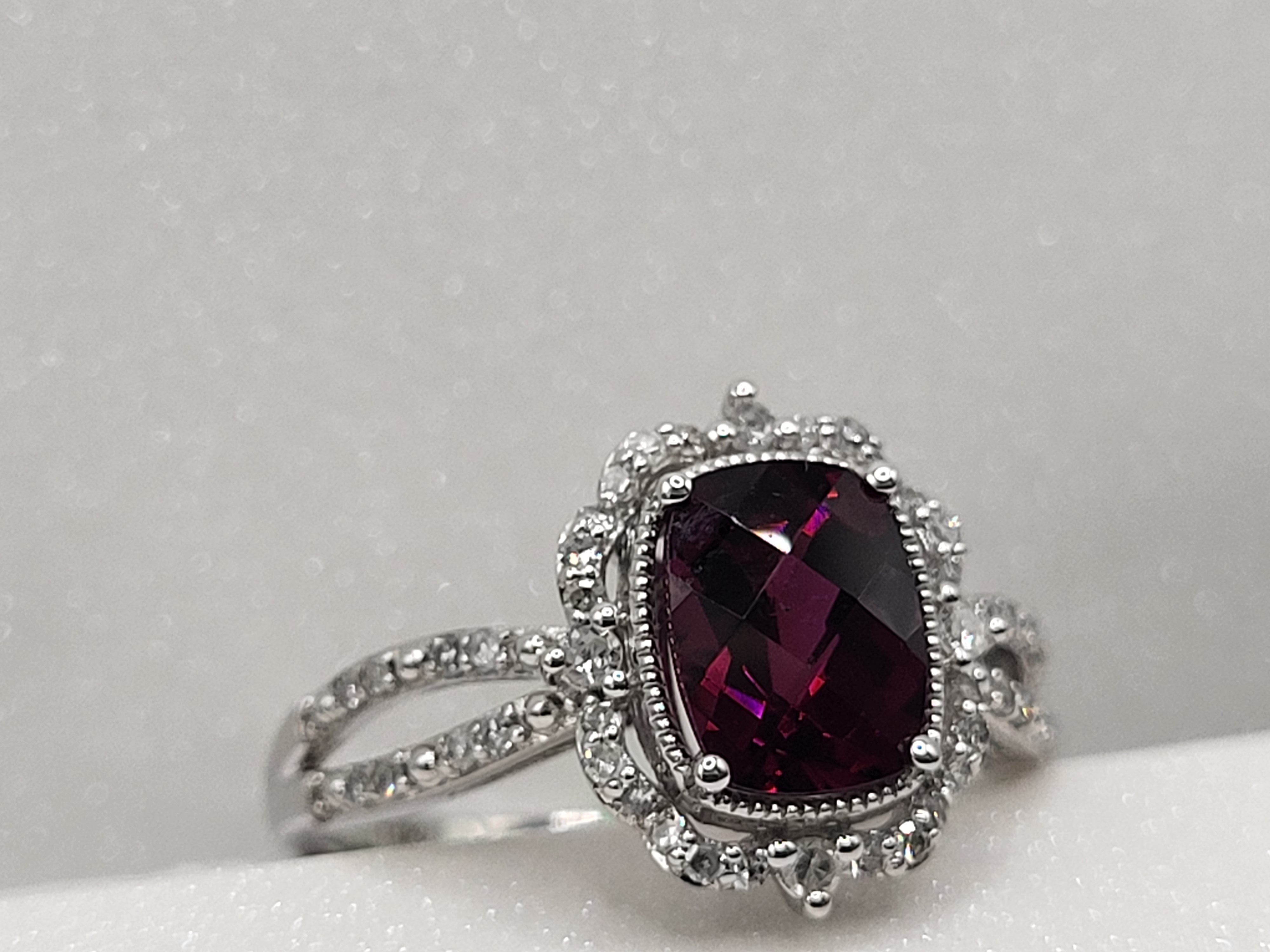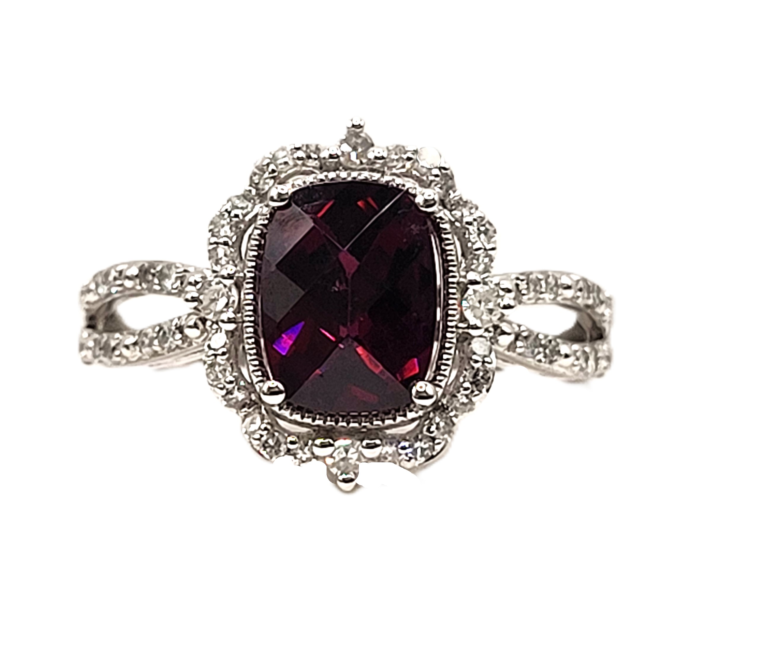 A regal cushion-cut pyrope garnet (1.25ct) glows with deep red fire at the heart of this vintage-inspired ring. Framed by a staggered halo of round, faceted diamonds (.22ctw, H–I color, I1 clarity), the setting evokes timeless glamour. The split, pinched shoulders add graceful symmetry and sparkle, while the 14K white gold band offers a polished, enduring finish.