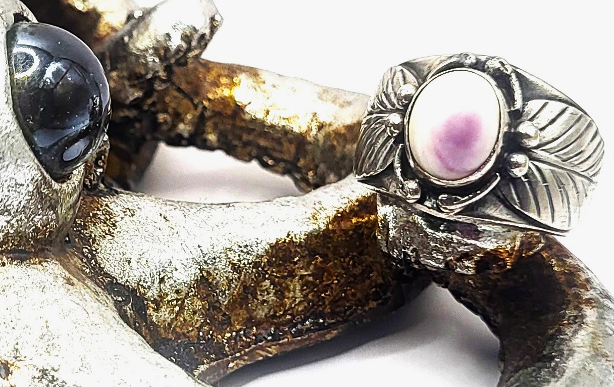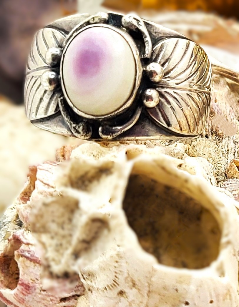 While most people are familiar with the beautiful Native American jewelry, they are not familiar with the Shiva Shell, so it makes a great "ice-breaker" or "conversation piece". This ring features an approximate 12x9mm oval, polished, slightly purplish Shiva Shell that is bezel-set in a tendrilled frame. There are large cut-out sterling silver leaves on the shoulders that lead to an approximate 7.35mm shank. This ring is US size 11.5 and bears the CM-Calvin Mariano, Navajo hallmark.. See sizing details and other information below. ** See Cleaning and Care Guide For Shiva Shell Below.
