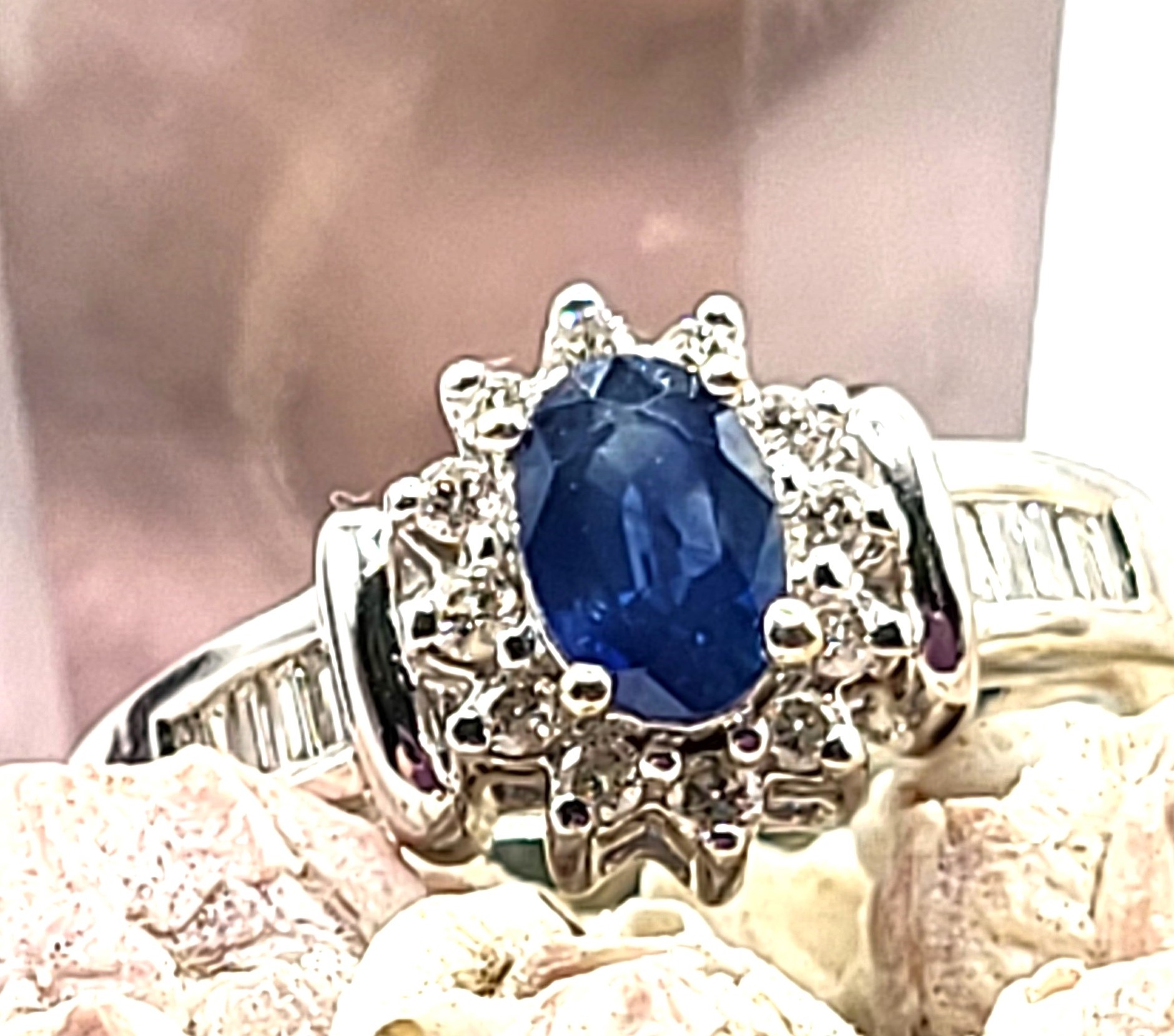 This 14 karat white gold ring features an approximate .65 carat oval-cut, genuine blue sapphire is prong-set with approximately .25 carats total weight of round, brilliant- and baguette-cut, H-I color, SI2-I1 clarity diamonds in the halo and shoulders. The channel-set shoulders are approximately 3.5mm wide and taper to an approximate 2mm shank. This ring is US size 6. Sizing options and other important information about this item are written below.  3 grams  Admin: 33110/6bnn