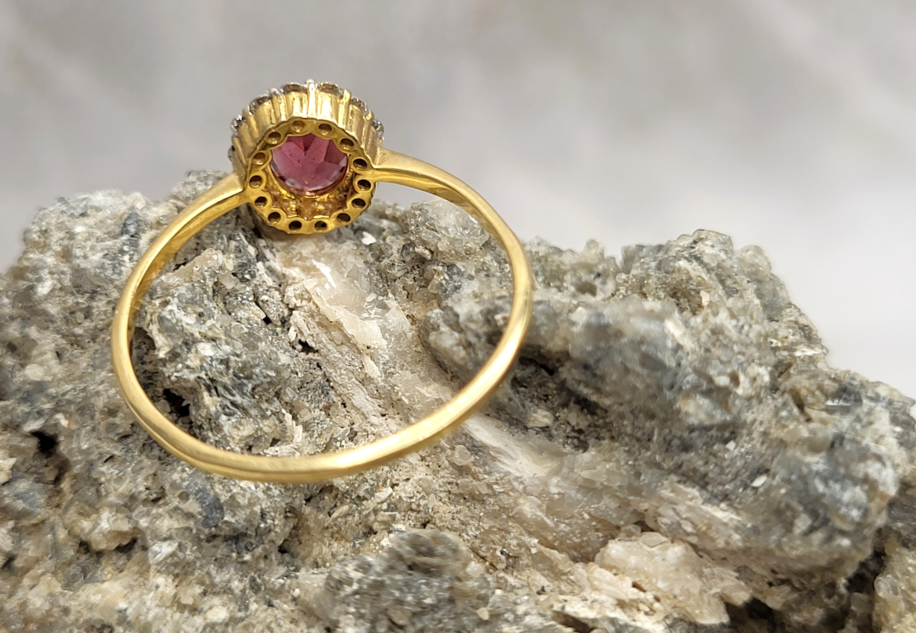 A whisper of blush, framed in fire. This 0.75 ct oval pink tourmaline glows from a halo of round, brilliant-cut diamonds (.14 ctw, H-I color, SI2-I1 clarity), set in 14K yellow gold. The firm shank wire and size 6.5 fit make it a minimalist’s dream—soft-spoken, but unforgettable. See sizing details and other information below. AdminCode: NRL211.nnn