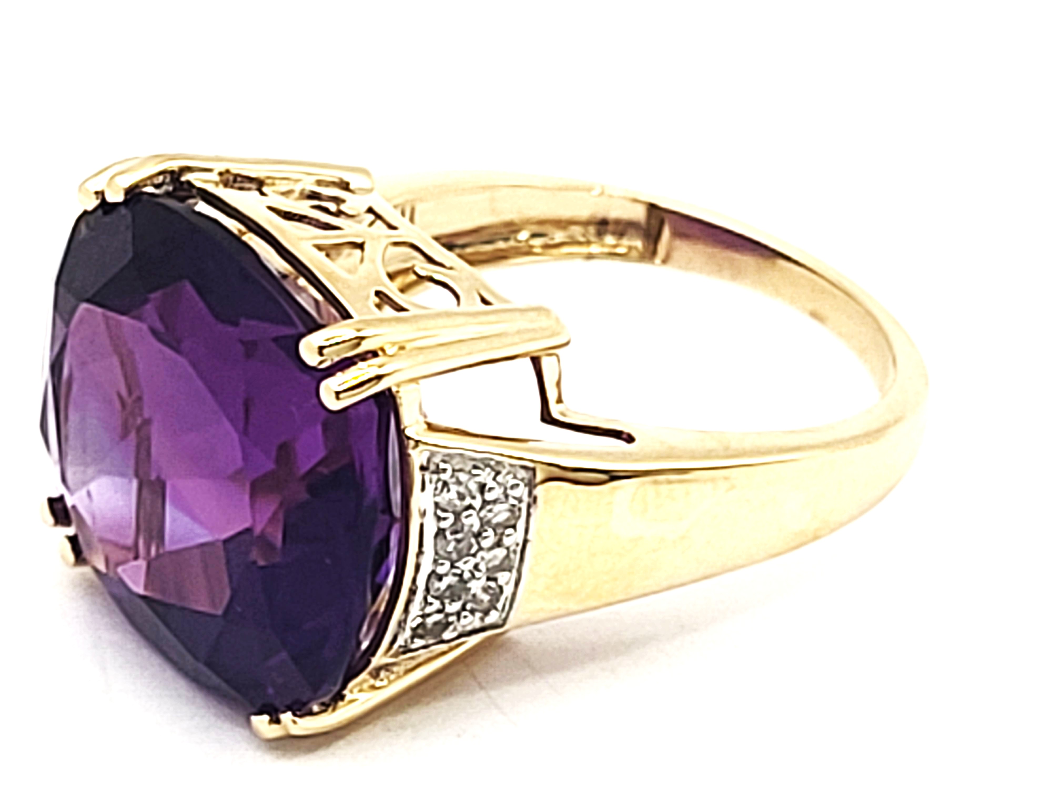 This 14 karat yellow gold ring features an impressive 11.25 carat, cushion-cut, natural amethyst that is set with alluring split prongs over a swirling, reticulated bridge. The wide cathedral shoulders have .17 carats total weight of micro-pave set, round, brilliant-cut, H-I color, I1 clarity diamonds. The ring is US size 7. See below for sizing options and other information.