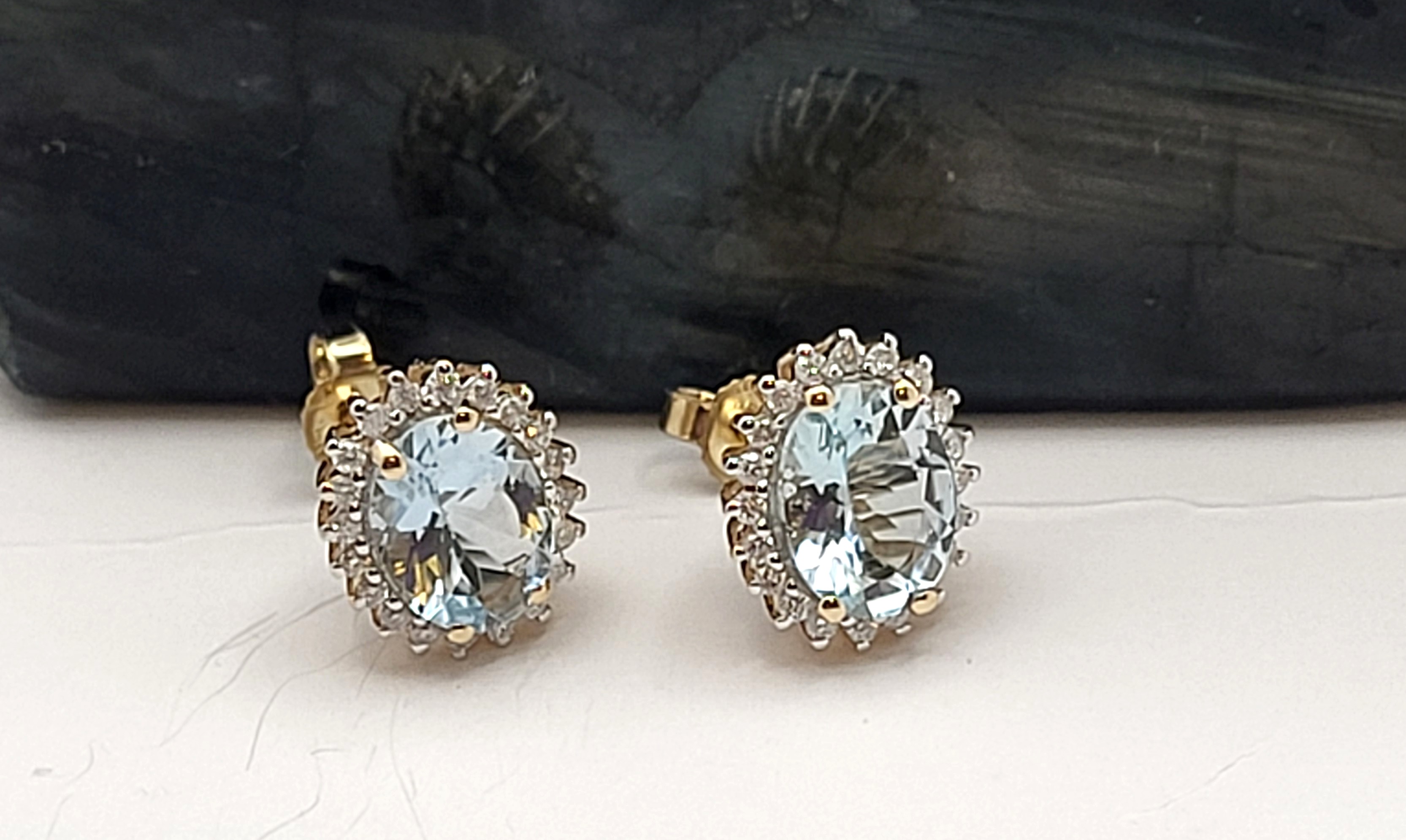 These 14 karat yellow gold earrings feature 2.10 carats total weight of oval-cut, genuine aquamarines that are prong-set in shimmering diamond halos, with a total weight and clarity rating of .26 carats round, brilliant-cut, H-I, SI2-I1. The earrings measure approximately 3/8" x 1/4" and attach to the earlobe with posts and friction backs. Admin: Q5743/7-piw