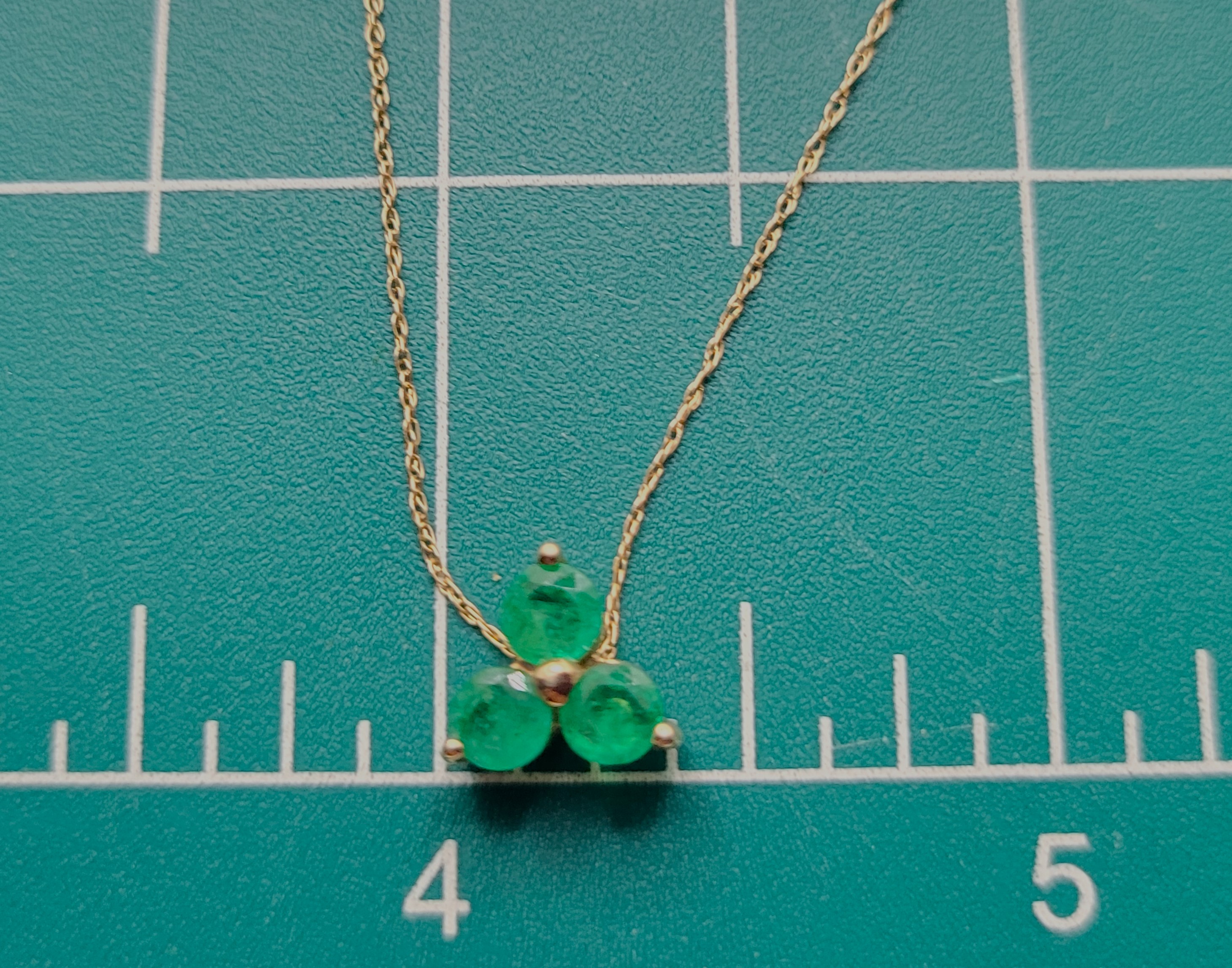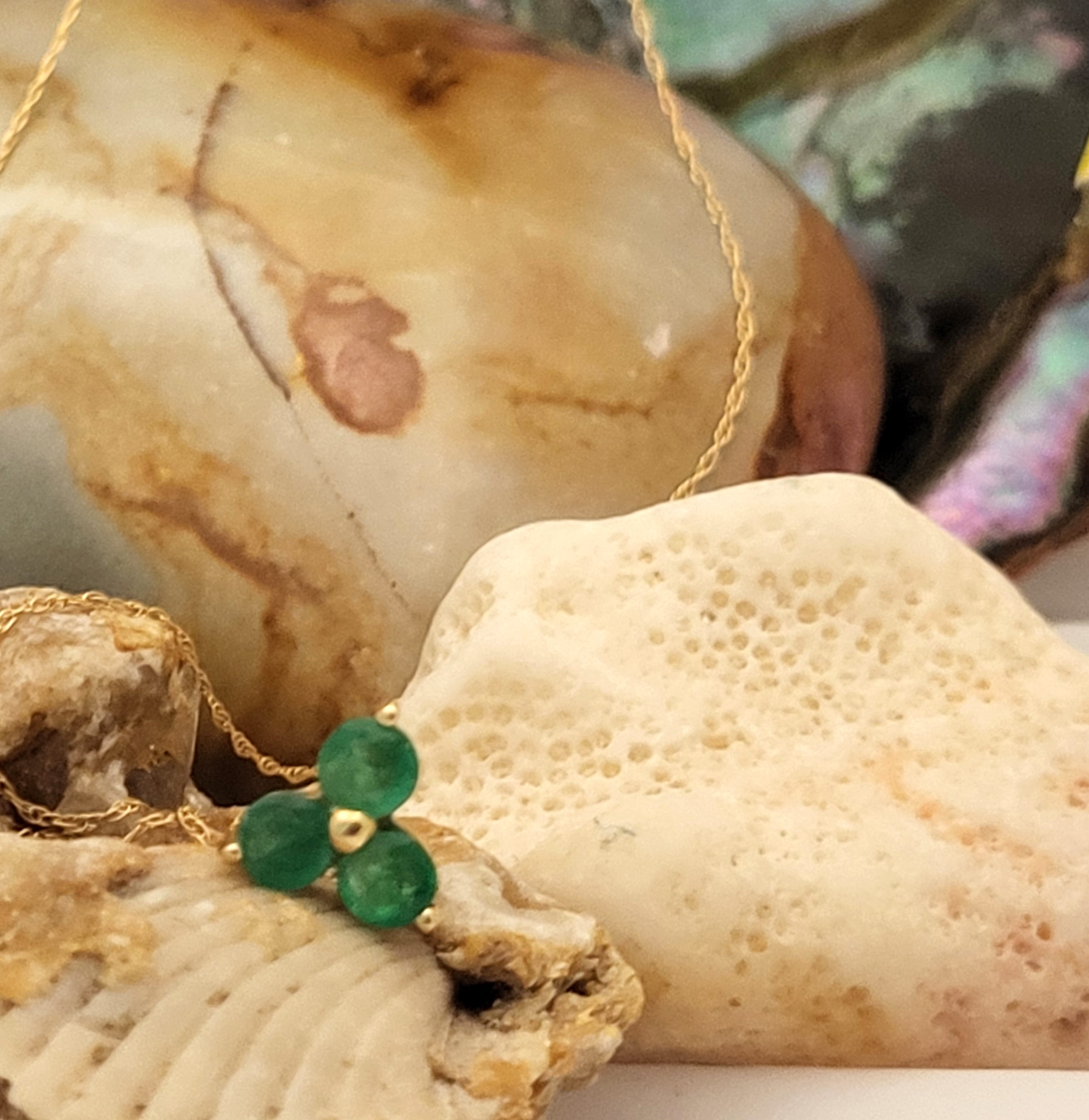 This 14 karat yellow gold necklace features .75 carats of round, faceted, genuine emeralds that are prong-set into the shape of a three-leaf clover, or trefoil, with a built-in bail that is formed by the back gallery. The approximate 3/8" pendant hangs from a 14 karat yellow gold fine link chain that is 18" long with a spring ring. The pendant bears the hallmark (CID) for Clyde Duneier of New York, who founded the "Jewelers For Children" charity in 1983, helping mostly with Juvenile Diabetes. Admin: 33110/17a