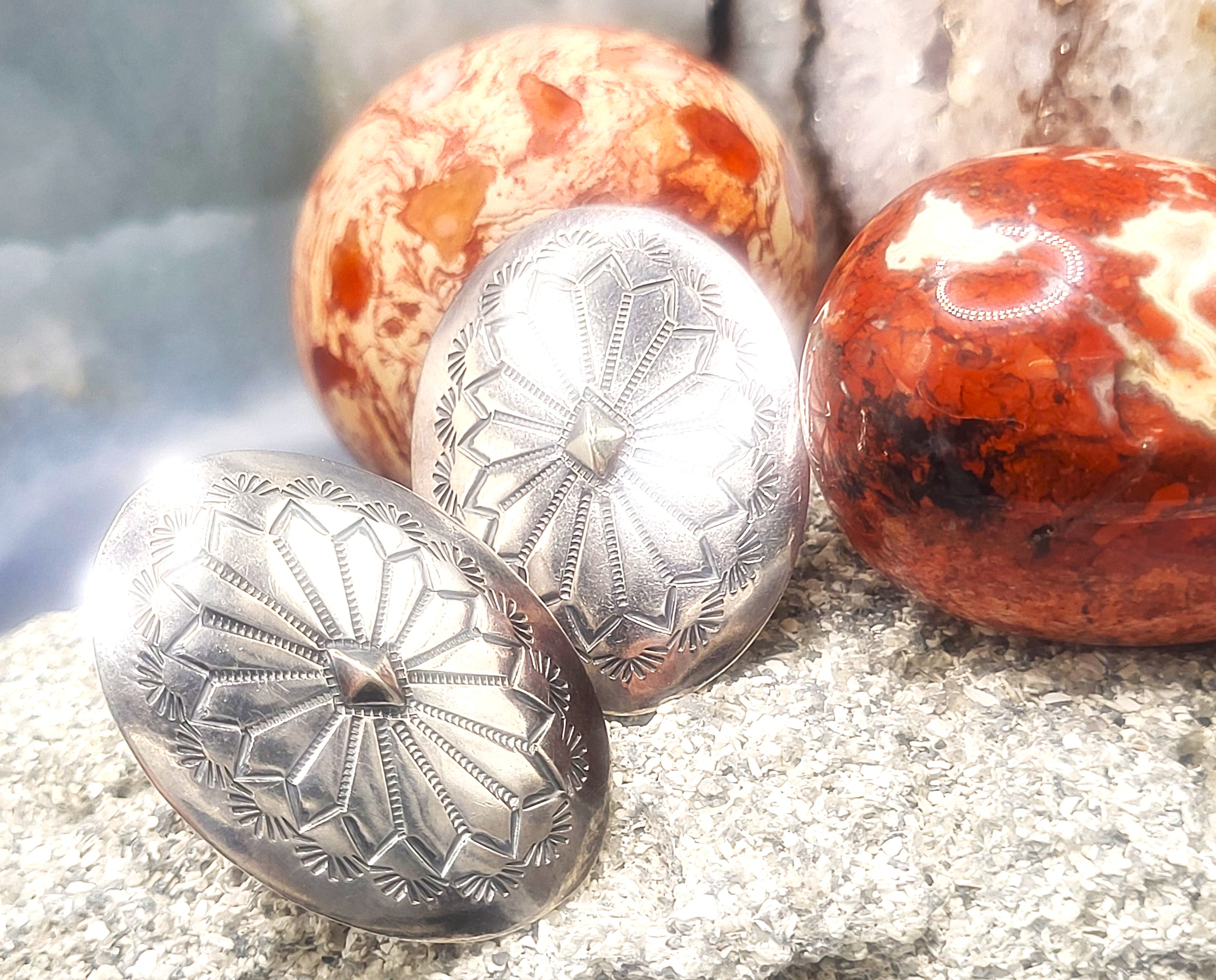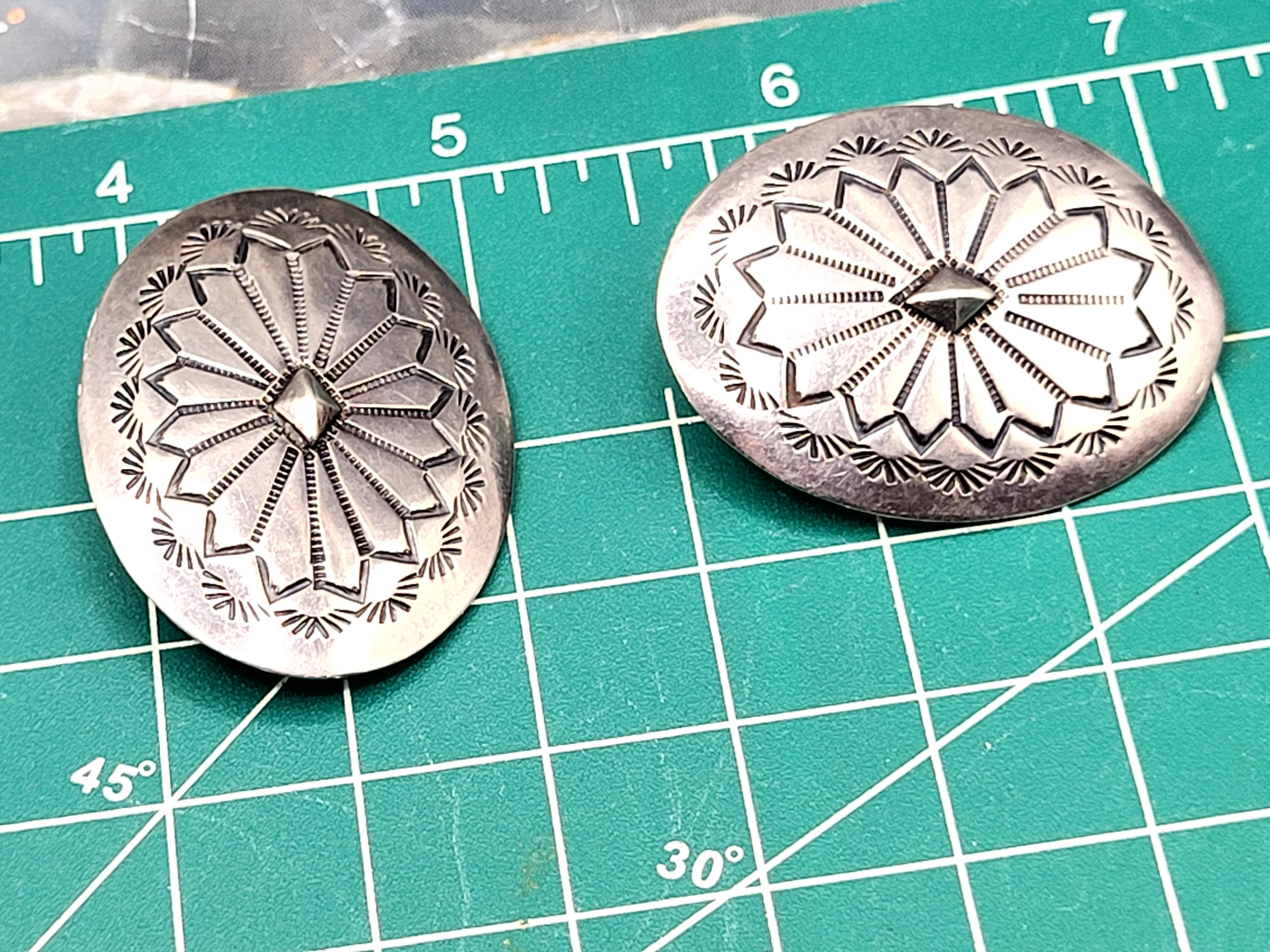 These sterling silver earrings are die-struck "links" resembling those of the iconic Western wear "concho or concha" belts. The central diamond shape with radiating pointed feathers and a rising sun on the end of each is a known Navajo design. Although there is no hallmark on these earrings, they resemble the work and designs of the late Ernest Bilagody, a Navajo native American. The earrings measure 1.75" x1.25" and have clip-on backs and are believed to be circa 1985ish. Admin: 33120/715.