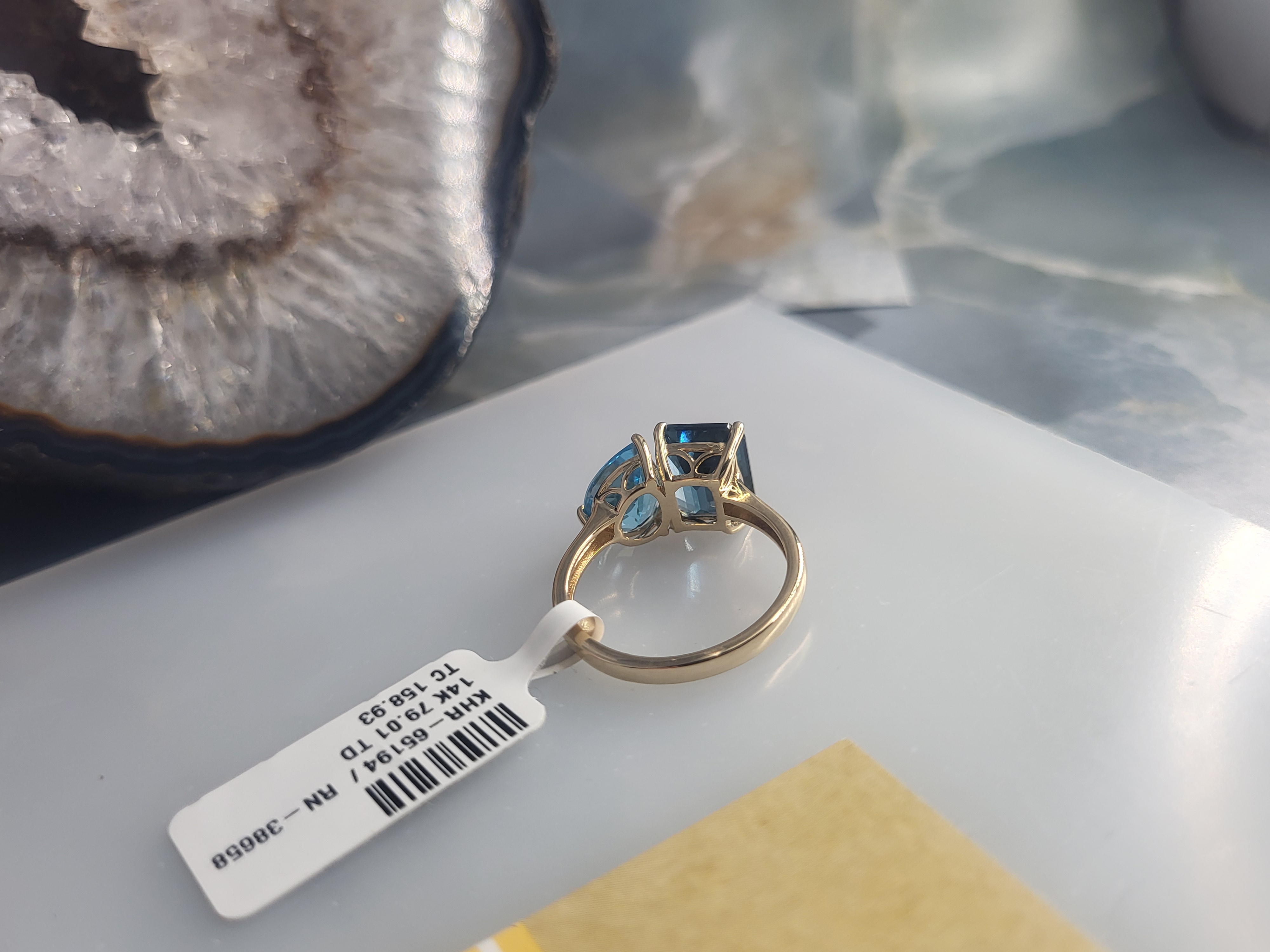 A bold duet of blue: this side-by-side ring features a 6.75 carat octagonal London Blue Topaz and a 5.89 carat pear-cut Swiss Blue Topaz, set in a trussed open gallery of 14K yellow gold. Though the design appears adjustable, the gemstones are securely fixed—this is a structured, non-adjustable ring. The asymmetrical silhouette and vivid contrast between deep and sky blue tones make this size 6.75 piece a standout in any collection AdminCode: 6282/23-nrr