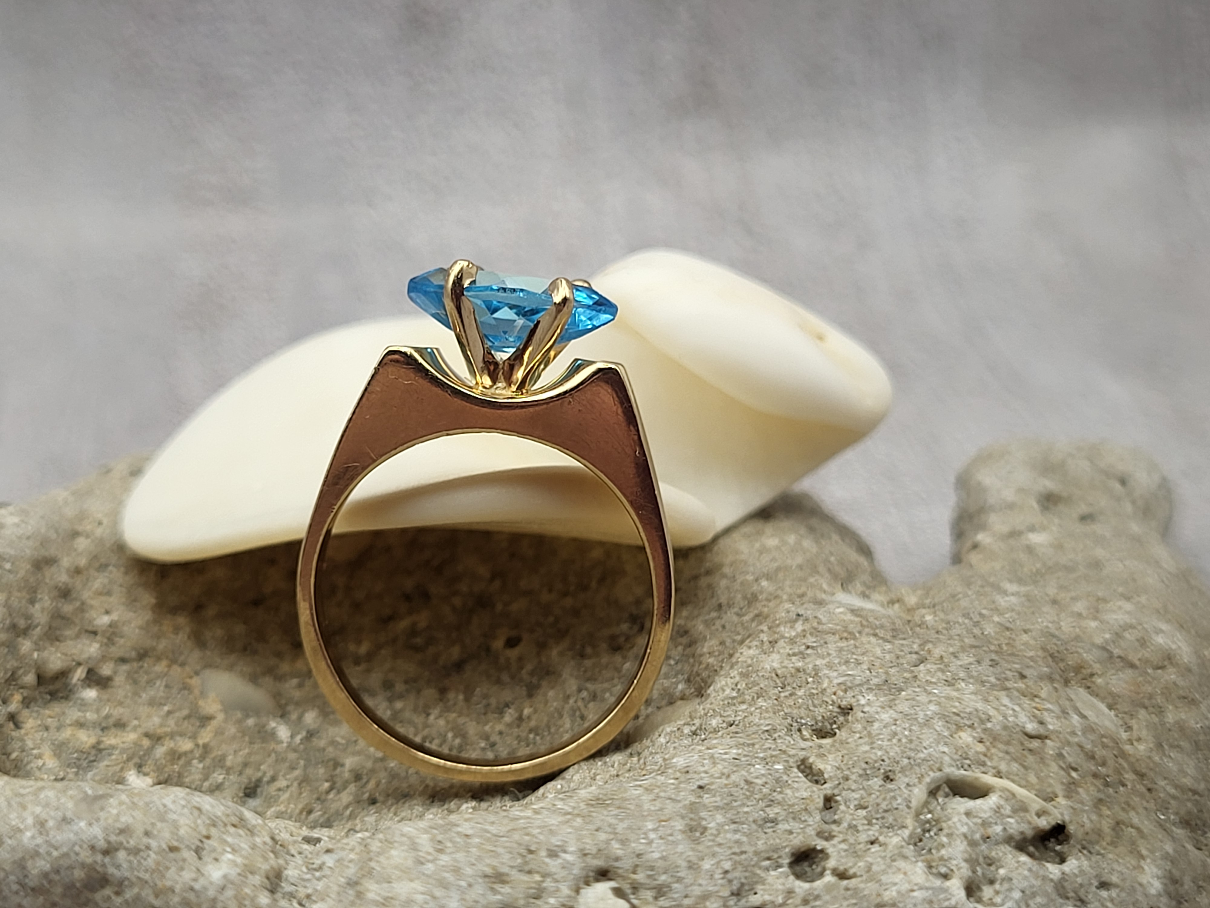 This 14 karat yellow gold ring certainly marks all the boxes in becoming the newest "bling" for a "Sweet 16"! Certainly trendy with a 1.00 carat, prong-set, East-West oriented, marquise-cut, genuine Swiss blue topaz. But, the icing on the cake, is the saddle design and the convex, cathedral-style shoulders! The ring is US size 5.5. Sizing options and other important information are below. Admin: KbPg4925/61855