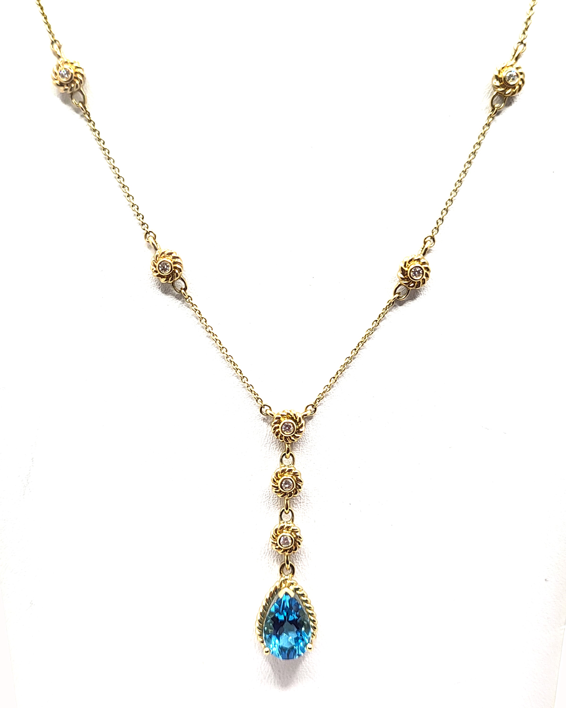 This is a 14 karat yellow gold lavalier style necklace that focuses on a 2.29 carat pear-cut, prong-set, genuine Swiss Blue Topaz. This mesmerizing gemstone is framed with yellow gold twisted rope. It dangles from a 16" fine link chain that has a lobster clasp and .14 carats total weight of round, brilliant-cut, H color, SI2-I1 clarity, bezel-set diamonds that are stationed throughout the necklace in twisted rope frames. The pendant dangles approximately 1.5" from the center of the chain. Admin: G11241/44nat