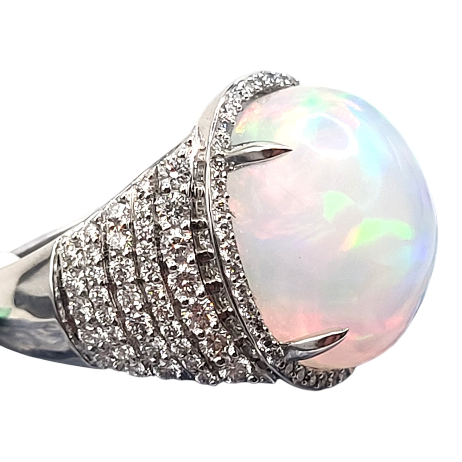A luminous showpiece in 18K white gold, size 7, weighing 6.96 grams. The centerpiece is a 10.62 ct oval cabochon Orion opal, glowing with ethereal fire and shifting hues. Surrounding the opal, 1.00 ctw of round ideal-cut diamonds (G color, SI1 clarity) add brilliance and balance. Claw prongs secure the gem, while the elegant and supportive under gallery ensures comfort and durability. A celestial treasure for collectors who seek rare beauty and refined craftsmanship. See sizing details and other information below. AdminCode: 6282/19-lrrr