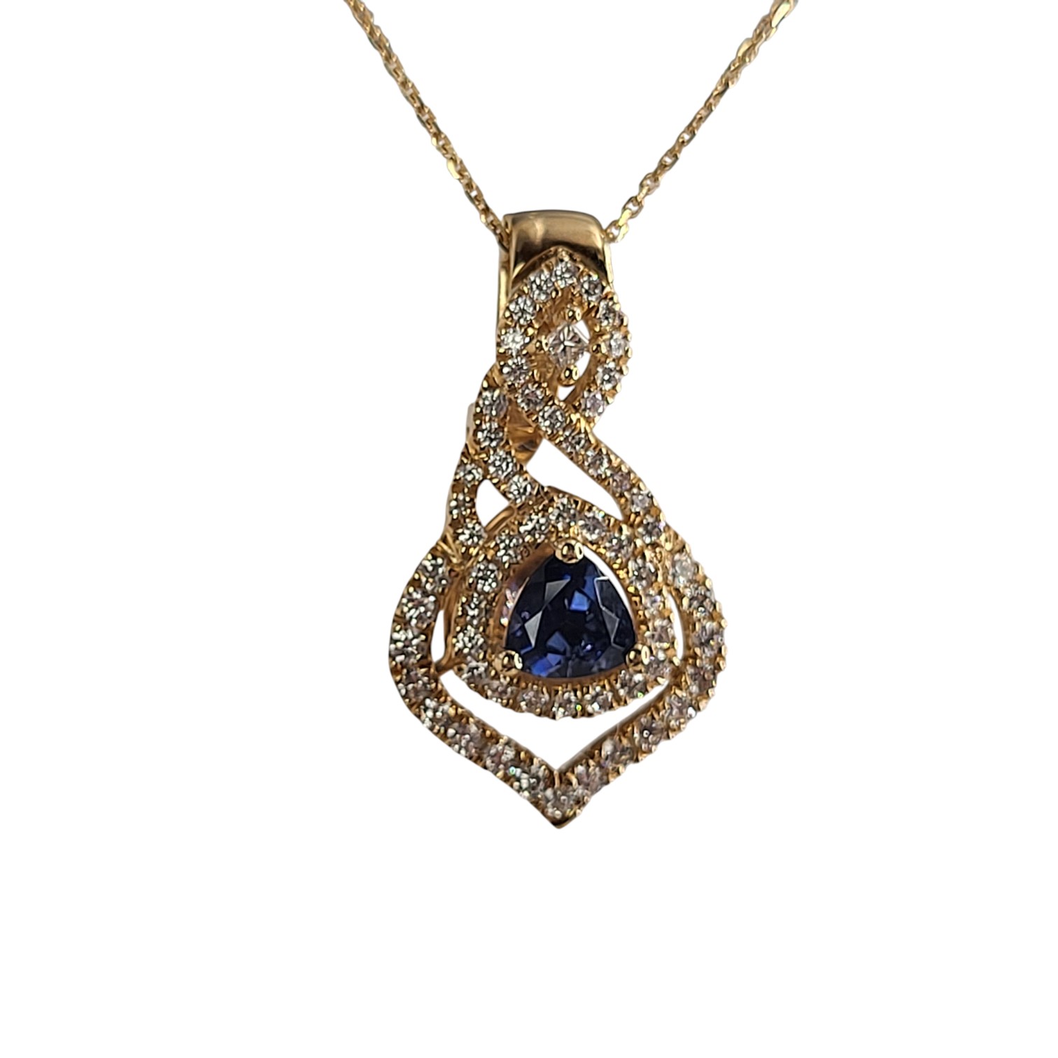 A RARE trilliant-cut benitoite (0.42 CT) blazes from the center of this ornate 18K yellow gold pendant, framed by a swirl of 0.41 CTW ideal-cut diamonds. The design is both architectural and ethereal—each diamond precisely placed to echo the gemstone’s celestial fire. Suspended from an 18" fine rolo link chain, this piece is a tribute to rarity, craftsmanship, and California’s most elusive treasure. See the bottom of this listing for other important information.