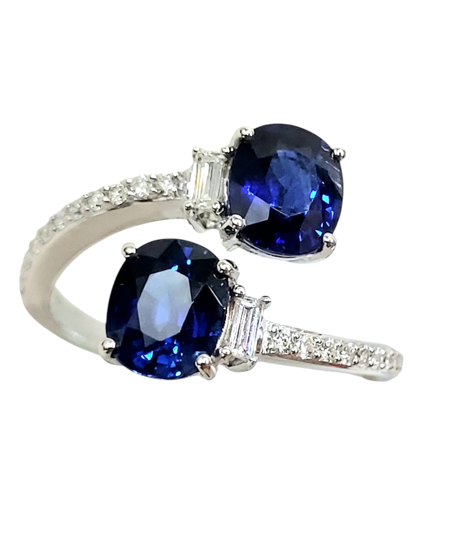 A graceful bypass design in 18K white gold, size 7, weighing 4.1 grams. This “toi et moi” crossover ring features 3.20 ctw of oval-cut royal blue sapphires, paired with .26 ctw of round brilliant-cut and straight baguette diamonds (G color, SI1 clarity). The elegant symmetry and baguette accents evoke timeless romance and modern flair. Note: While the ring’s open-top design may appear adjustable, it is not intended for resizing. Repeated bending can compromise the structure and loosen gemstones. A refined piece for collectors who appreciate both beauty and integrity in craftsmanship. See sizing details and other information below. AdminCode: 6282/8.lerr