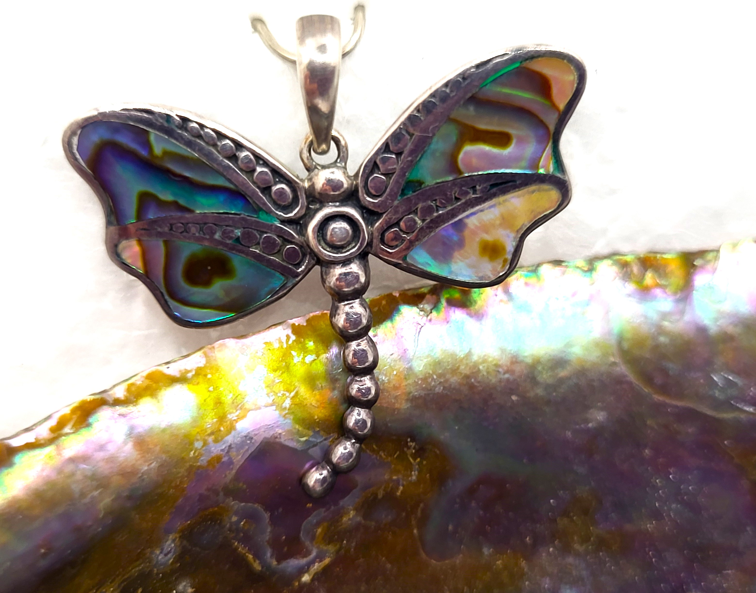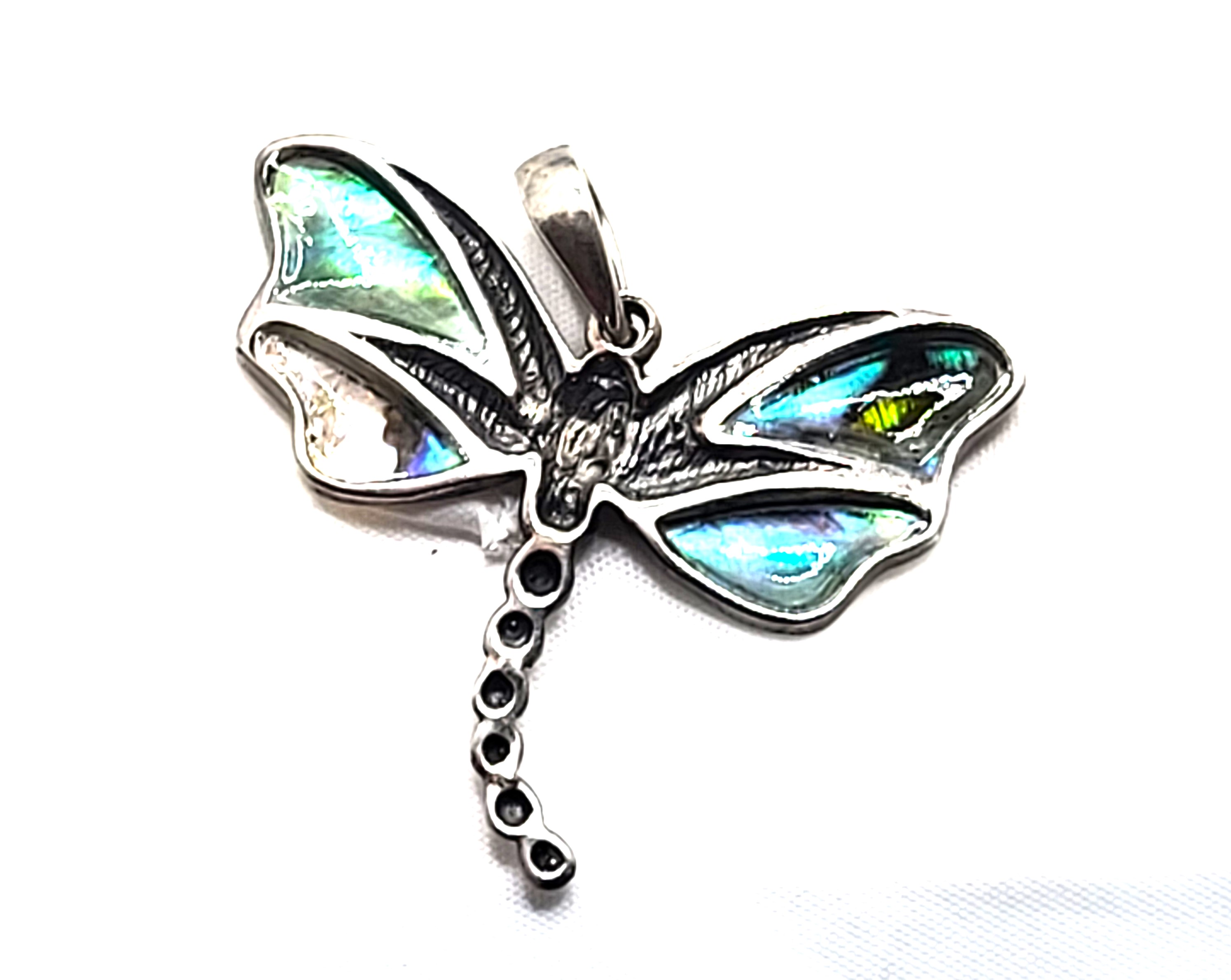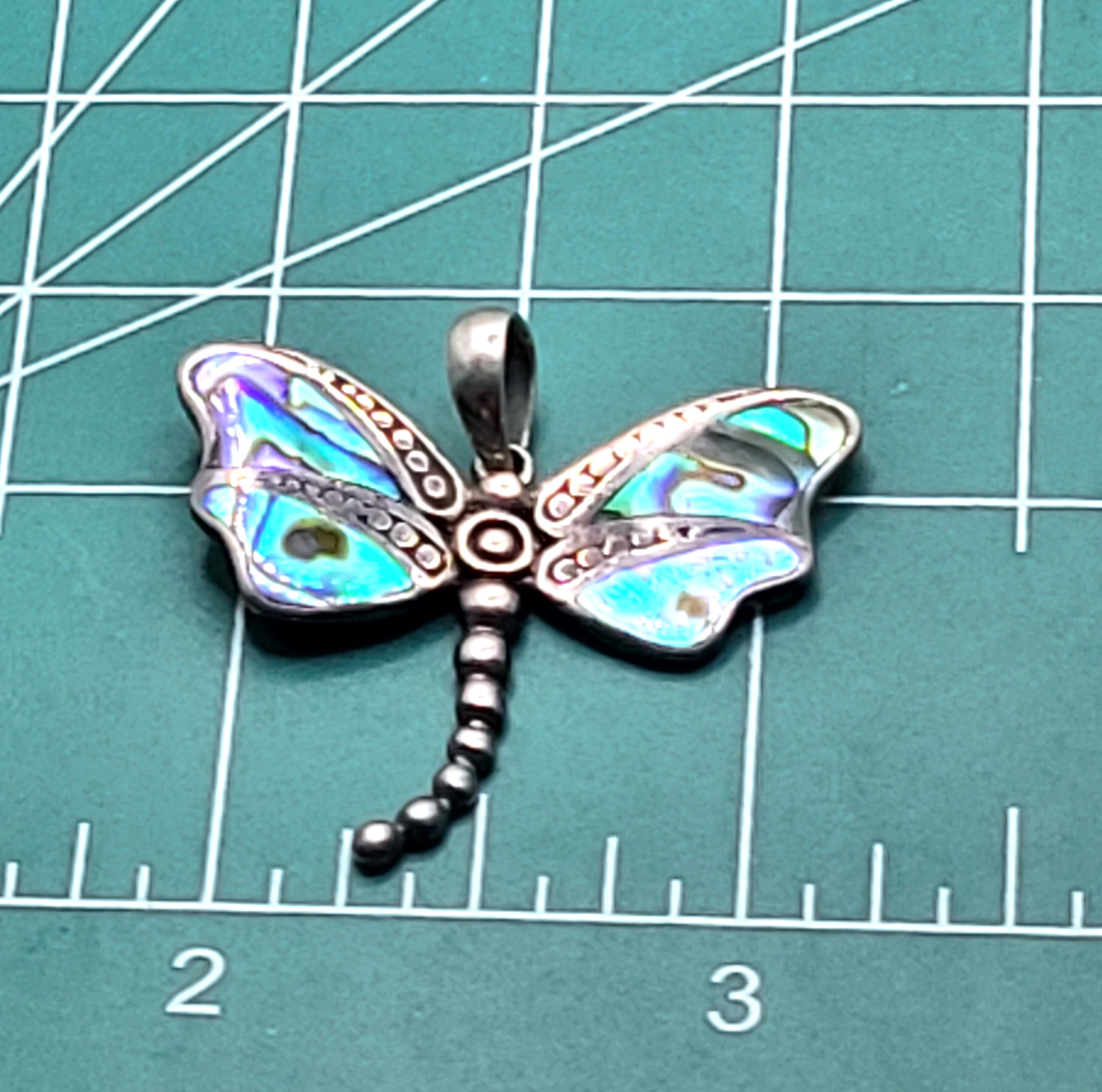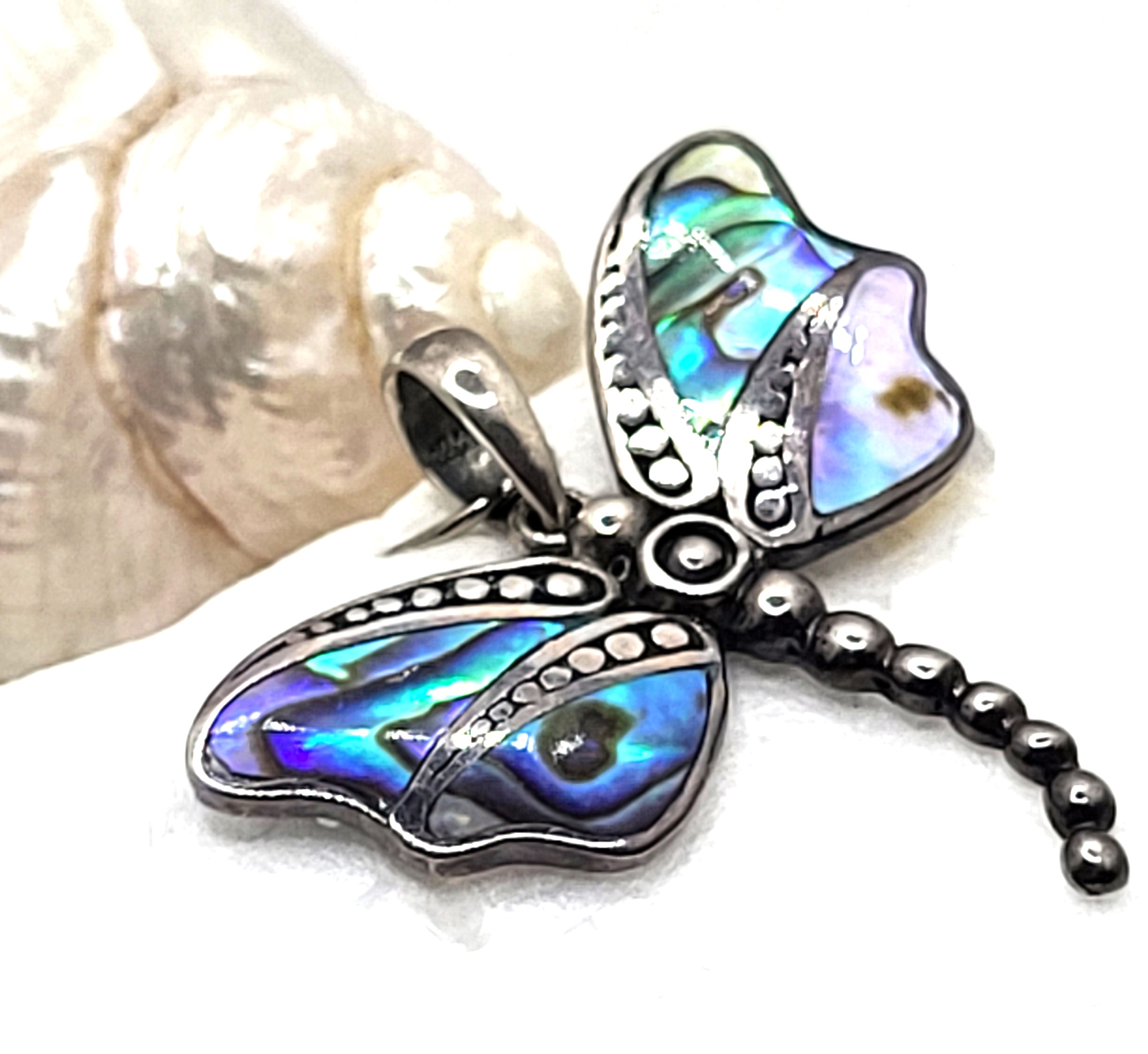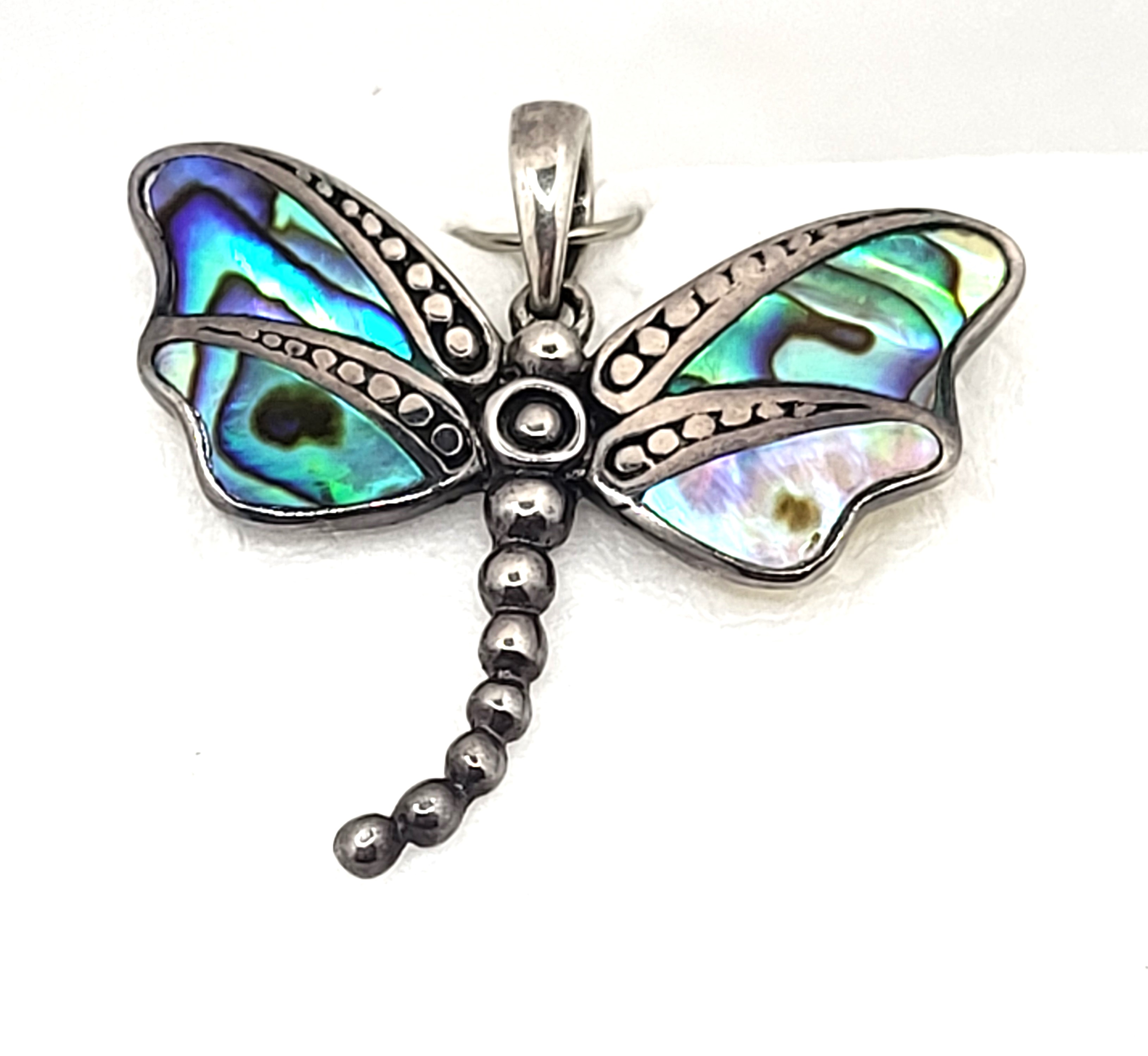This sterling silver dragonfly pendant is quite beautiful with it’s beaded body, and rainbow shimmery wings made of inlaid abalone shell. The pendant is approximately 1.25" x 1 3/8" and has a solid bail that can accommodate up to an approximate 4.5mm thick chain. Admin: 33123/1