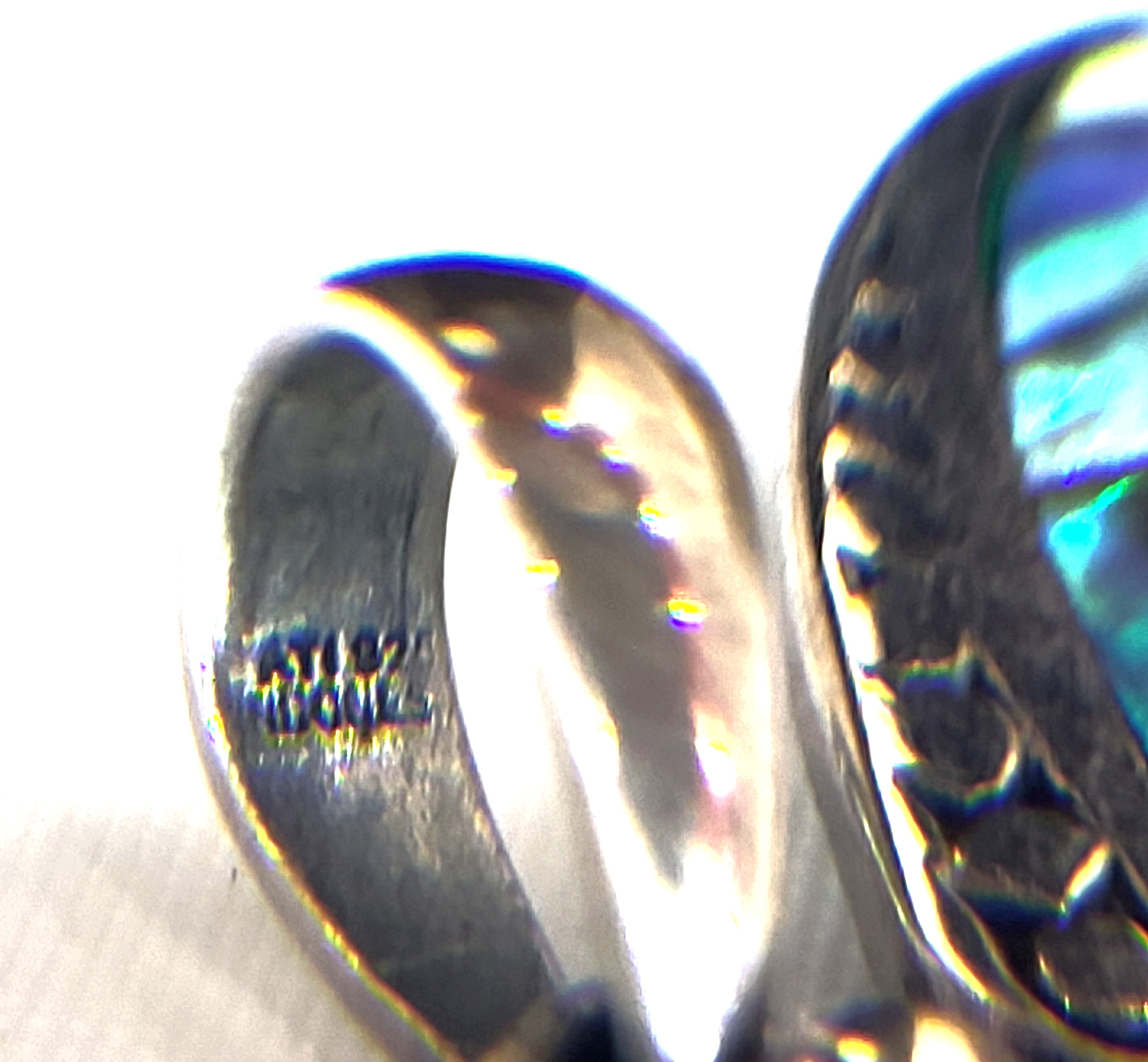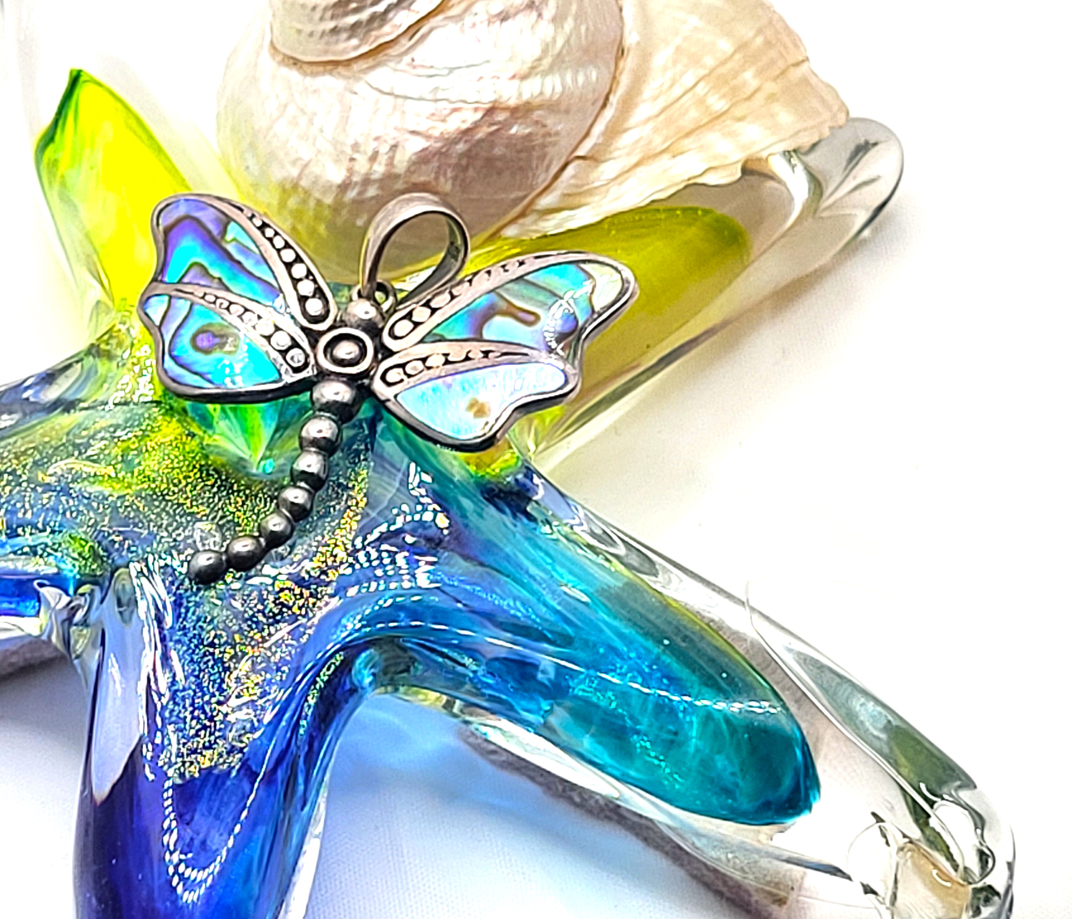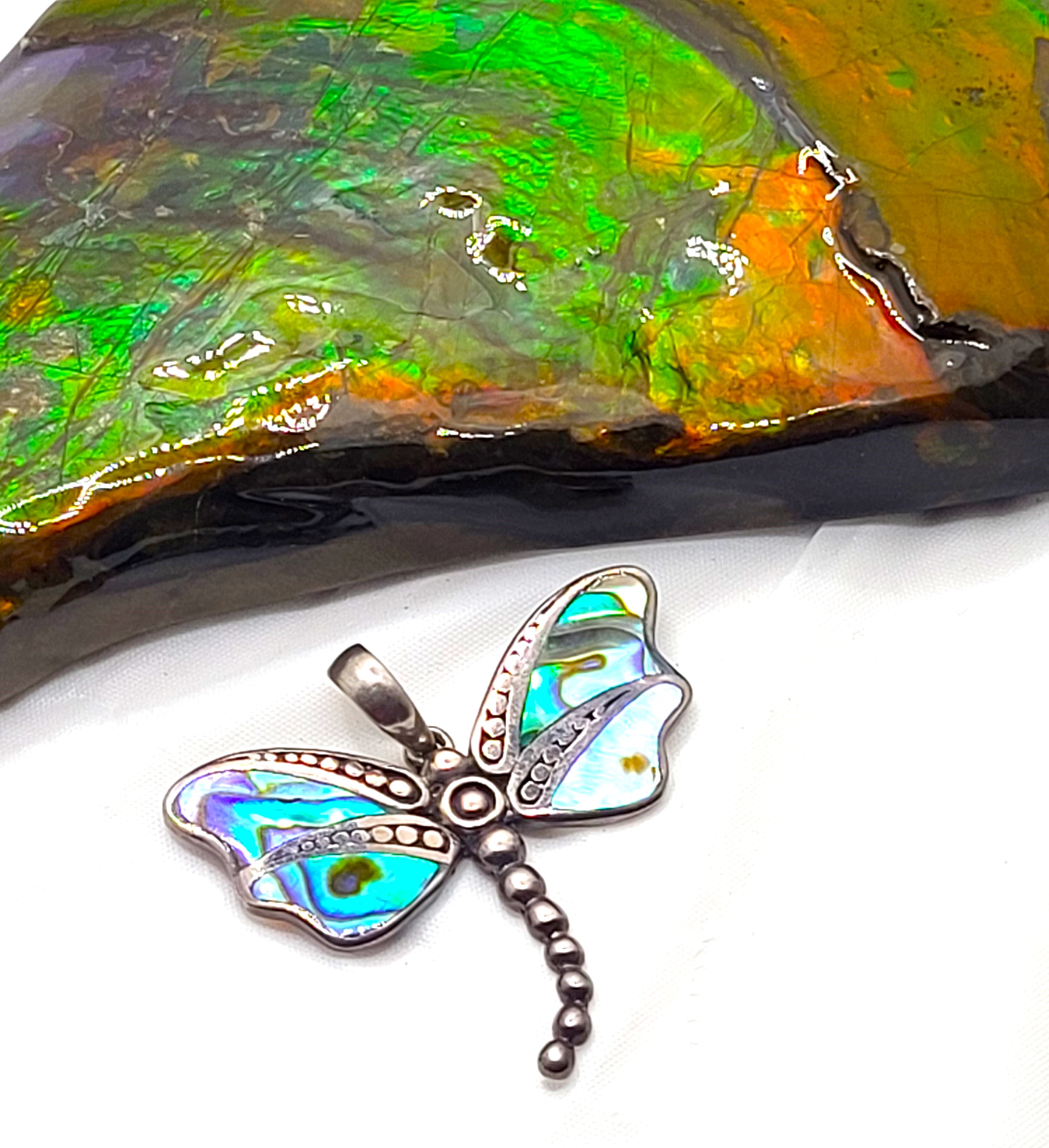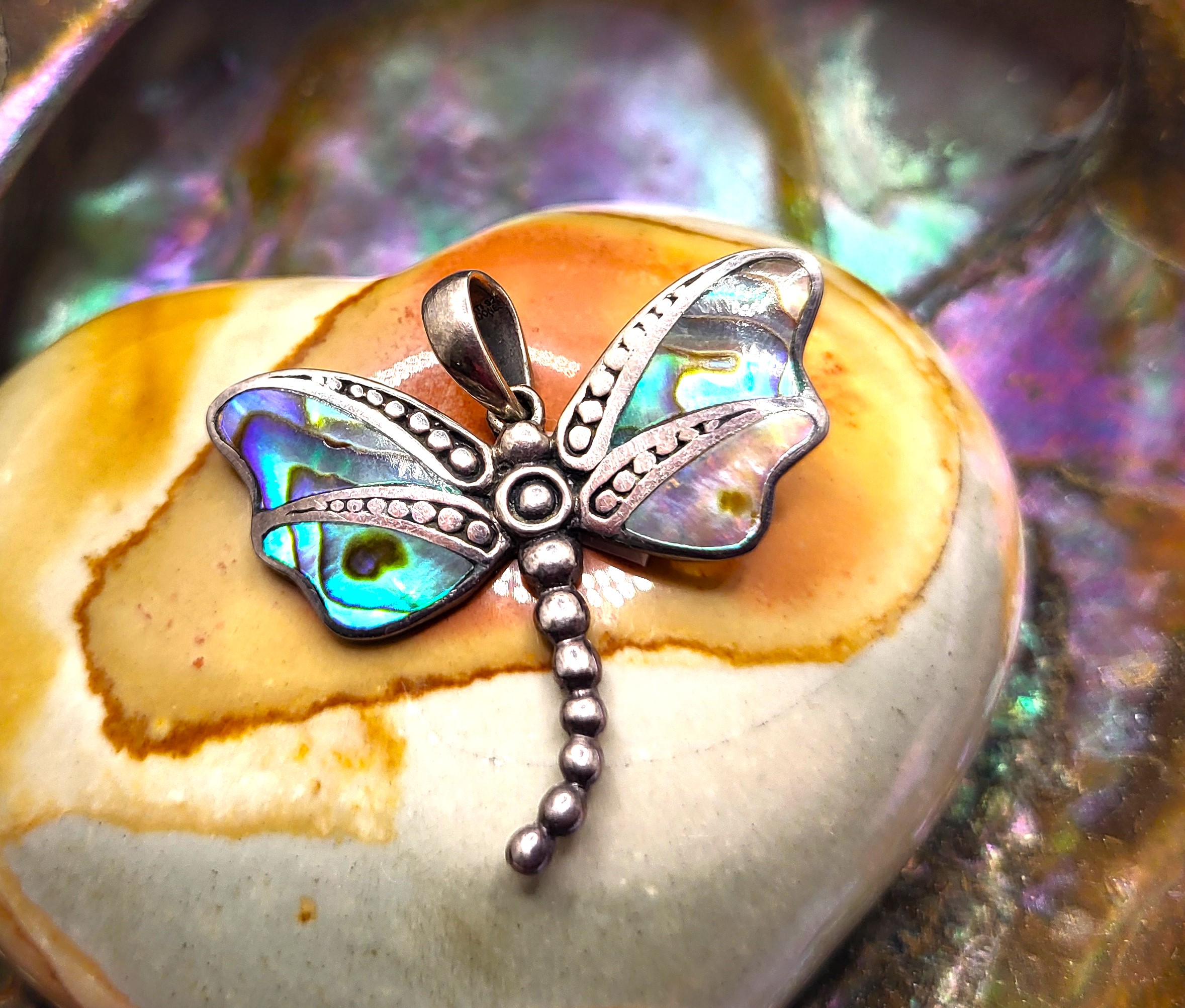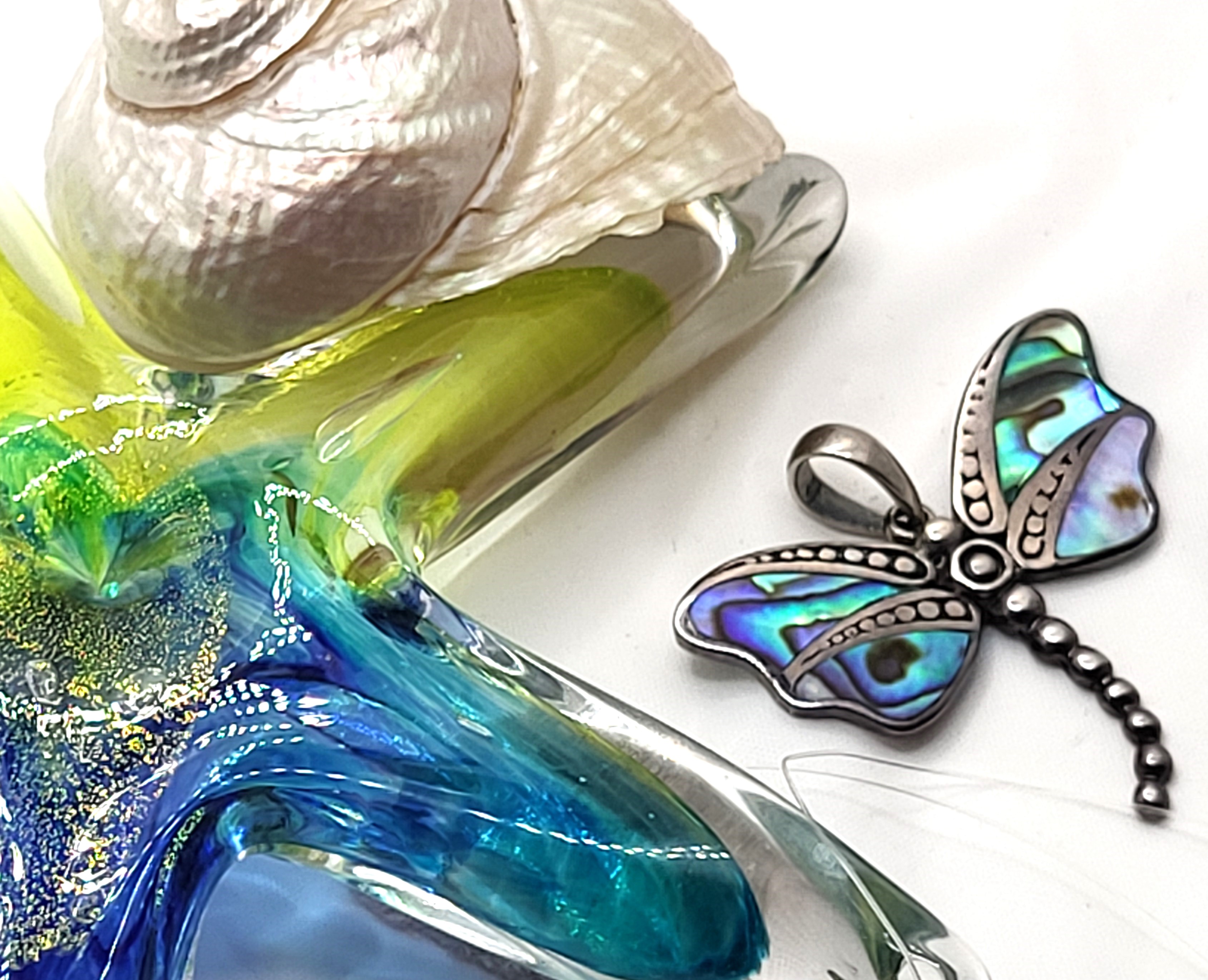 This sterling silver dragonfly pendant is quite beautiful with it’s beaded body, and rainbow shimmery wings made of inlaid abalone shell. The pendant is approximately 1.25" x 1 3/8" and has a solid bail that can accommodate up to an approximate 4.5mm thick chain. Admin: 33123/1