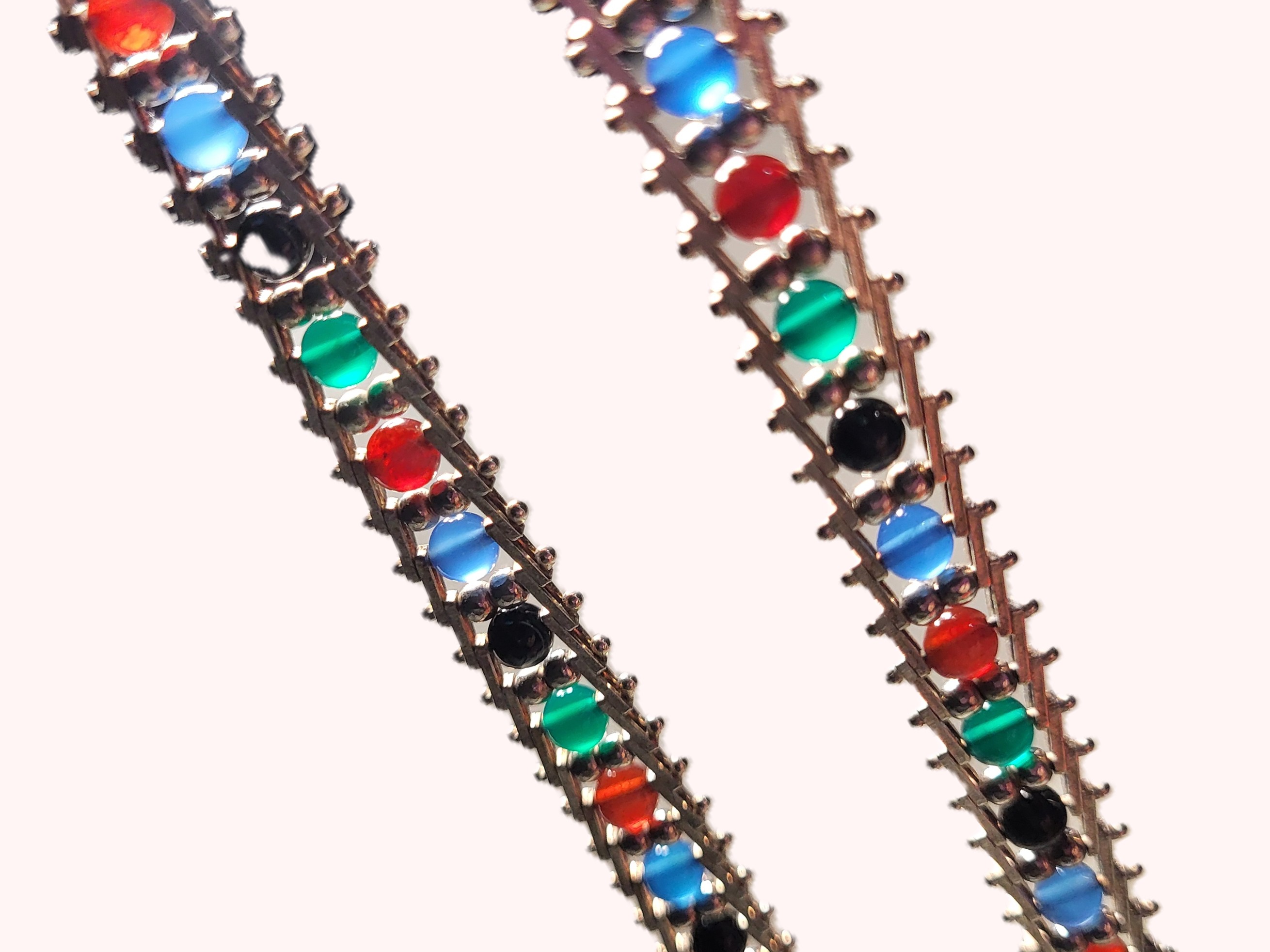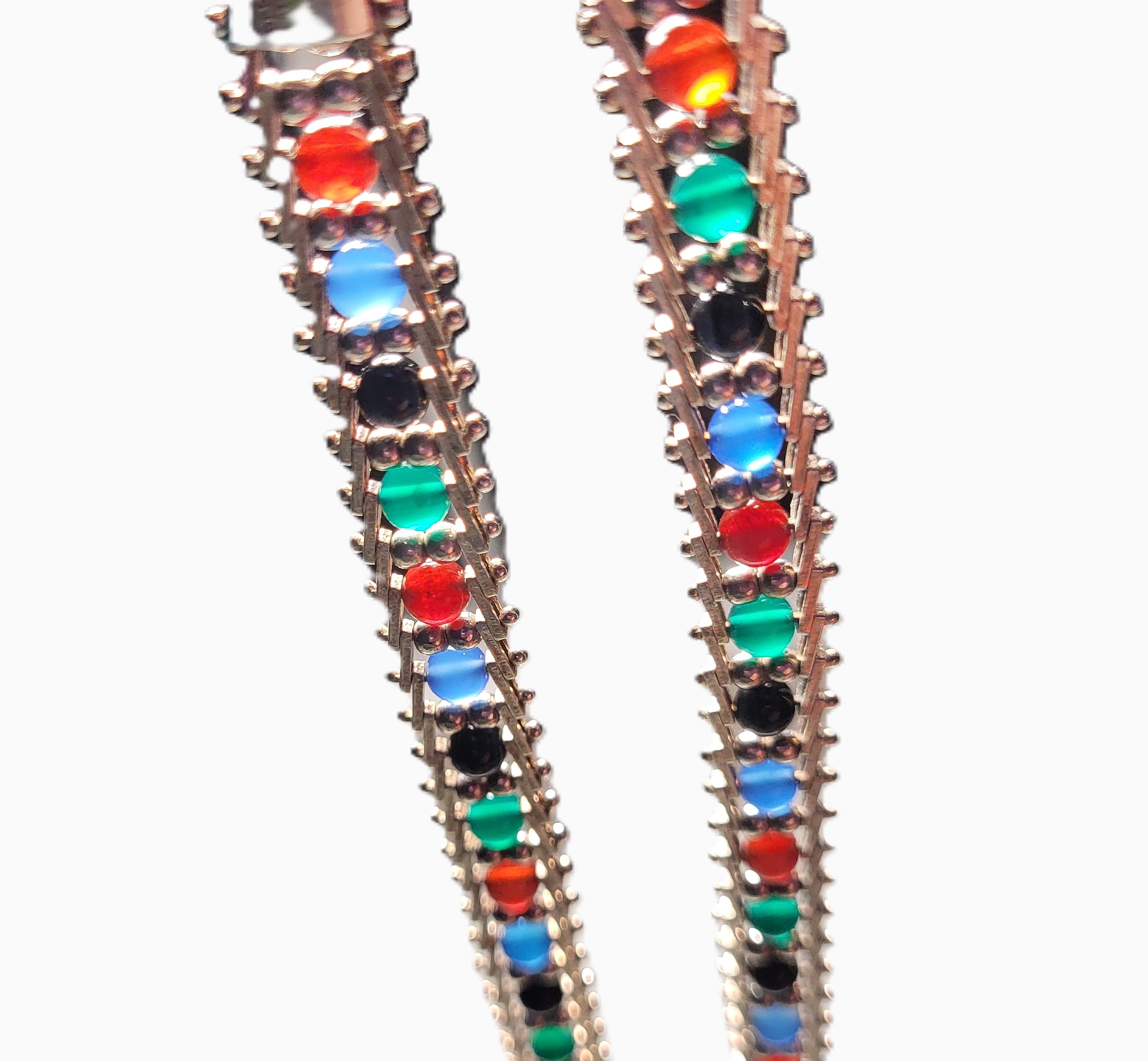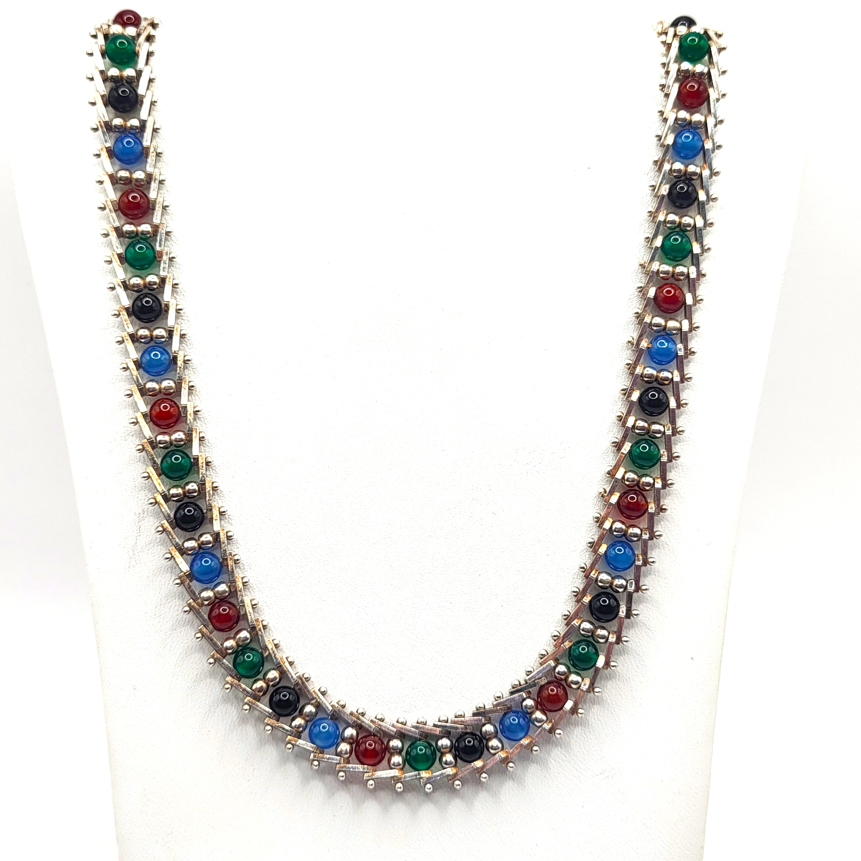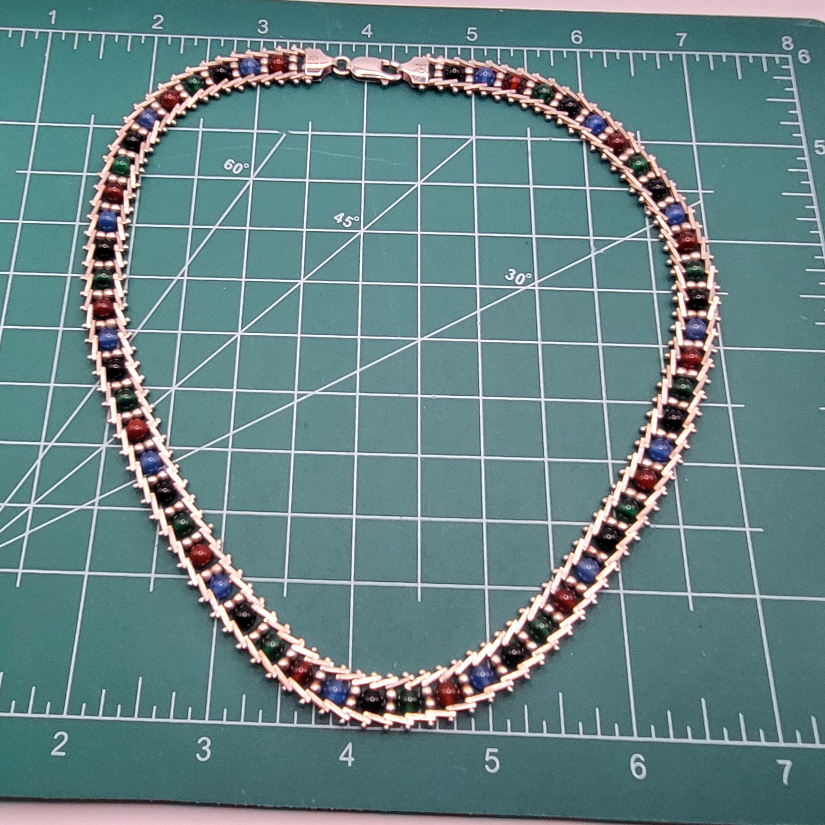 This sterling silver necklace displays an array of colors in onyx: black, red, green, and blue. The onyx beads are approximately 4.25mm in the center of each riveted link, separated by 2.5mm beads. The necklace is approximately 17" long and 9.75mm wide, with a lobster clasp. The Milor hallmark is on one of the end caps. Admin: 33120/24lr