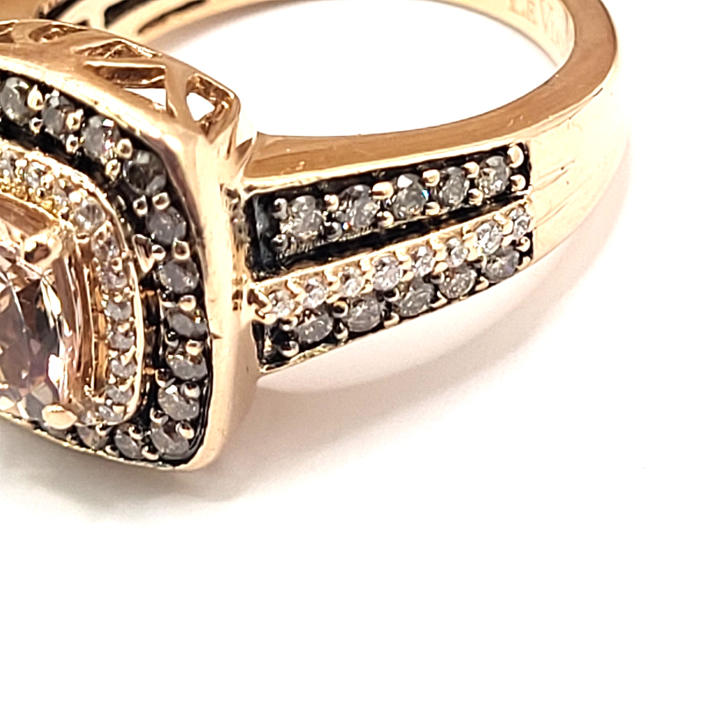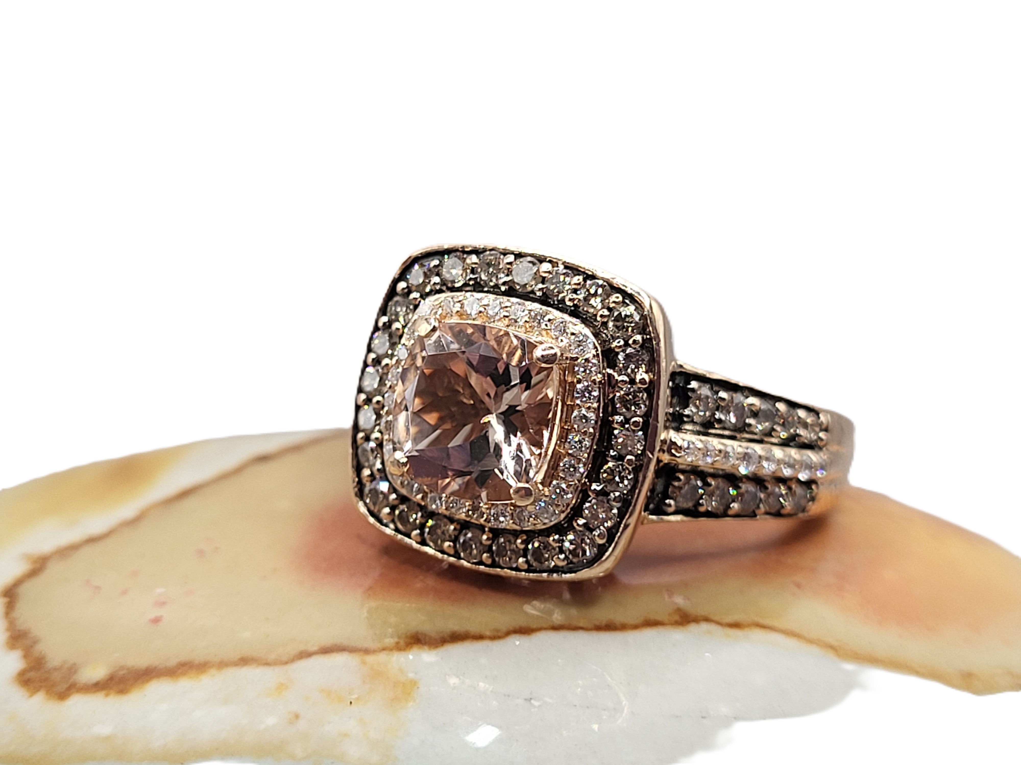This 14 karat rose gold ring bears the LeVian hallmark and features an approximate 2.00 carat cushion-cut Morganite. The ring has a wide, cushion-shaped frame and wide, tiered shoulders, set with approximately 1.00 carats total weight of SI clarity chocolate and vanilla diamonds. There is a supportive under gallery and a raised, trussed, side gallery. This ring is a US size 7. See below for sizing details and other information.