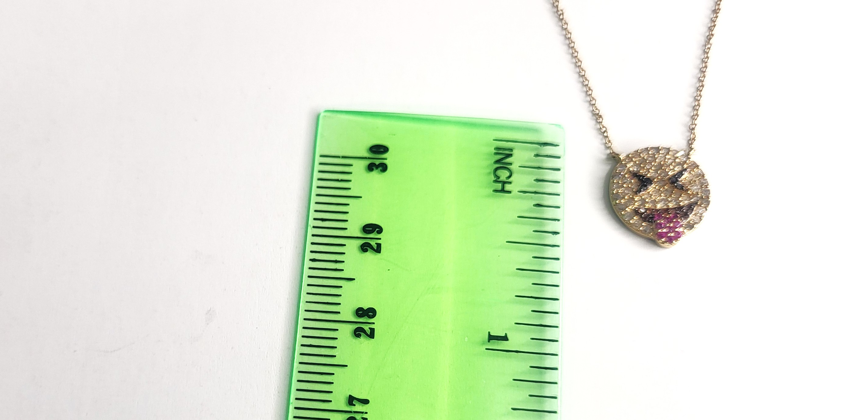 A playful yet luxe 14 karat yellow gold necklace featuring a static emoji pendant encrusted with round, faceted I-J and black I2 clarity diamonds (.27ctw), genuine pink diamonds (.09ctw), and a vivid pink sapphire accent. The pendant is fixed in place via looped “ears, ” giving it a stationery charm on a fine rolo link chain. The chain measures 7.5" on each side for a total of 16", with an additional “O” ring 1" from the closure for optional extension up to 17". Finished with a secure spring ring clasp. Length adjusts from approximately 16" to 17", making it versatile for layering or solo wear.AdminCode:6282/31.7-nrr