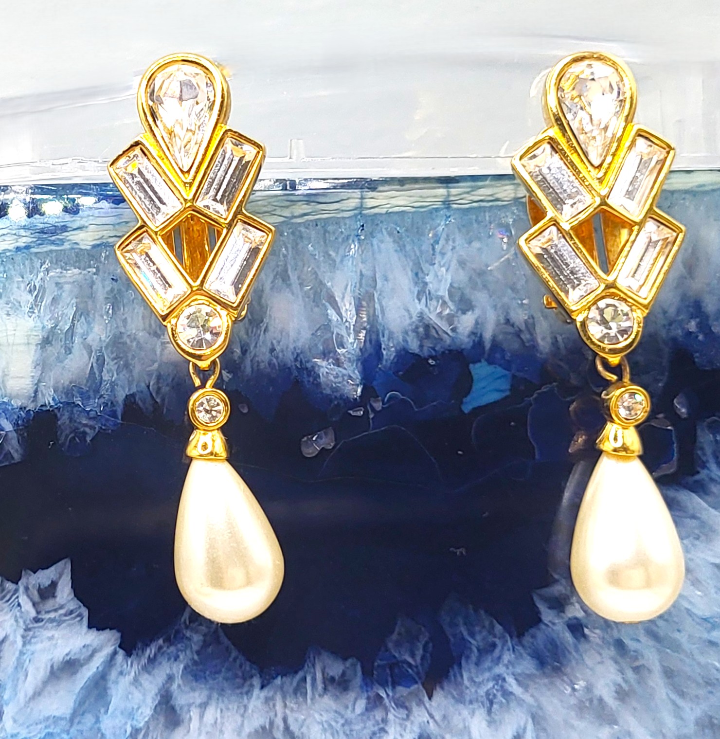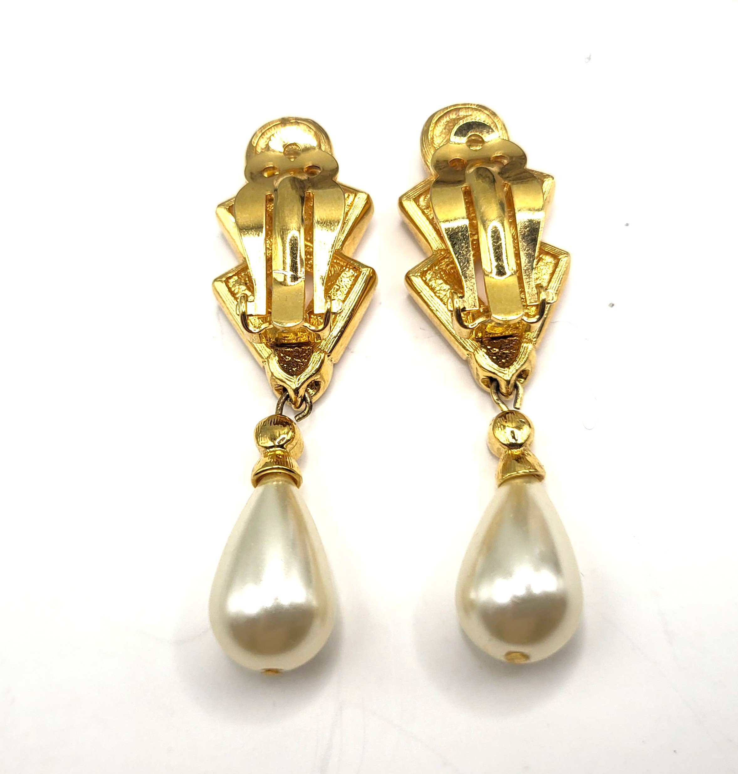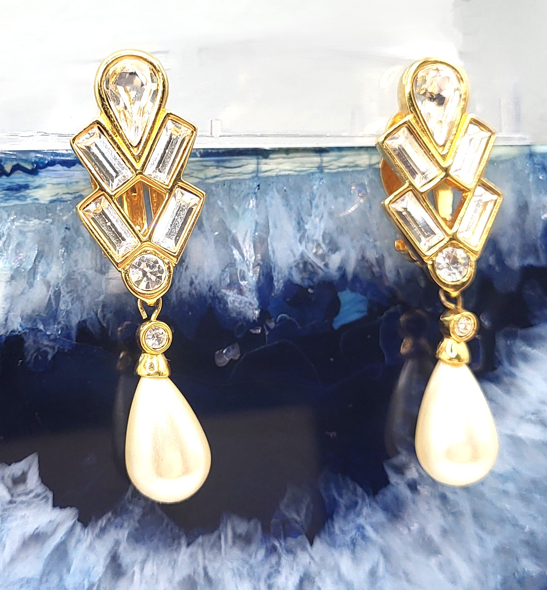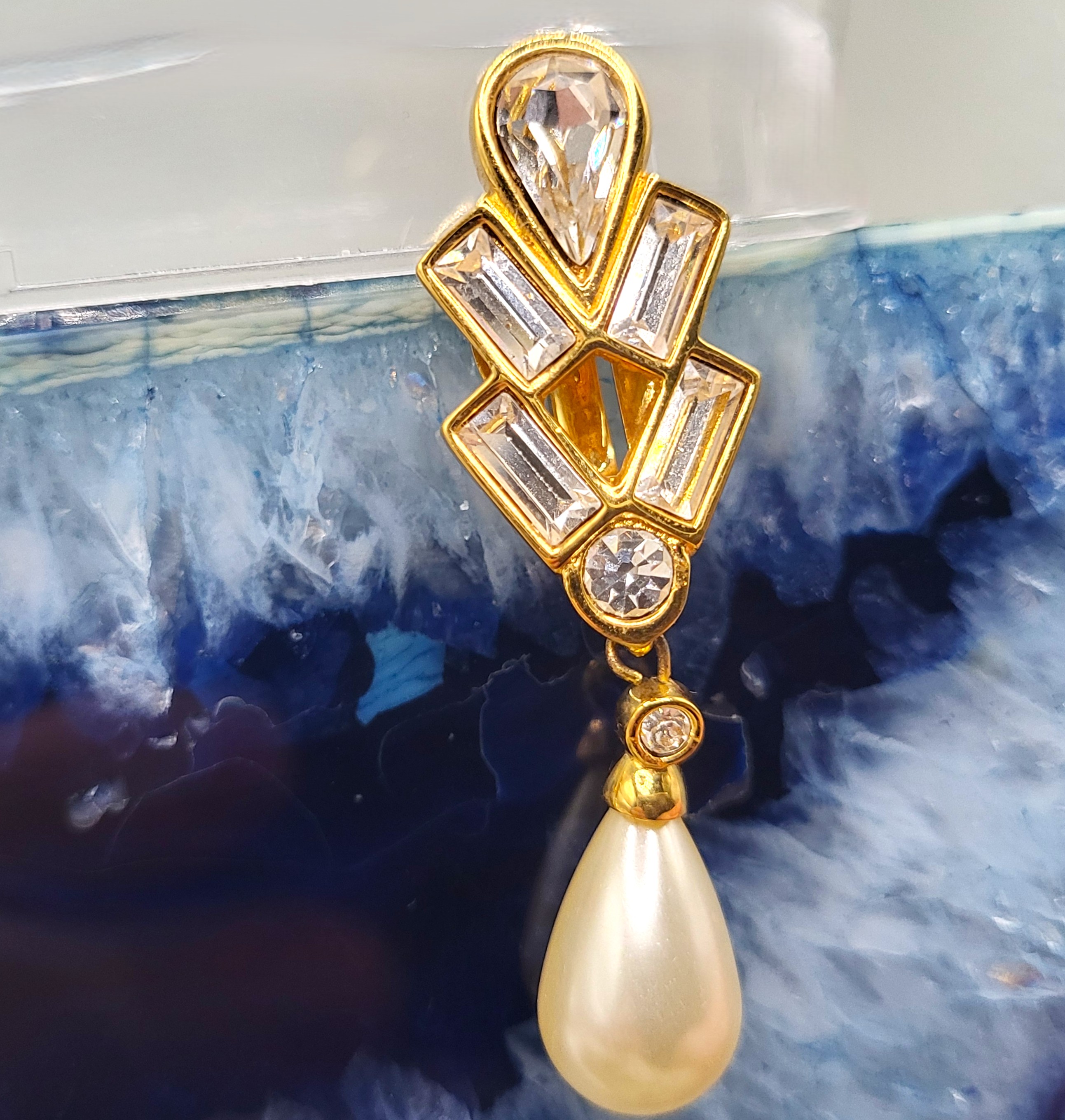This is a pair of vintage Swarovski (c) chunky gold-tone earrings with dangling faux baroque pearls. The earrings feature emerald-cut, clear Swarovsky crystals and they hang 2". The earrings attach to the earlobes with spring-loaded clips. They can be worn on unpierced ears. The earrings appear like new, however there is no original box. AdminCode: AZ6/ir