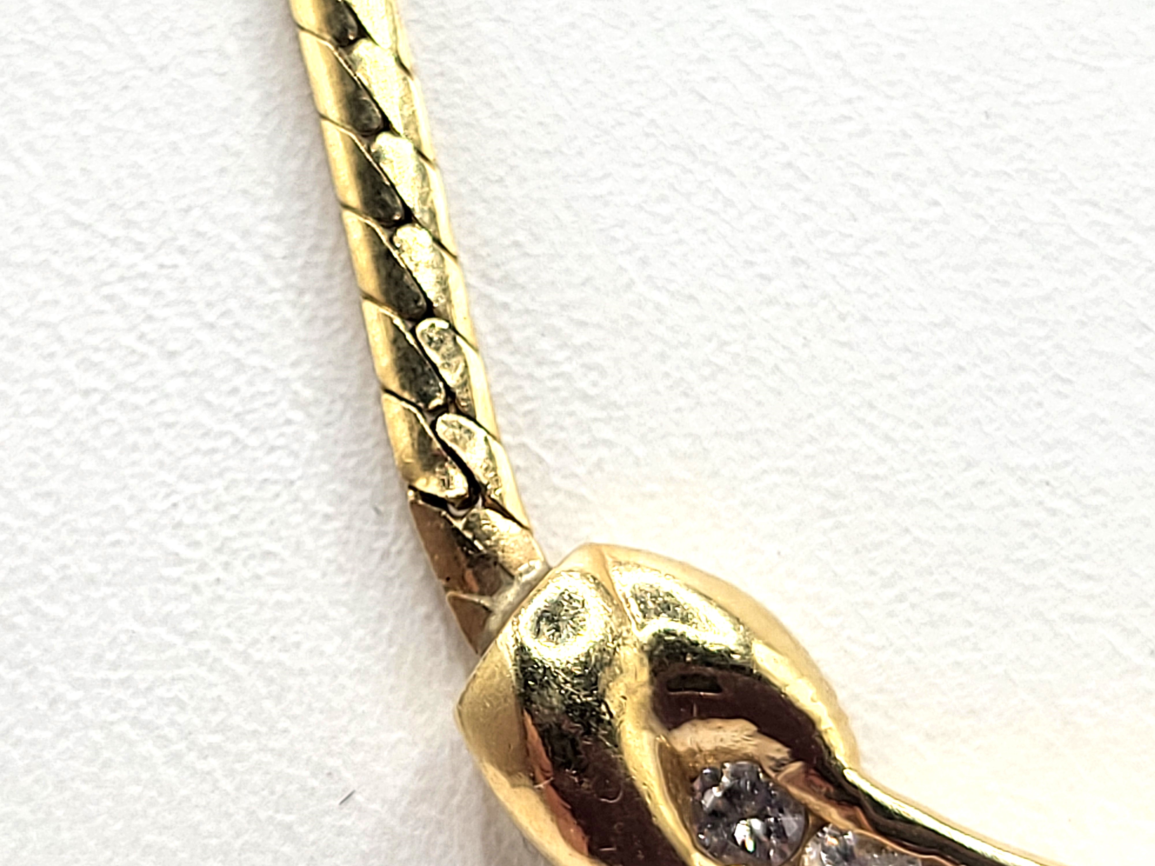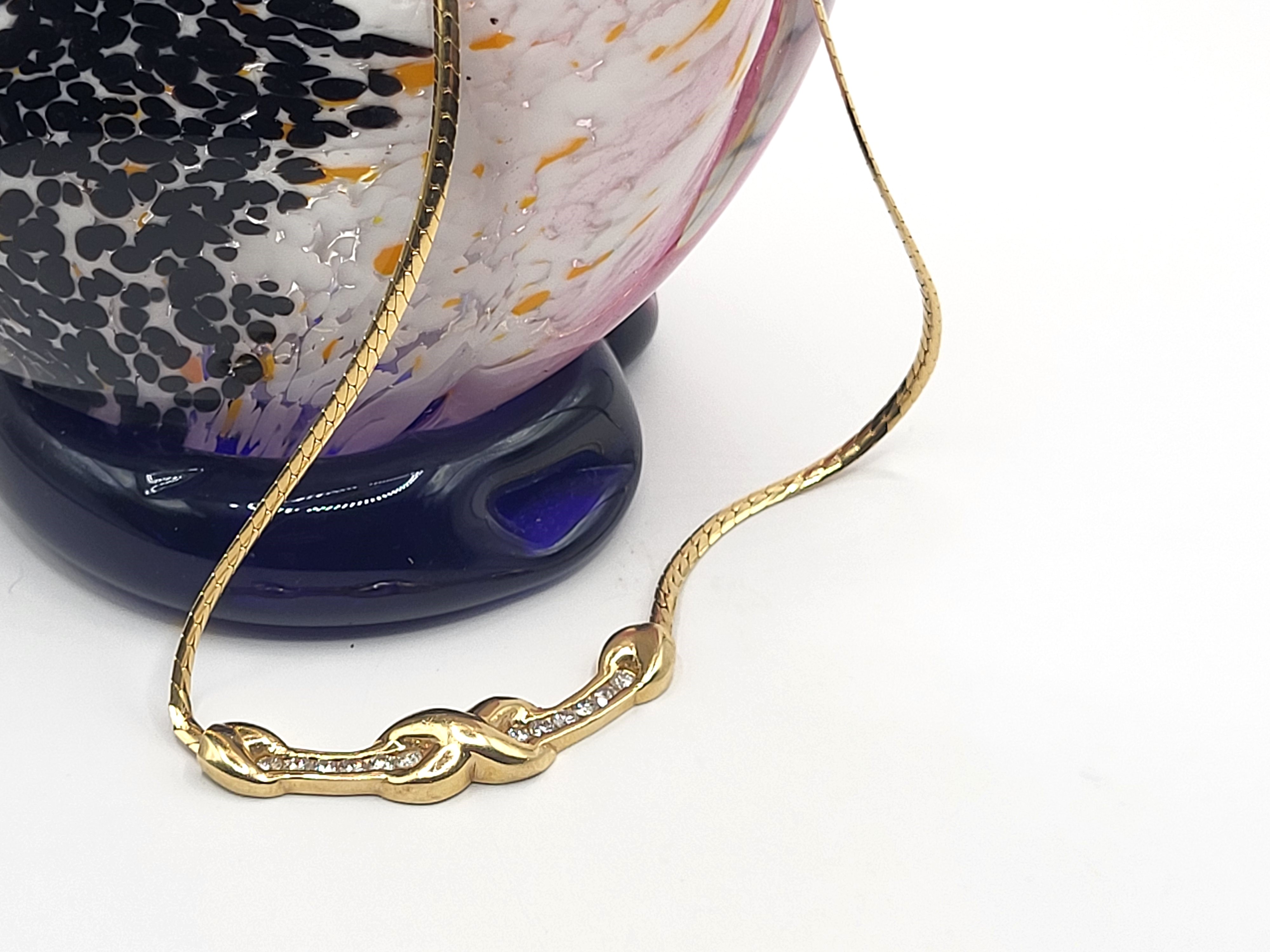 This is a very elegant 14 karat yellow gold necklace that features .66 carats total weight round, brilliant-cut, G-H color, SI2-I1 clarity diamonds along the curved bar with the “X” kiss. The bar is stationary/static on the flat cobra chain. The entire necklace is 17″ long with a spring ring. . Admin: G11241/12tit