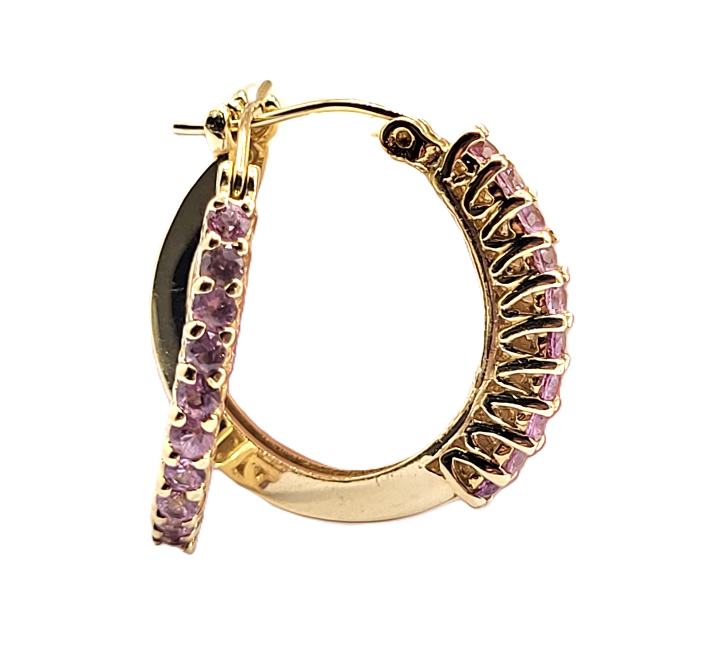 What a great pair of earrings for everyday wear! They are a modest size, at 3/4″ diameter, yet sturdy, at 2mm wide and 2.38mm thick. These 14 karat yellow gold earrings have .85 carats total weight of round faceted, prong-set, genuine pink sapphires along the fronts. These earrings attach to the earlobe with hinged posts that lock in the back. Both earrings have a very solid “snap” upon closing! This is a brand new item with manufacturer’s approval to sale in a public auction. It is in excellent condition, but may have fine scratches from shipping or storage. 4.44g Admin: G11241/33iit