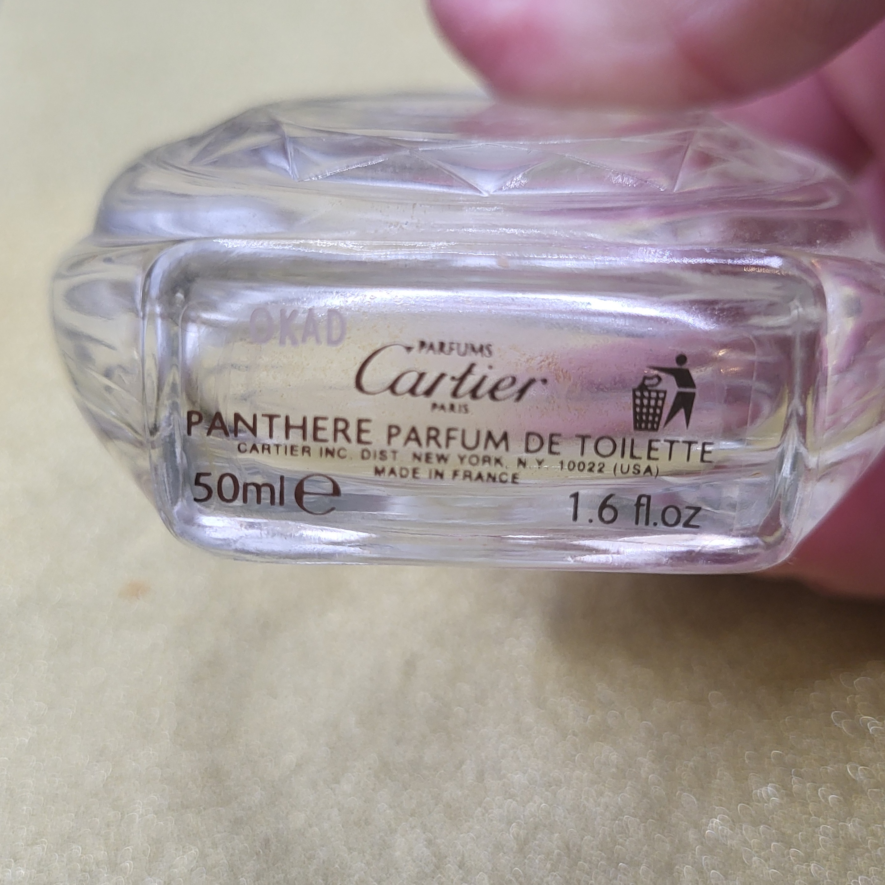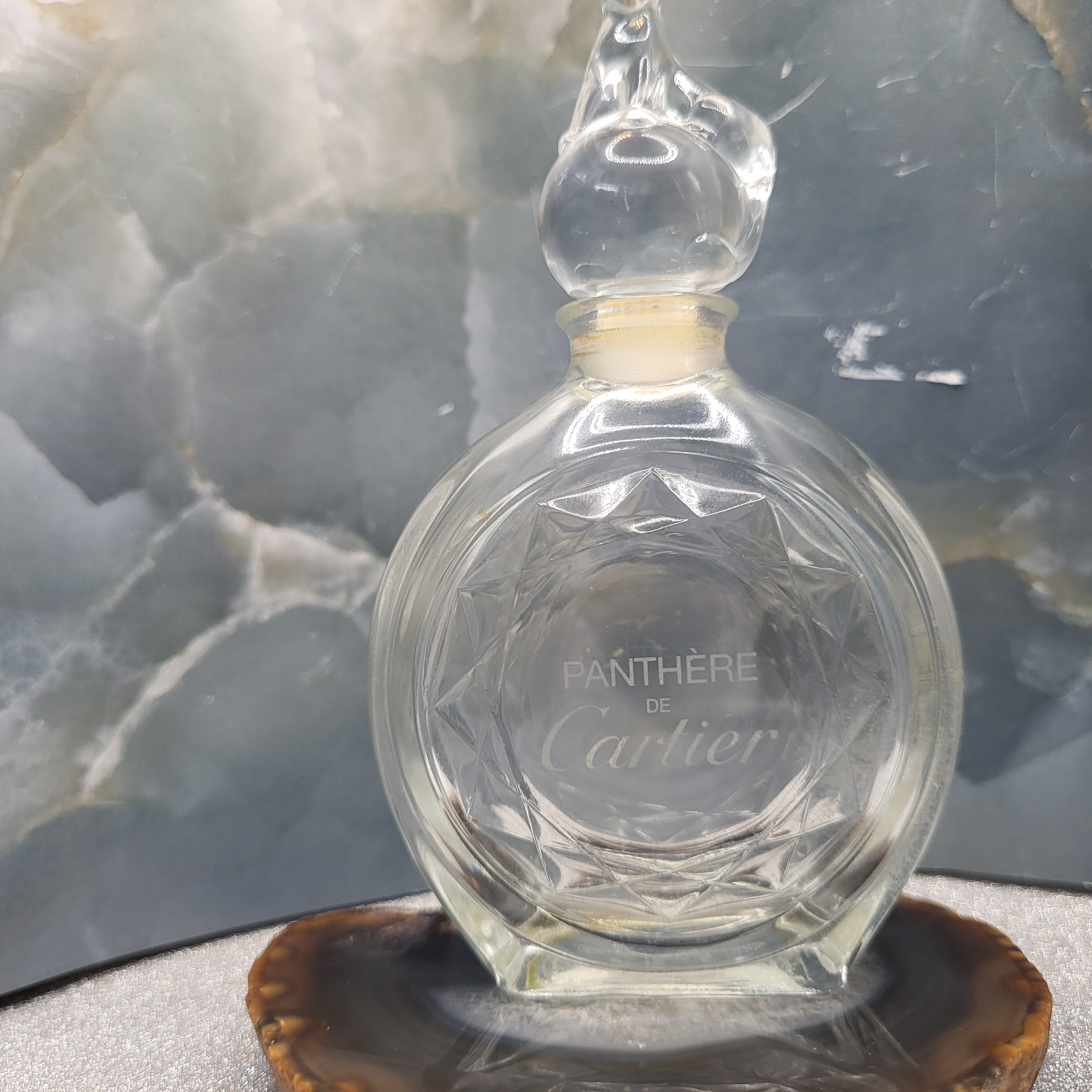 This is an authentic empty decanter-style bottle that once held mL of Eau de Toilette Pantere’ by Cartier of France. The glass decanter-style bottle is desired by collectors for the iconic Cartier panther on the stopper top, which is in excellent condition. The date code on the bottom indicates this bottle was made in 2000 or 2010. The original owner states it was purchased approximately in 2002. AdminCode: CAJ1/ne