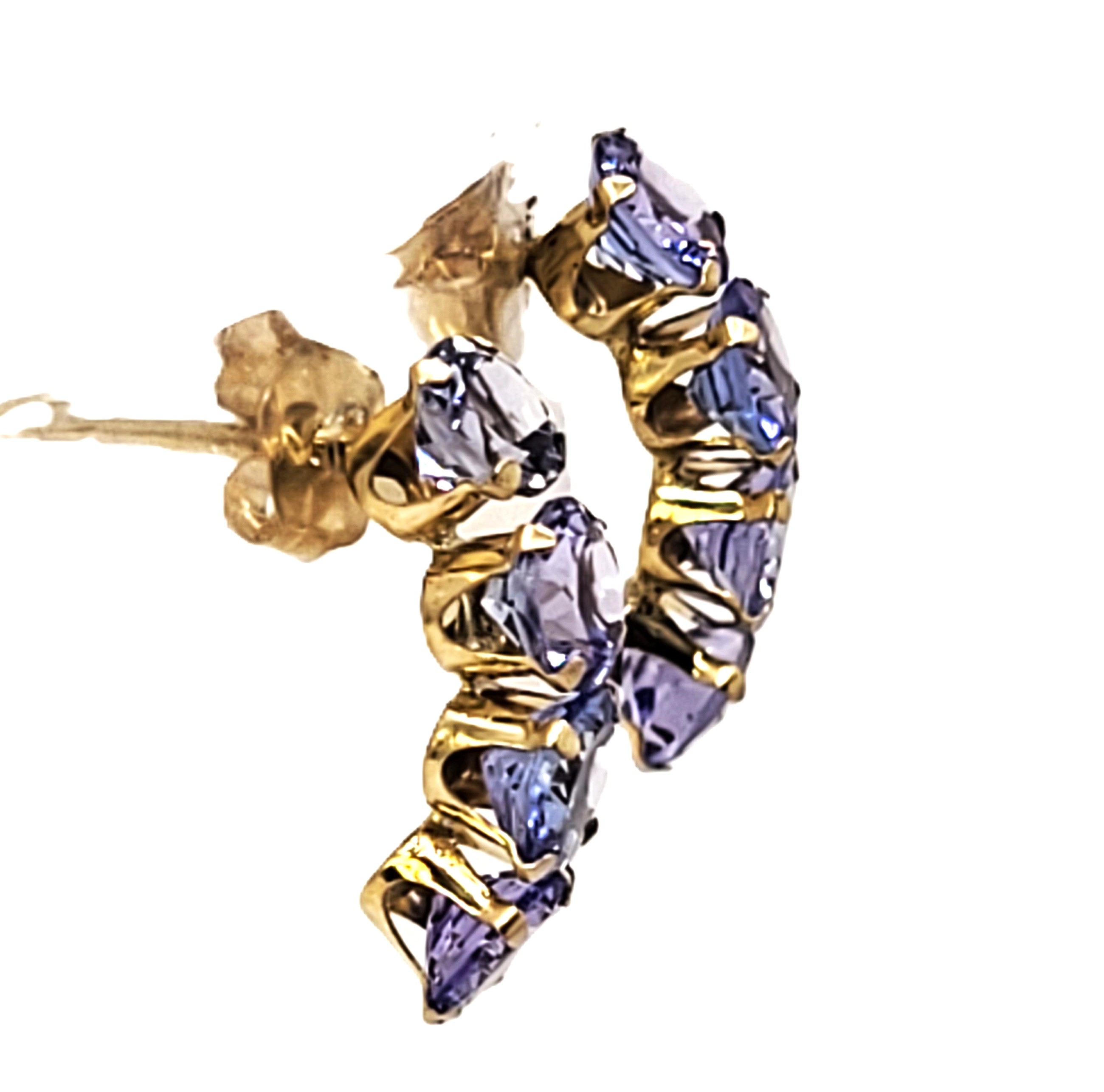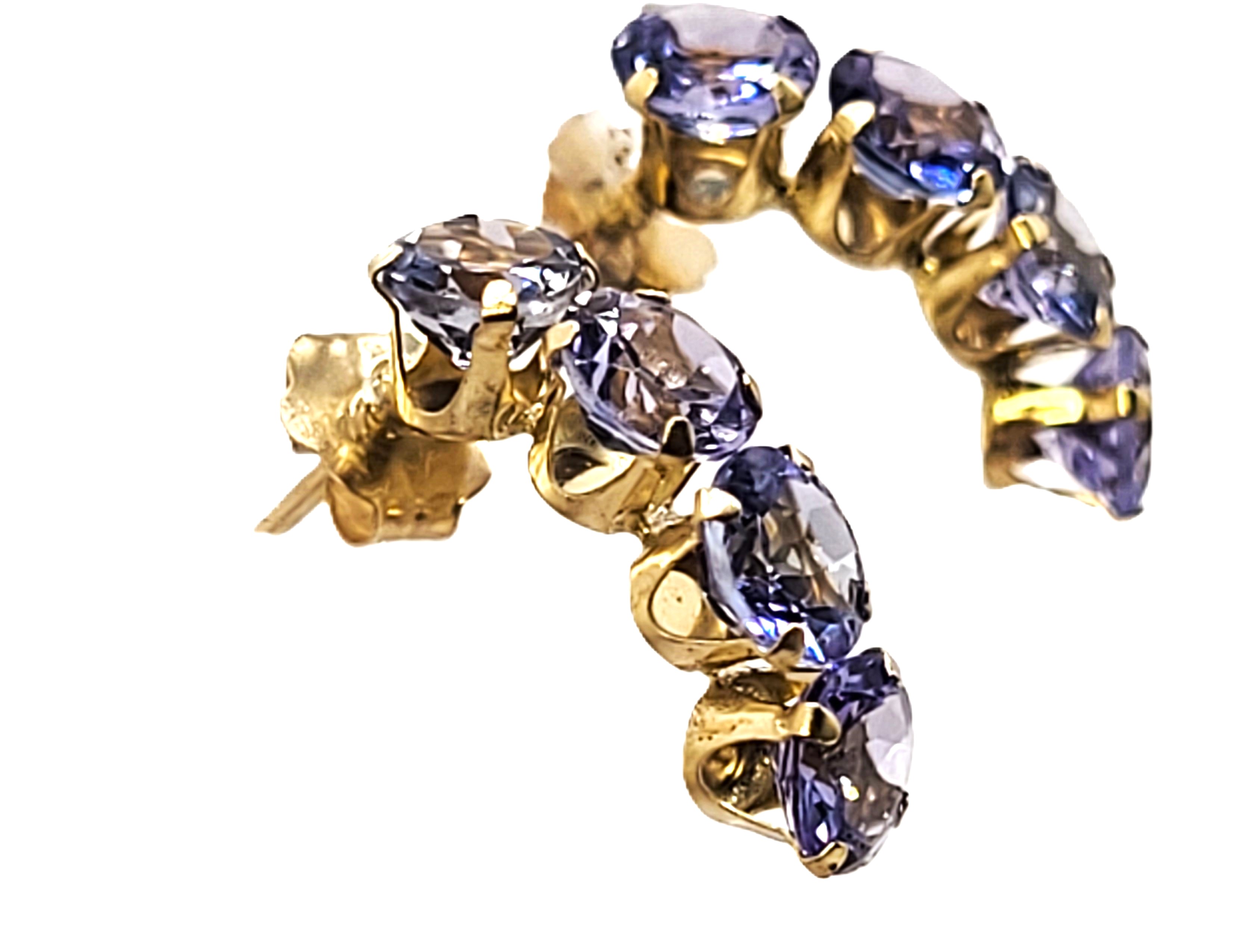 These 14 karat yellow gold earrings feature 2.00 carats total weight of round, faceted, prong-set, genuine tanzanite that are the perfect color for either winter or summer! They are approximately 5/8″ long and 3/16″ wide and attach to the earlobe with posts and friction backs. .79 grams Admin:G11241/29brt