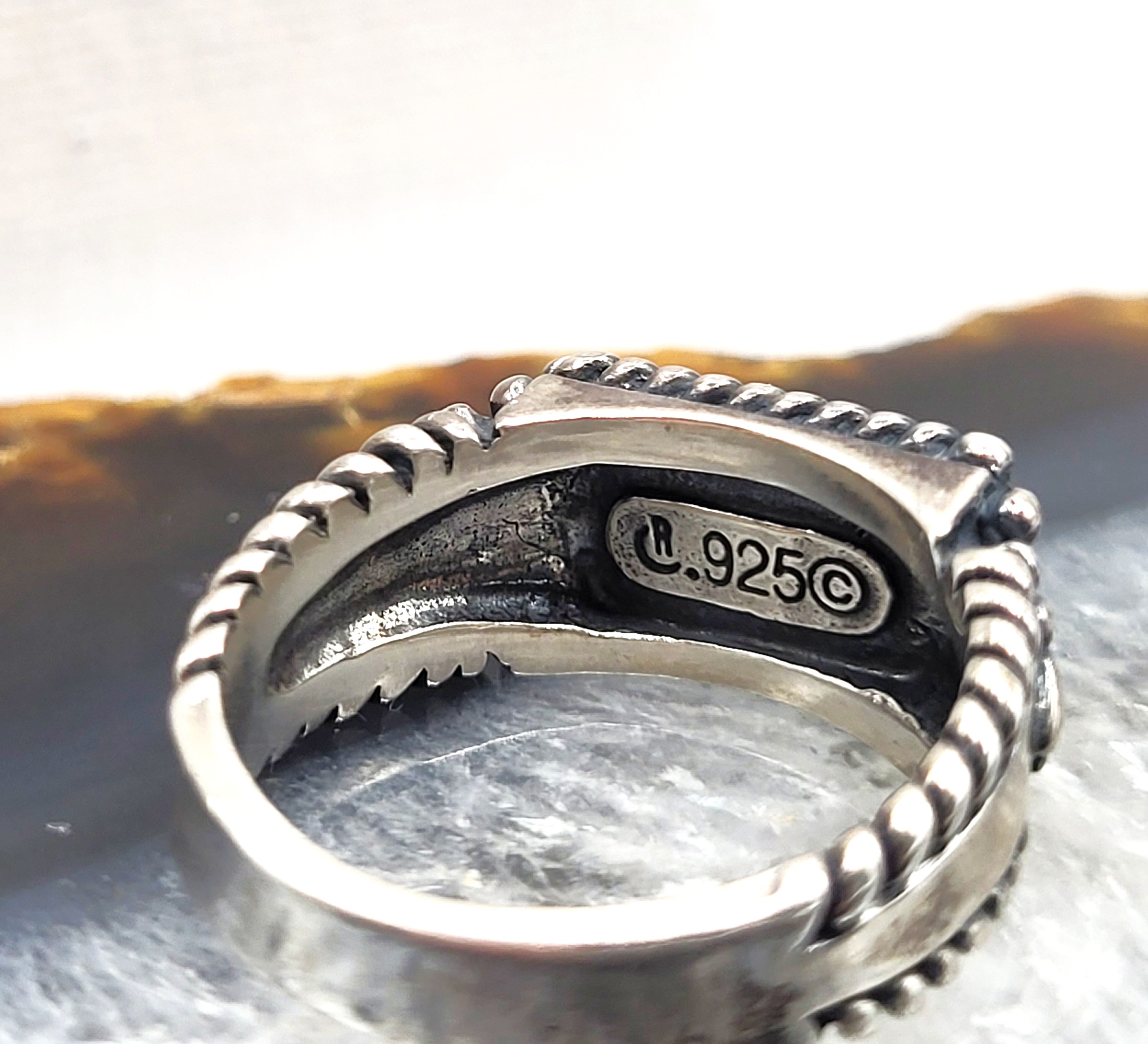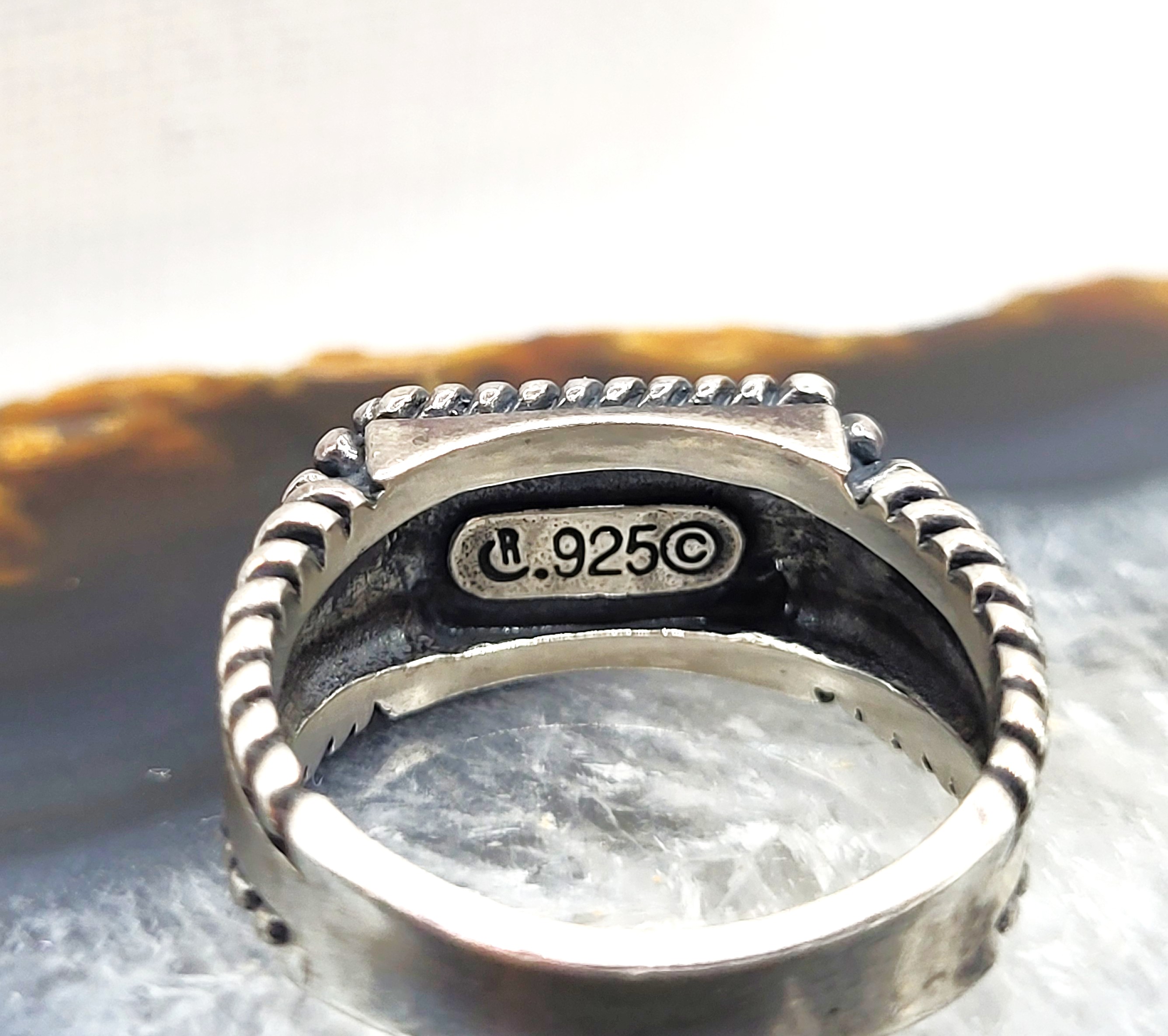 This sterling silver ring design precedes the ‘stacker’ style ring by decades, but it is so simply sophisticated and modern, it may just as well be called a stacker ring. Cast in sterling silver and set with an approximate 8mm x 3mm elongated cabochon of genuine* turquoise, the ring is subtly decorated with iconic Southwestern designs. Abraided borders accentuates the turquoise and the smooth tapered shank has epaulette shoulders and twisted rope borders. The ring is US size 8. The under gallery bears the Caroly Pollock-Relios hallmark and sterling silver mark. AdminCode: 33120/16.i