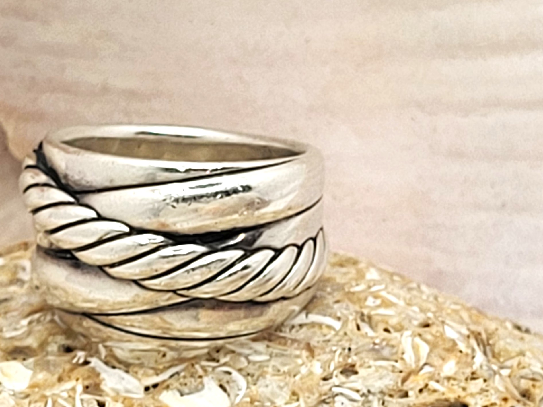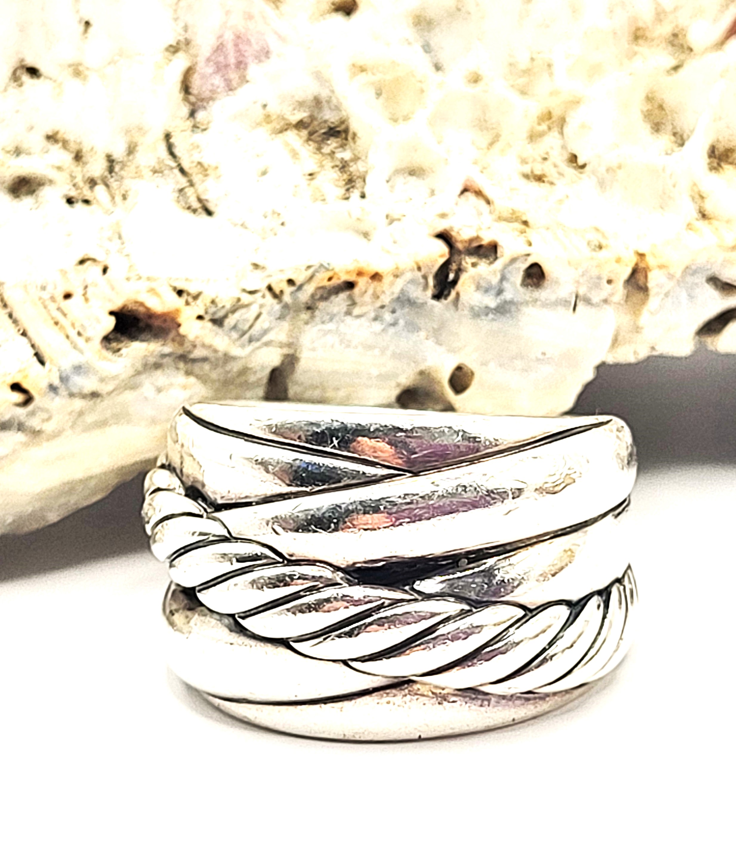This David Yurman band is crafted from sterling silver with iconic twisted cable crossing smooth bands on the approximate 15.35mm wide top surface that tapers to an approximate 9mm shank. This ring bears the D.Y. hallmark for David Yurman. It is approximately US size 8.25 and can be sized at an additional cost. If sizing is requested, the skilled jeweler who provides the service is a master jeweler and will size this ring without removing the D.Y. hallmark. Admin: 1226/8hhh