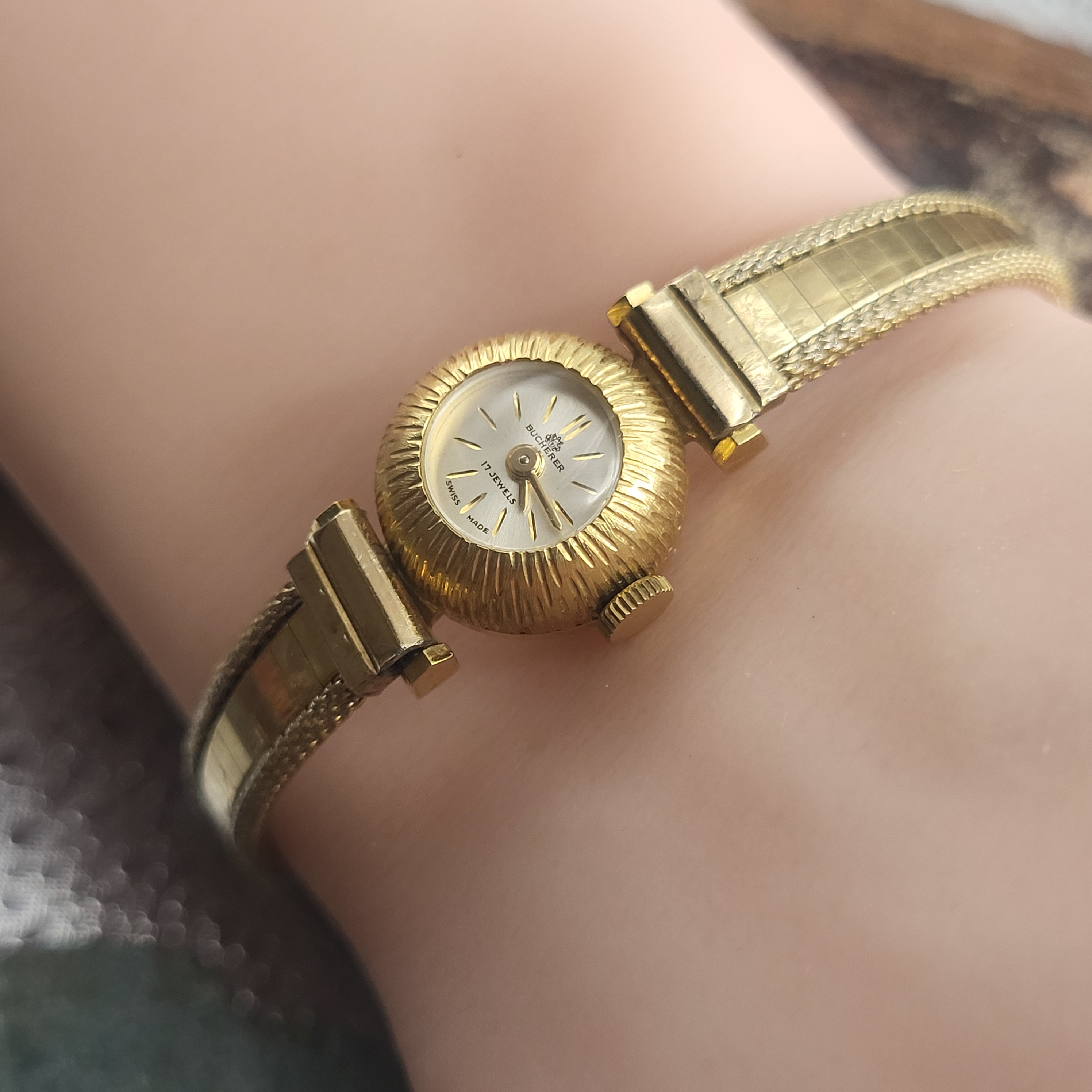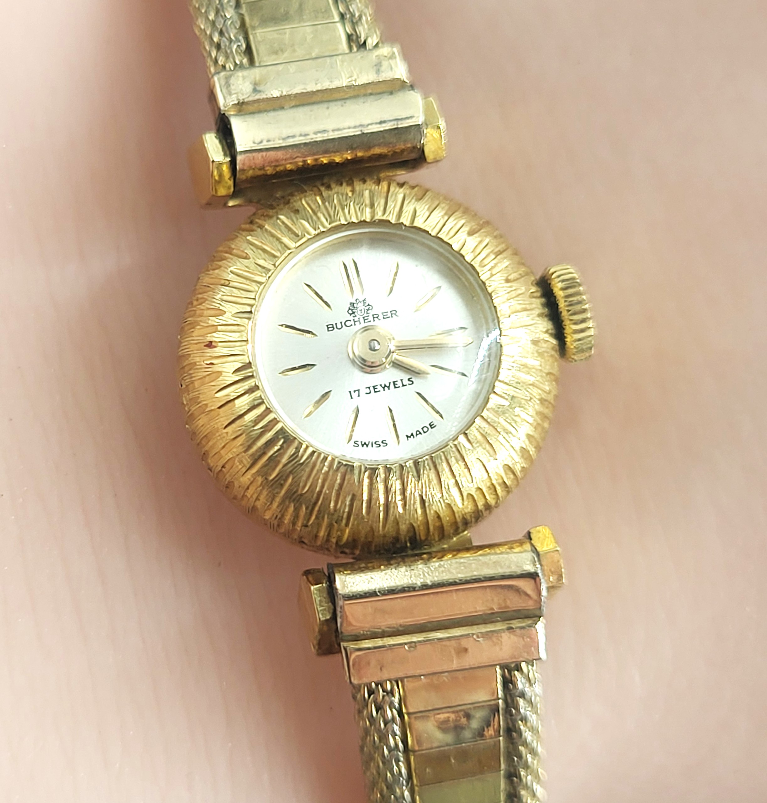 This is a wonderful example of mid-century class and style. A dainty gold-colored bracelet styled for the 1940’s and 1950’s, holds a smalll, round, wristwatch that is only 15mm in size plus the crown. The button-shaped case has a diamond-cut finish that contrasts with the smooth silver dial, where batons mark the hours. The slightly bubbled, plastic crystal is in excellent condition. The case, back, crown, kugs and dial test as 18 karat gold. The back is stamped with an identifying number. The watch runs when wound, but needs a service. AdminCode: AZM