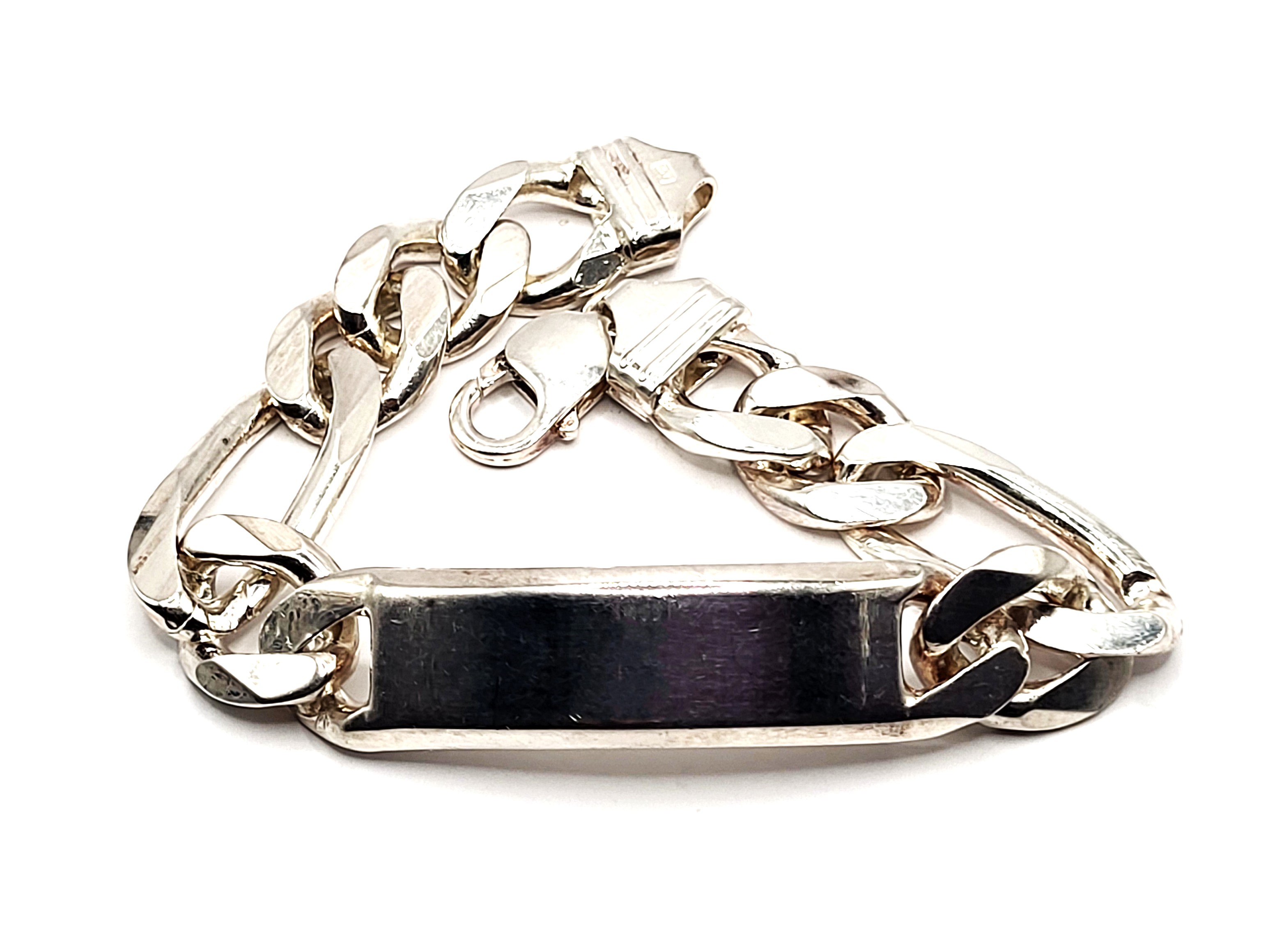 This is a very heavy sterling silver ID bracelet that is 8.25″ long and has a lobster clasp. The convex, engravable plate is approximately 2″ long, 5/8″ wide, and 4.25mm thick. The figaro links are approximately 17mm wide. Admin: 33120/3ae