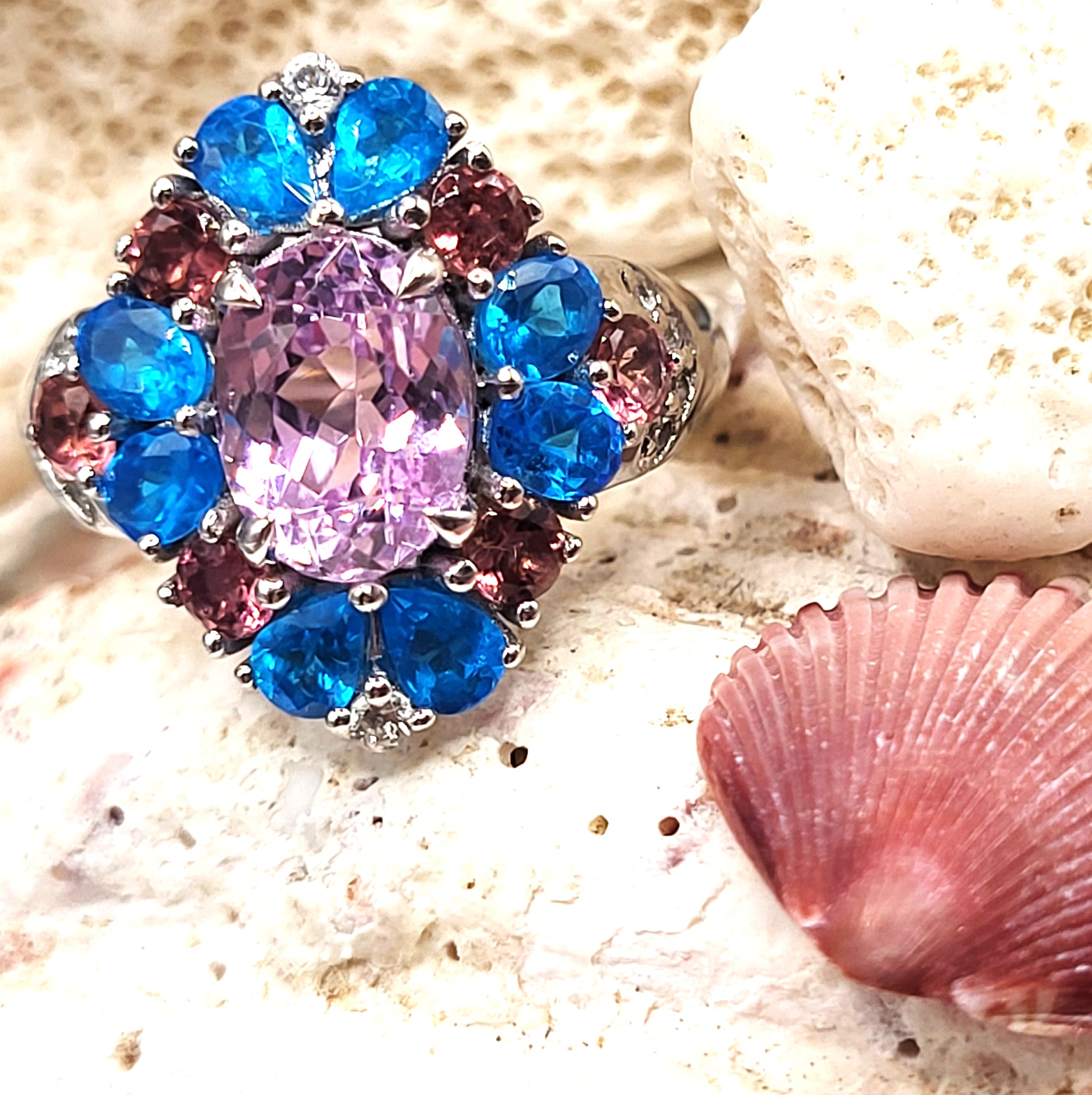 Sterling silver (.925) ring featuring a 12.10 carat oval kunzite in soft lavender-pink hues, accented by 1.16ctw neon apatite, .58ctw pink tourmaline, and .25ctw natural white zircon. Round, faceted stones create a vivid halo of color and sparkle. Ring size: US 7. A joyful, high-impact piece for gemstone lovers and collectors.This ring is US size 7 and weighs 5 grams. See sizing options and other important information below. AdminCode: 6282/28-gr