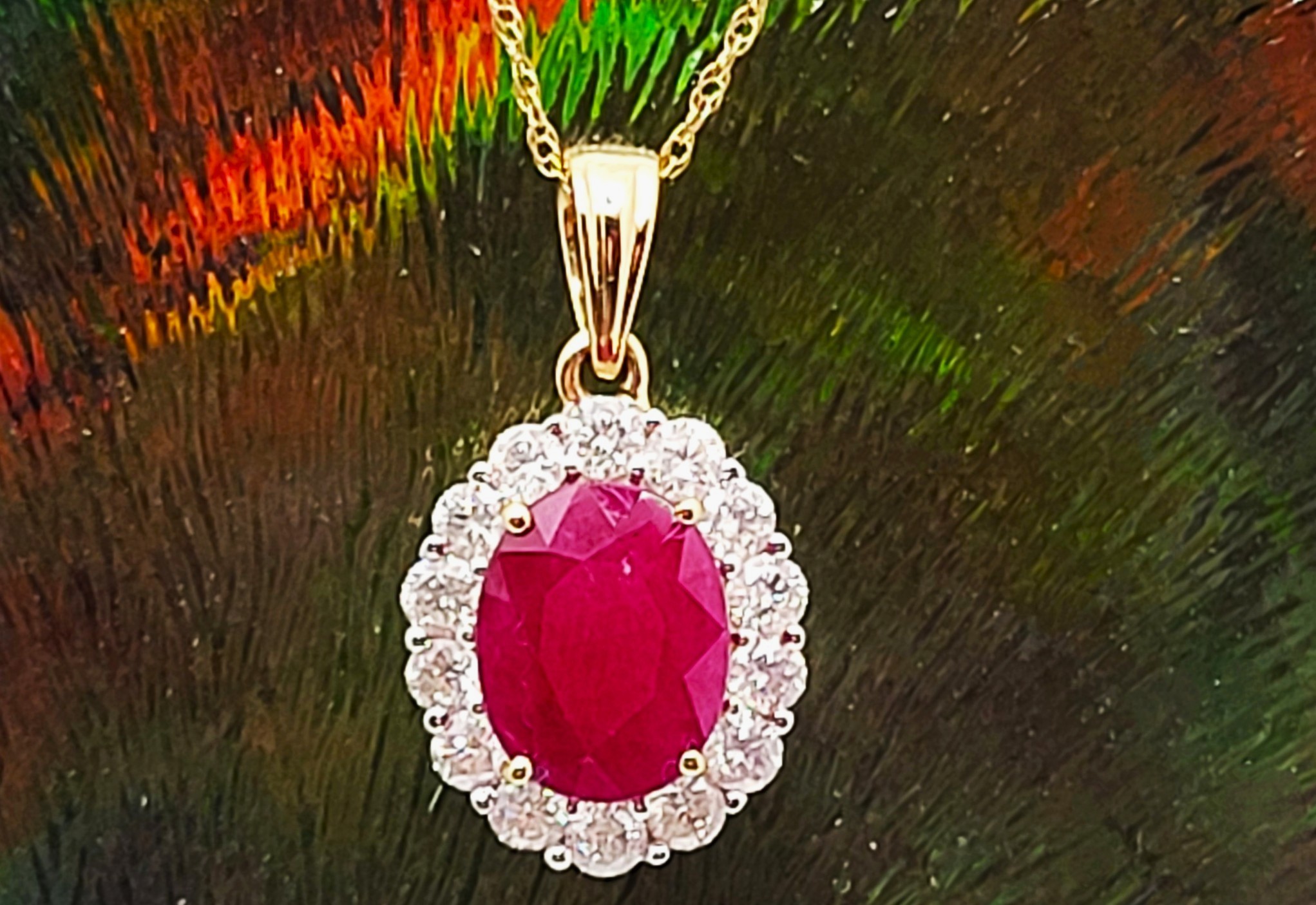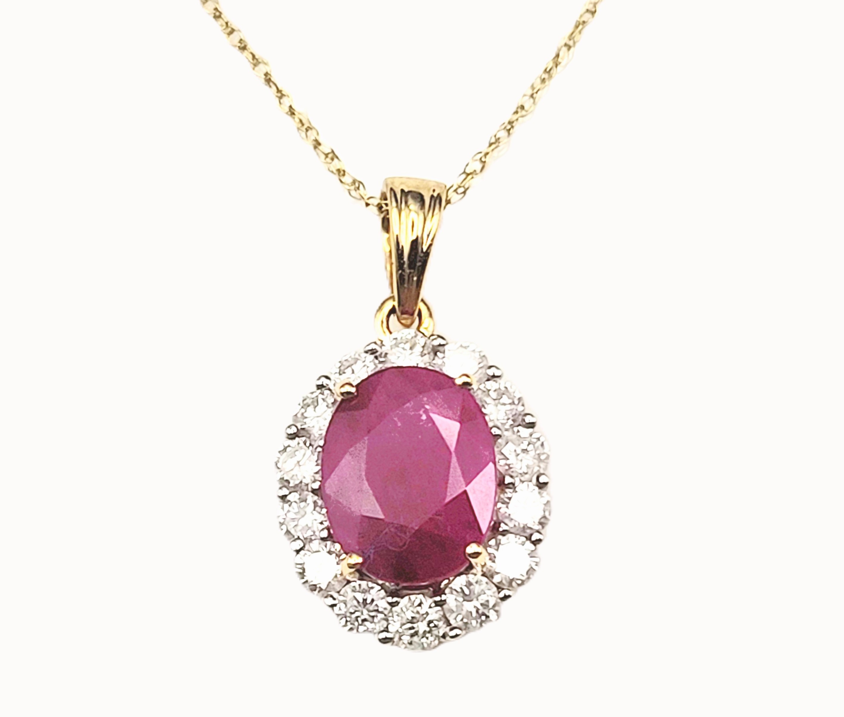Burma rubies have long been considered one of the most treasured gemstones. So, perhaps you can treasure this 18 karat yellow gold necklace that features a semi-translucent, 2.00 carat oval-cut, genuine Burma ruby* that is prong-set in a halo of .56 carats round, brilliant-cut, H-I color, I1 color, natural diamonds. The pendant has an open back, and a raised rib gallery for support. The solid bail is attached to a fixed ring at the top of the pendant and can accommodate up to an approximate 2.75 mm chain. The pendant currently hangs from an 18 karat yellow gold, ultra-fine rope chain that is 18" long with a lobster clasp.Admin: Q5743/19-brrr – *This ruby is assumed to be heat-treated, the most common method of treating over 95% of marketable rubies.