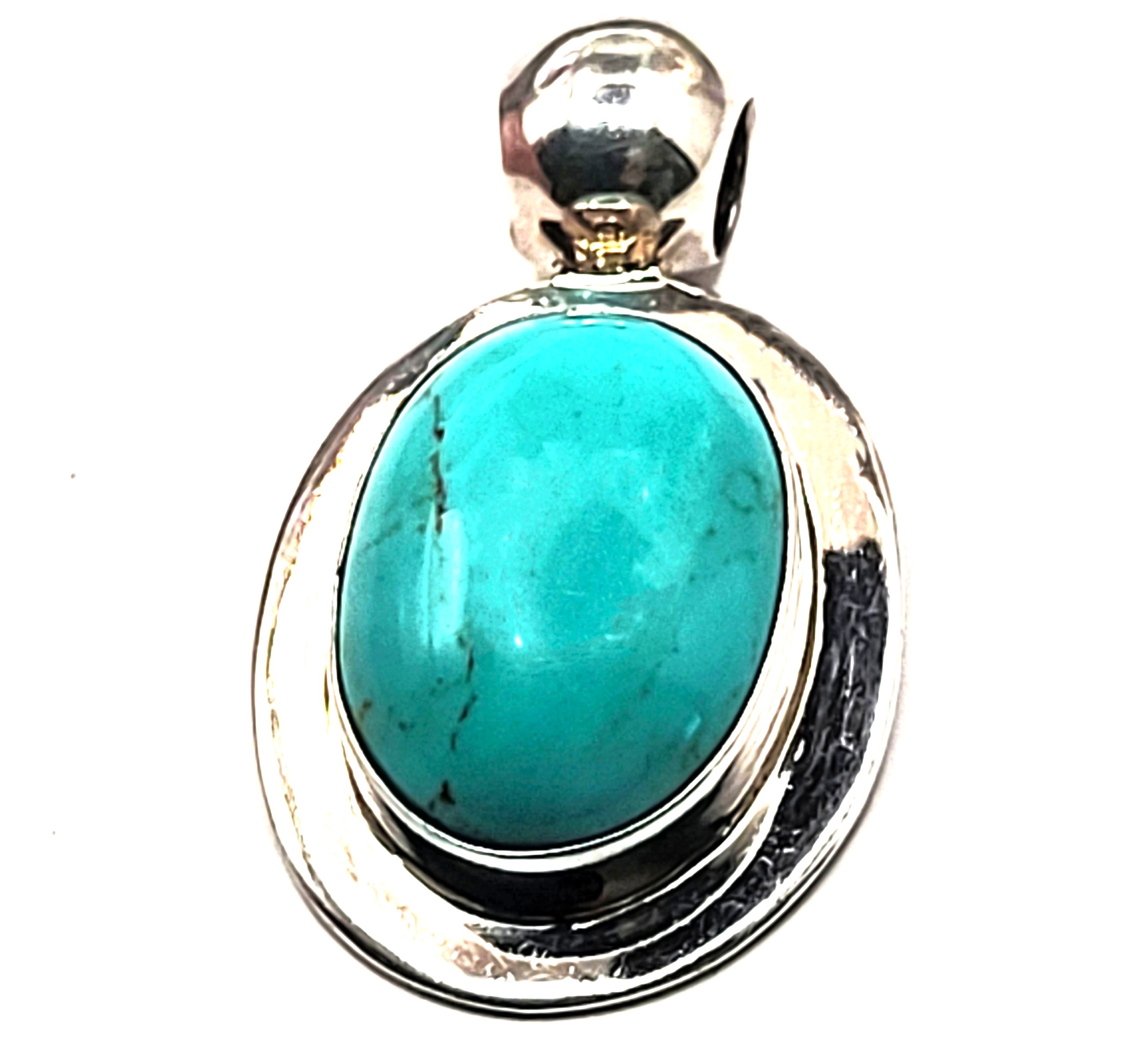 This sterling silver pendant features a bezel-set, vibrant, polished cabochon turquoise* that measures approximately 24mm x 18mm x 8mm for a possible 22 carats gemstone. The bezel setting has a firm, shiny silver frame/base, and at the top is an affixed bead-style slider bail. The bail is 12mm and can accommodate an approximate 5.5mm wide chain. The entire pendant is approximately 1 7/8″ x 1 1/8″. 16.9 grams. Admin: 33019/ – wr
