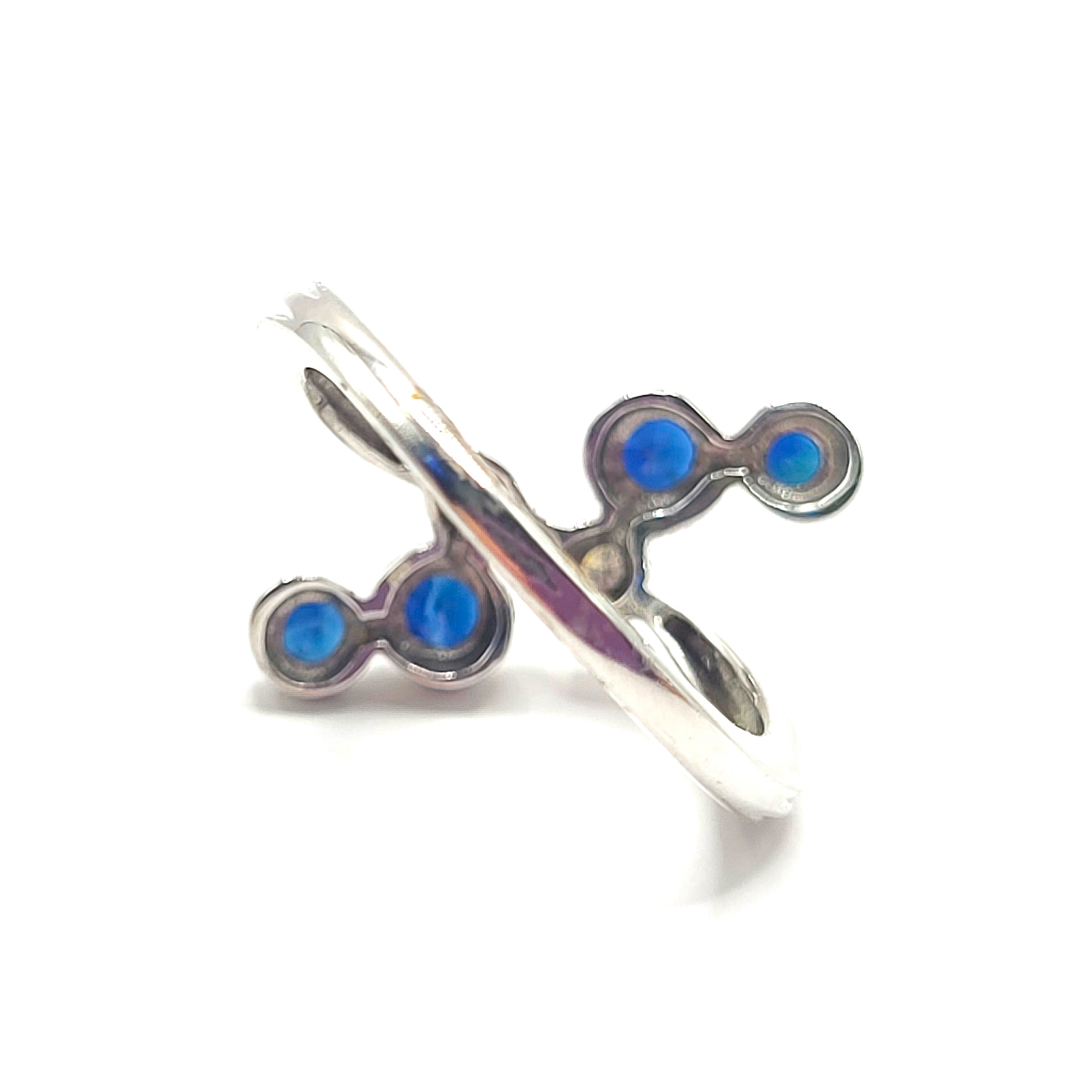 This is a 14 karat white gold ring with approximately .67 carats total weight of round, faceted, genuine blue sapphires set into milgrain bezels with approximately .08 carats total weight round, brilliant-cut, H-I, SI2 clarity diamonds also in milgrain bezels forming a staggered line. The ring is size 6.75 and 3/4″ long between the knuckles. It can be sized for an additional charge. Please contact Bidfair Fine Jewelry for sizing details. 4.3g Admin: 33109/16lhg