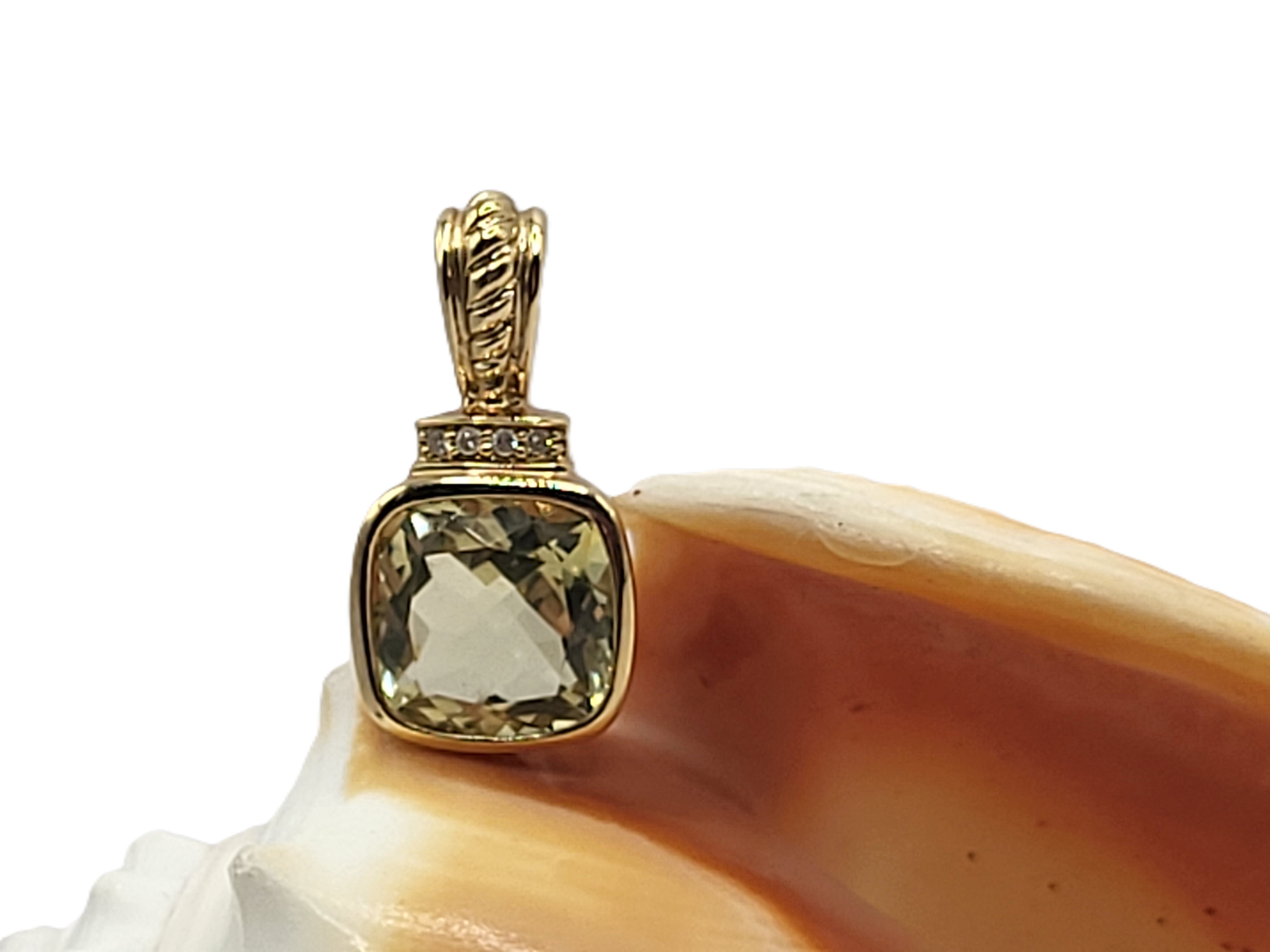 This is a 14 karat yellow gold pendant that features an illuminating 3.36 carat cushion-cut, bezel-set lemon quartz and .02 carats total weight of round, brilliant-cut, H color, SI2-I1 clarity diamonds for accent along the topl The pendant has a solid bail with a gold bead finish that can accommodate an approximate 2.5mm wide chain. 2.2 grams