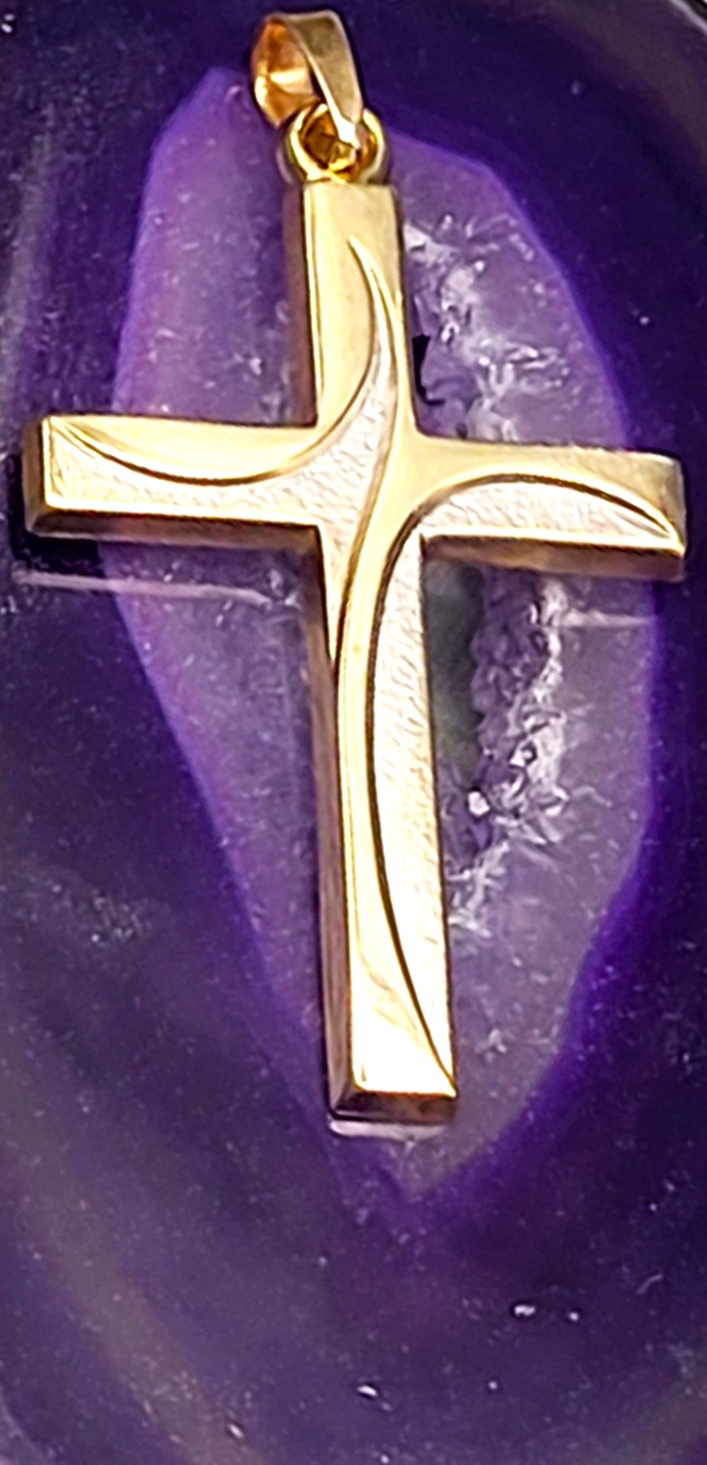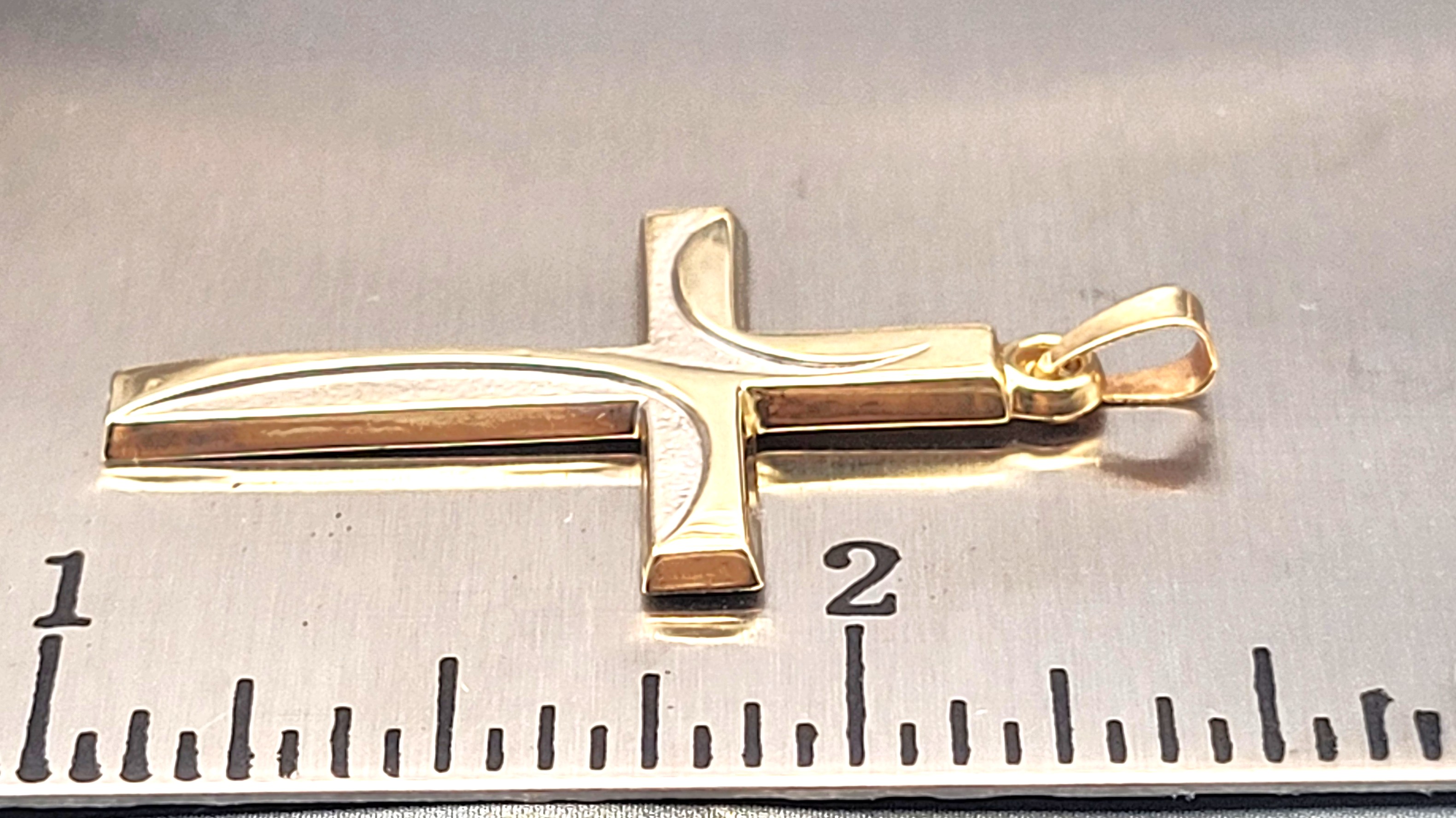 This 14 karat two-tone gold cross is modestly-sized, yet so attractive with the raised, swirled, bypass representation of the crucifix. The swirled design joins smooth, polished yellow gold with finely textured white gold. The cross is approximately 1.5″ x .75″ and has a solid bail that can accommodate an approximate 2.75mm chain. The pendant is stamped with the gold quality and hallmark on the back. Admin: TV4/og