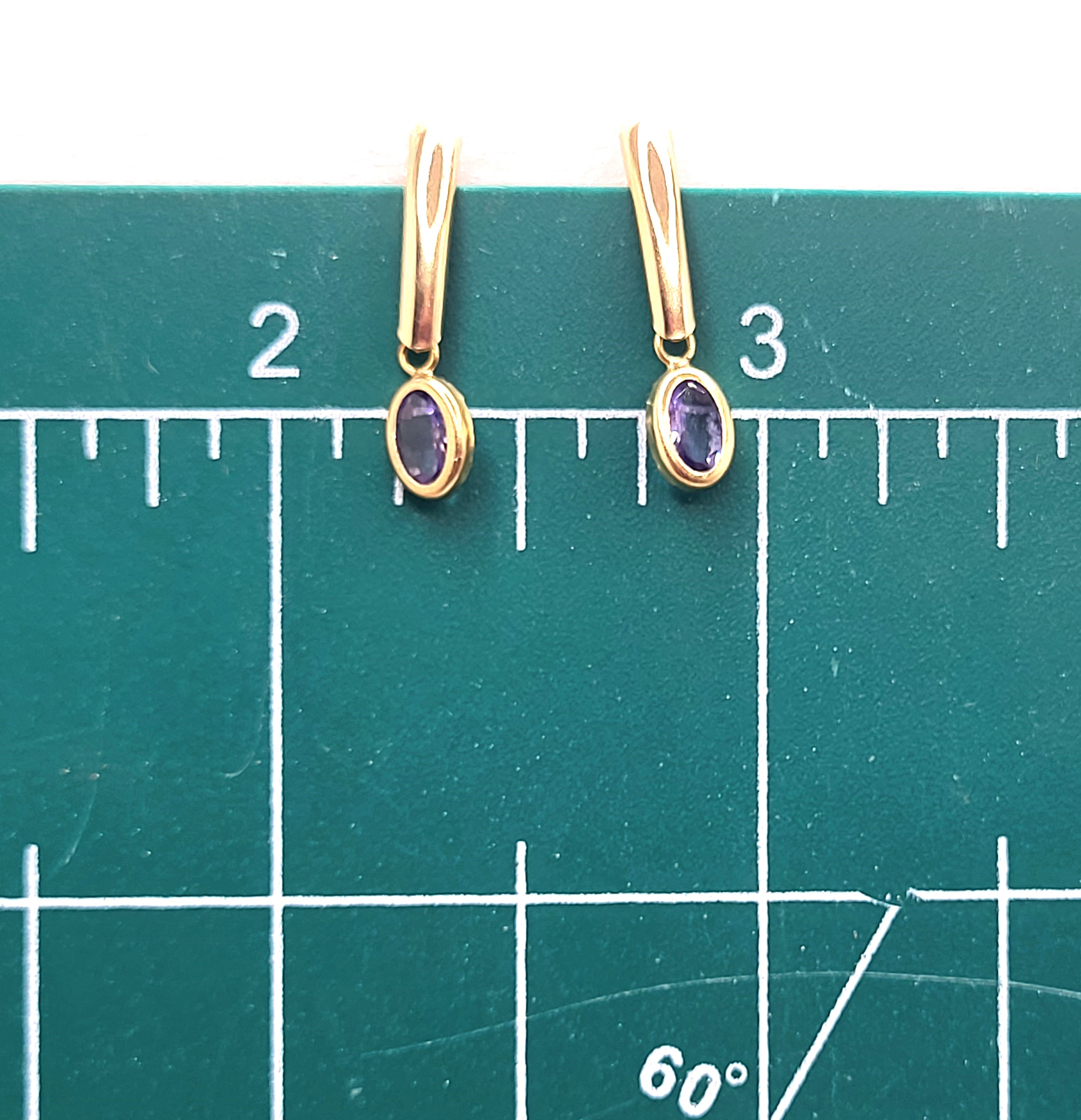 This is a pair of 14 karat yellow gold earrings that feature .90 carats total weight of oval-cut, bezel-set, genuine tanzanite and hang approximately 3/4″. The earrings attach to the earlobe with posts and friction backs. Admin: G11241/32blt
