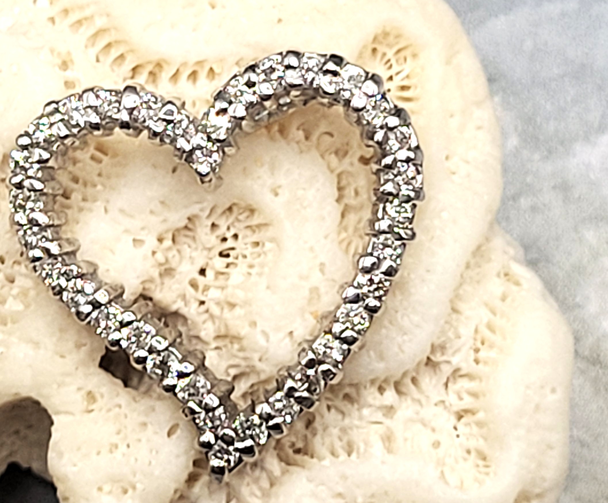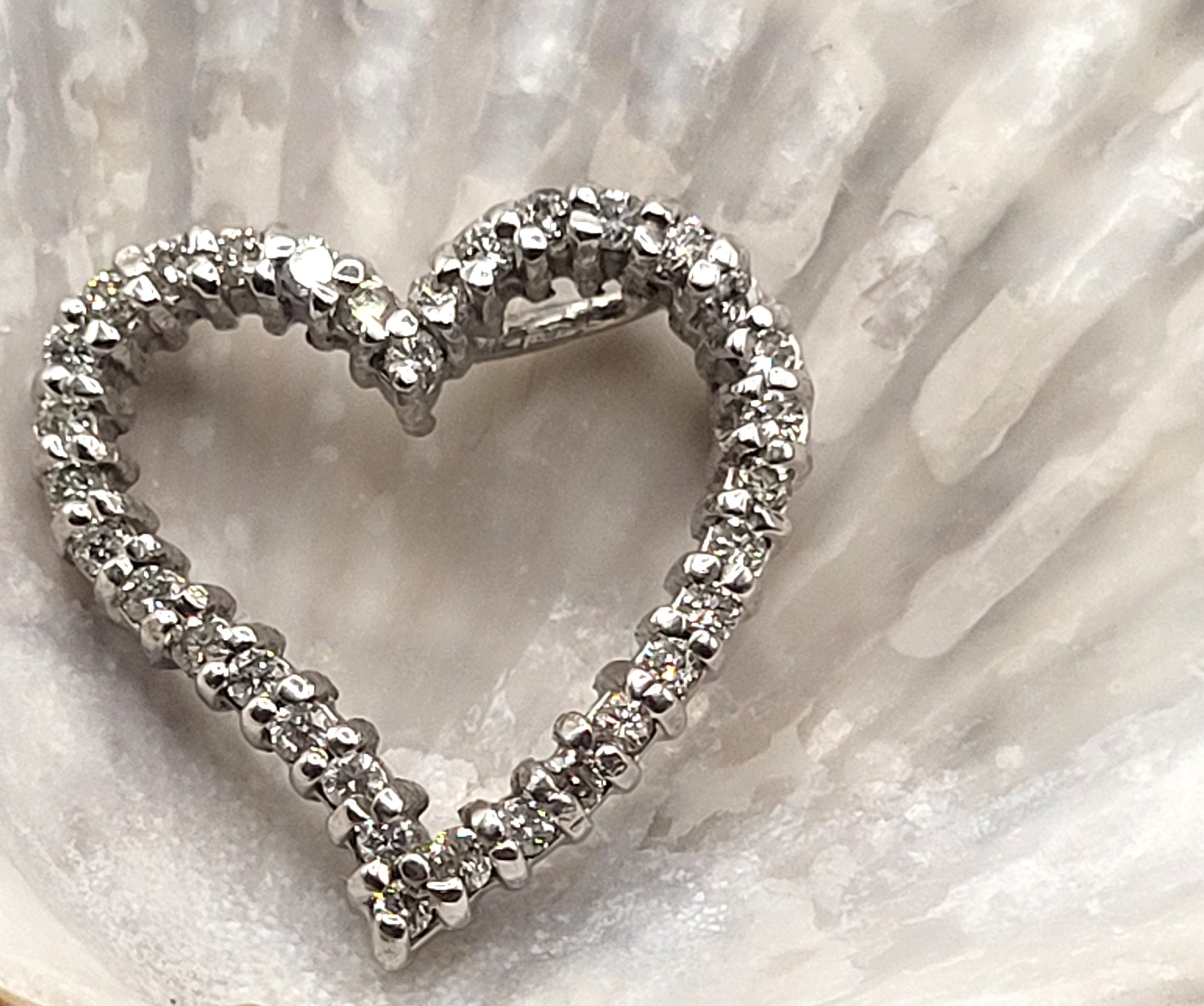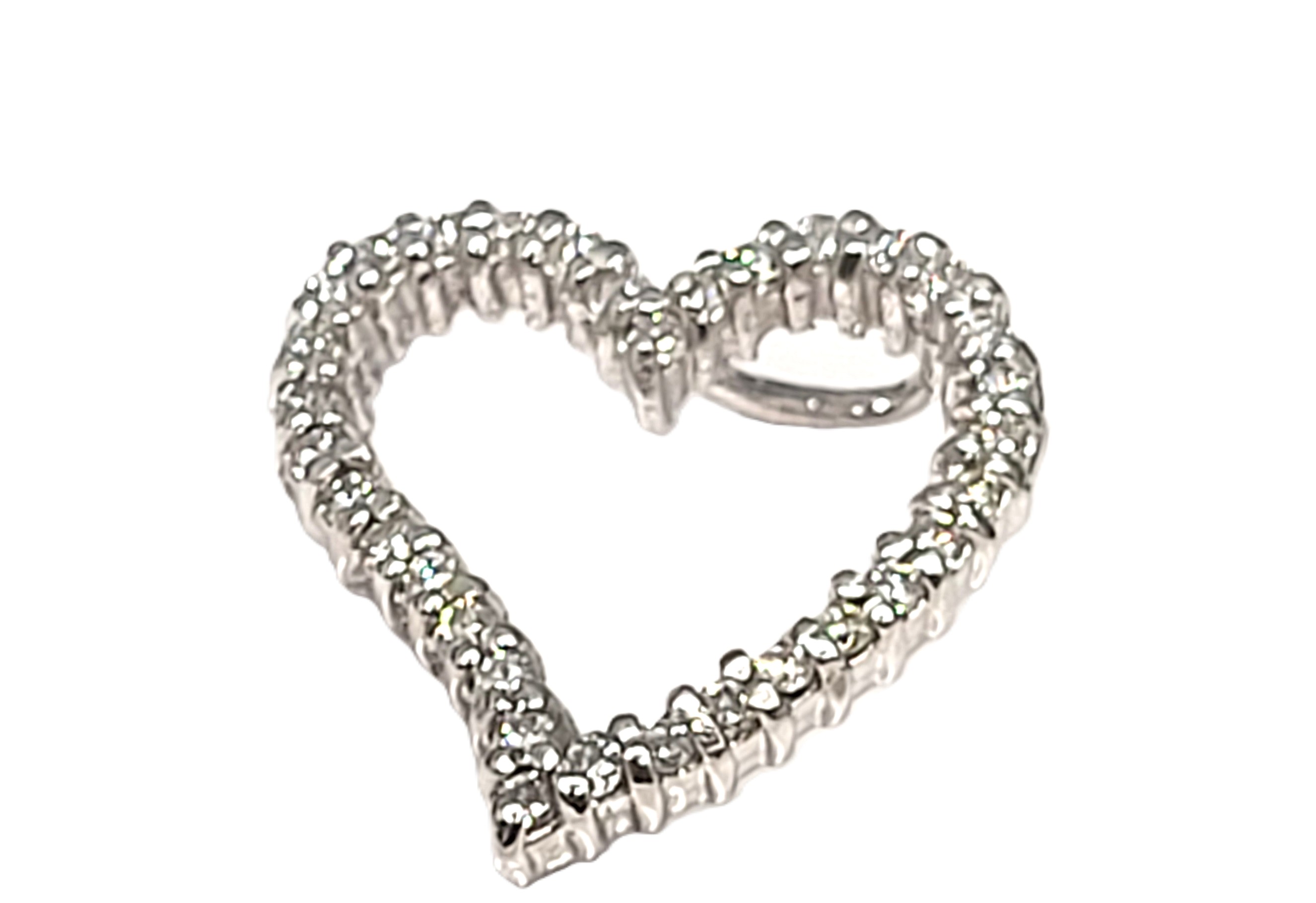 This is a 14 karat white gold heart-shaped pendant, set with .66 carats of round, brilliant-cut, I color, SI2-I1 clarity diamonds and two hidden bails that can accommodate an approximate 2.75mm wide chain. The heart is approximately 3/4" in diameter and has a curved sway and open center. This is a pendant only and does NOT include a chain. 2.96 grams Admin: G11241/16ett