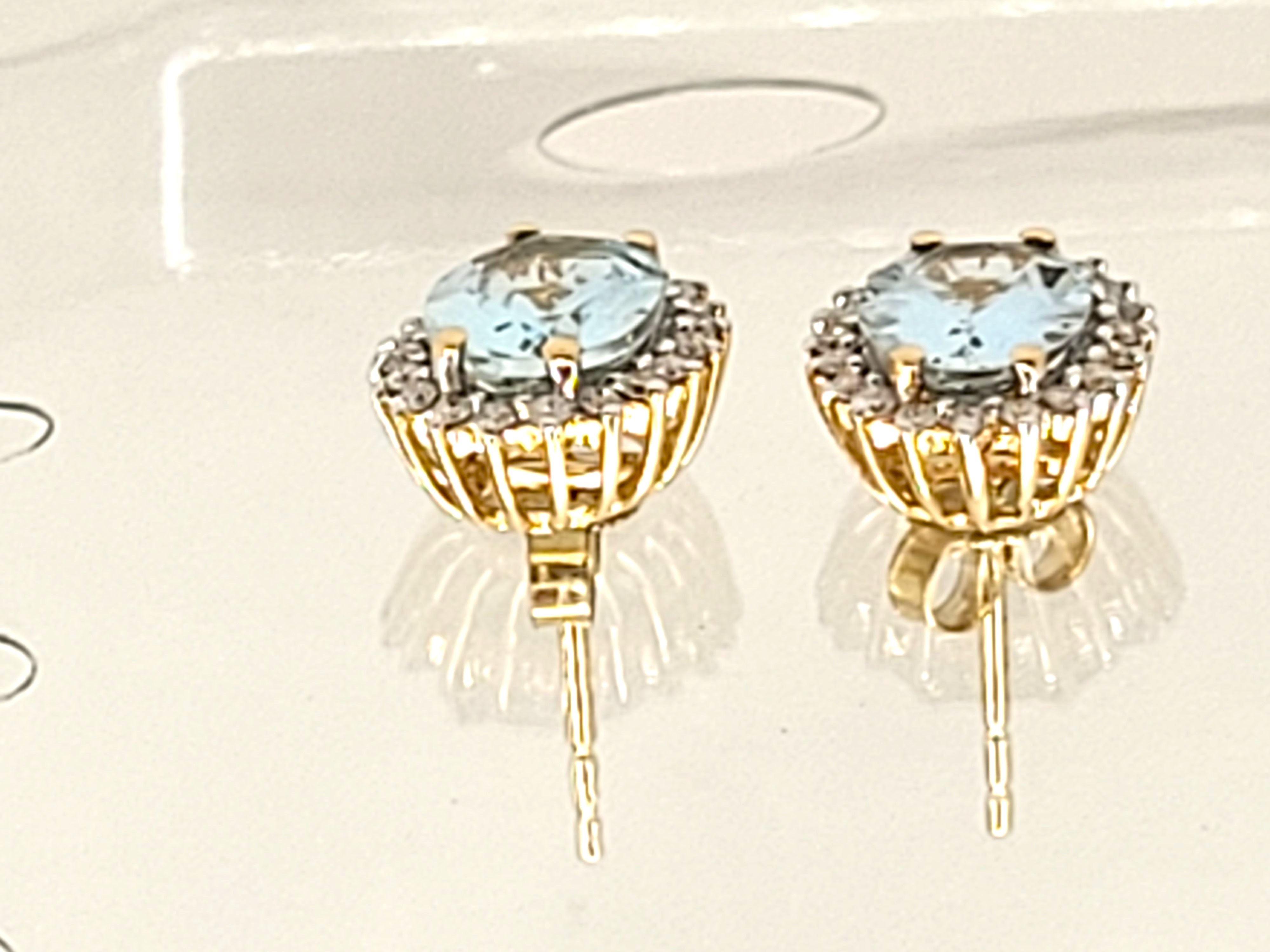 These 14 karat yellow gold earrings feature 2.10 carats total weight of oval-cut, genuine aquamarines that are prong-set in shimmering diamond halos, with a total weight and clarity rating of .26 carats round, brilliant-cut, H-I, SI2-I1. The earrings measure approximately 3/8″ x 1/4″ and attach to the earlobe with posts and friction backs. Admin: Q5743/7-piw