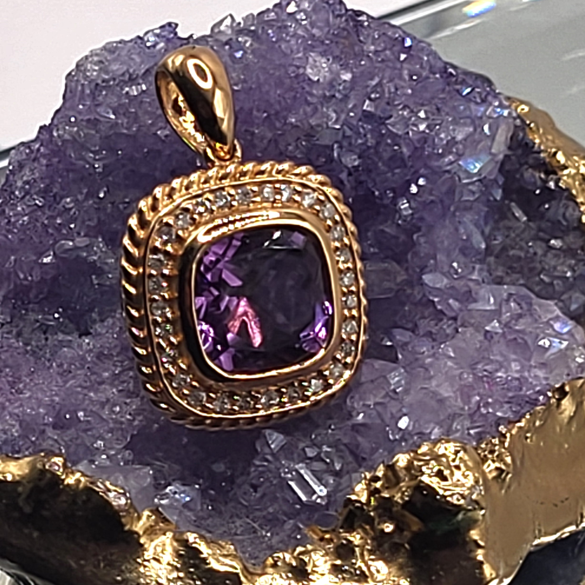 This is a 14 karat yellow gold pendant that features a 3.25 carat cushion-cut, bezel-set, genuine Brazilian amethyst with .16 carats total weight, H-I color, SI2-I1 clarity diamonds in the floating halo. The pendant is 3/4" diameter and has a solid bail that can accommodate up to an approximate 3.25mm chain,
