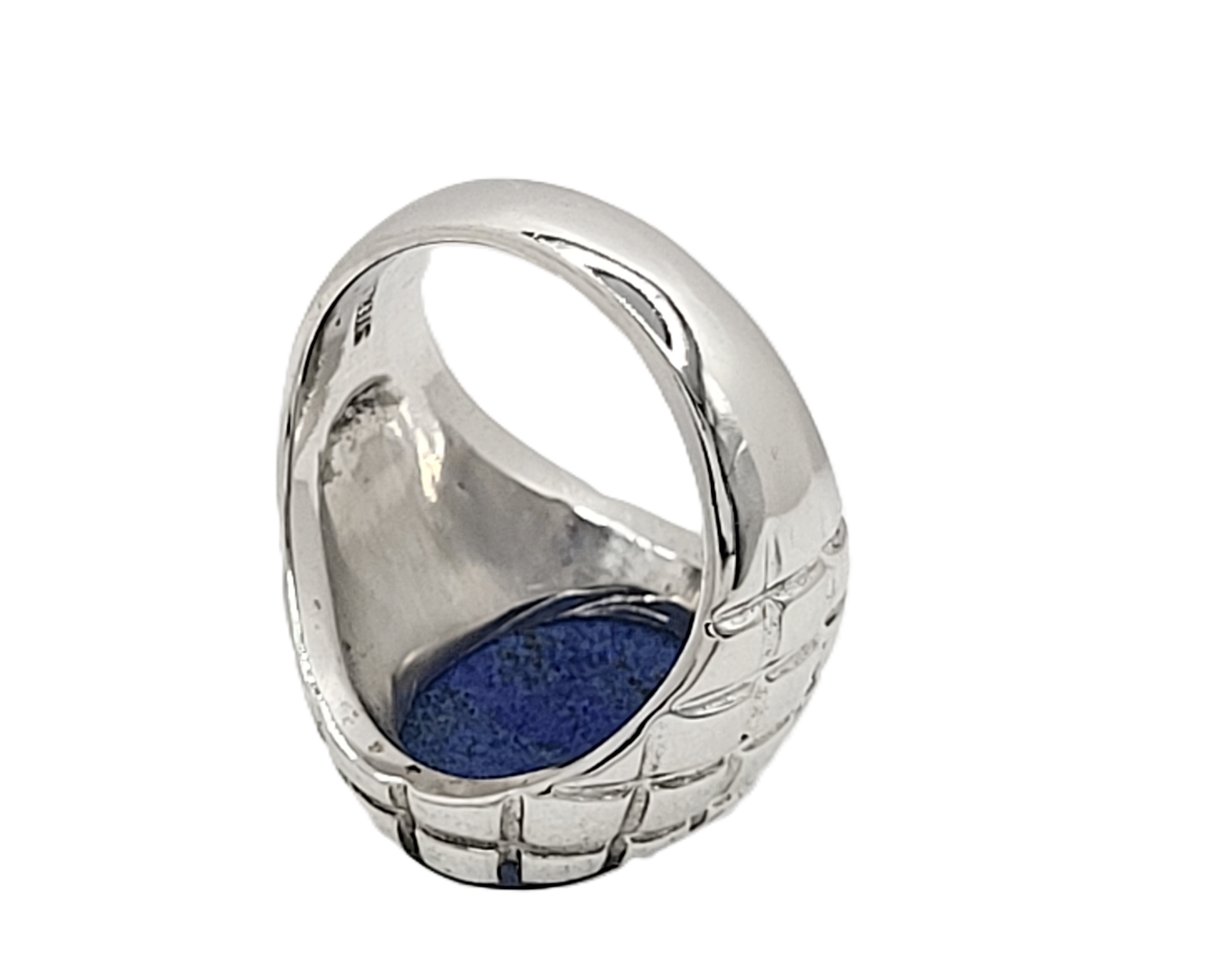 This is a sterling silver man’s ring with an approximate 16mm x 12mm flat, oval, polished slice of denim lapis that is bezel set. The ring is a dome-shaped ring with a raised brick pattern. The ring has an open gallery and is approximately 20mm wide at the top, tapering to a 5 mm solid shank. It is US size 9.5 and can be sized for an additional charge. Please contact Bidfair Fine Jewelry for sizing details. This ring, like many sterling silver jewelry items, may have been manufactured or crafted with a tarnish-resistant protective coating.