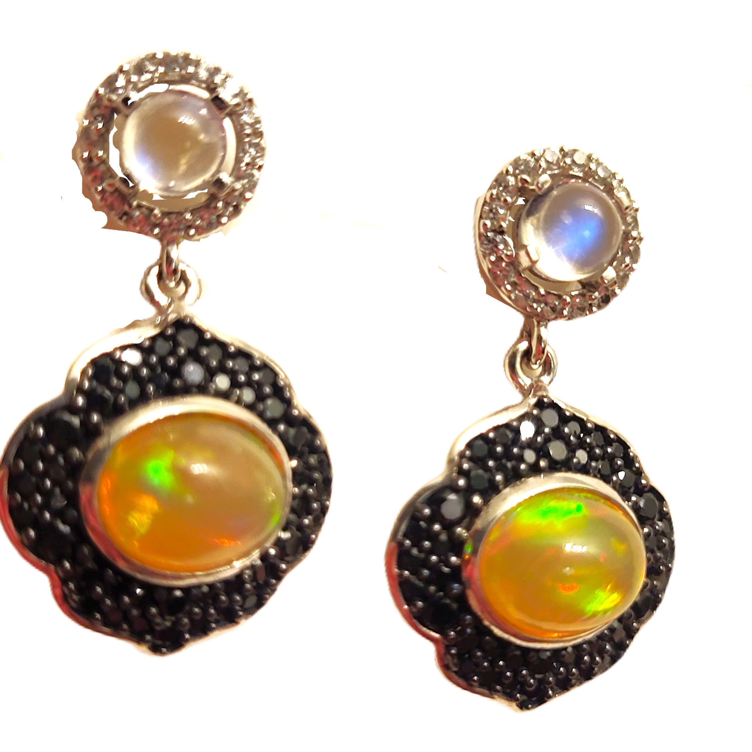 Each earring showcases a round moonstone haloed in white zircon, cascading into a scalloped opal drop framed in black spinel. The interplay of light and shadow evokes celestial mystery—perfect for collectors who crave both elegance and edge. See below for additional details. AdminCode: 6282/32-gr